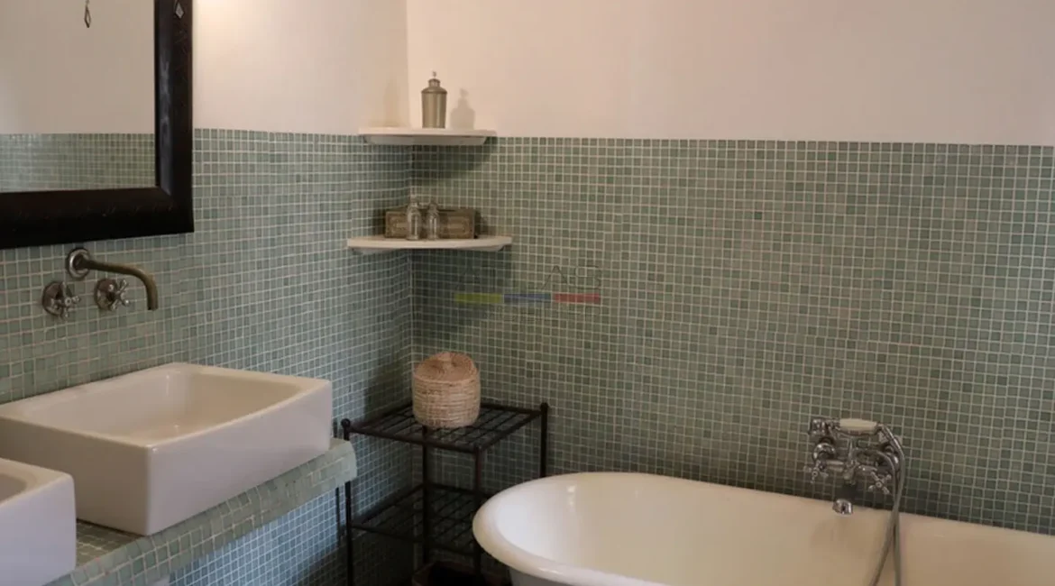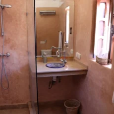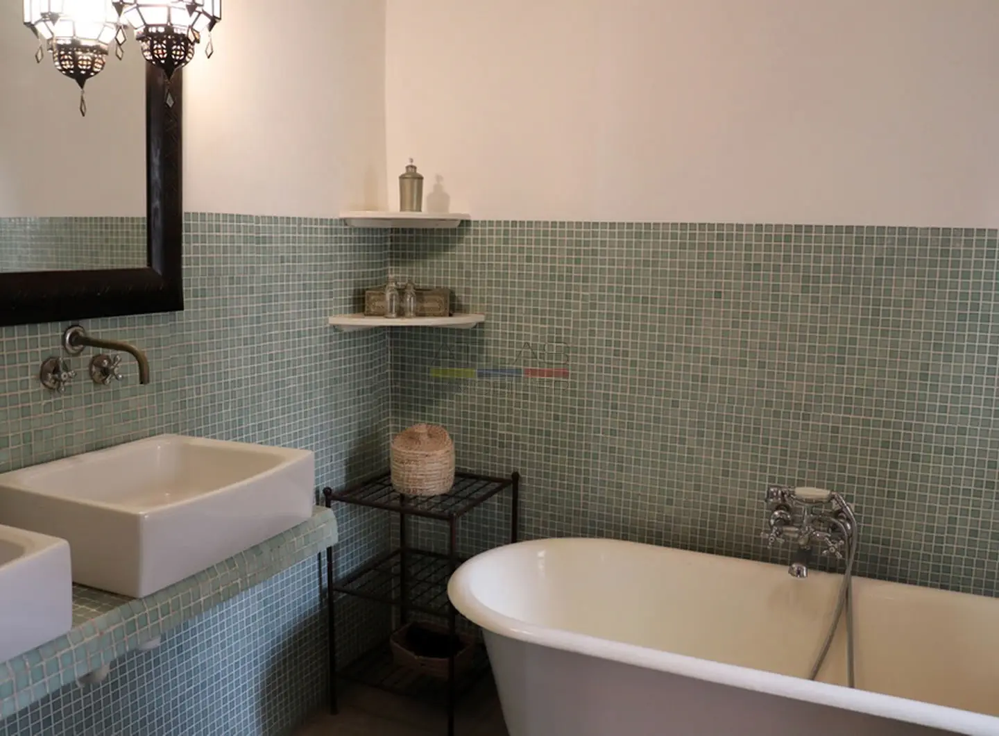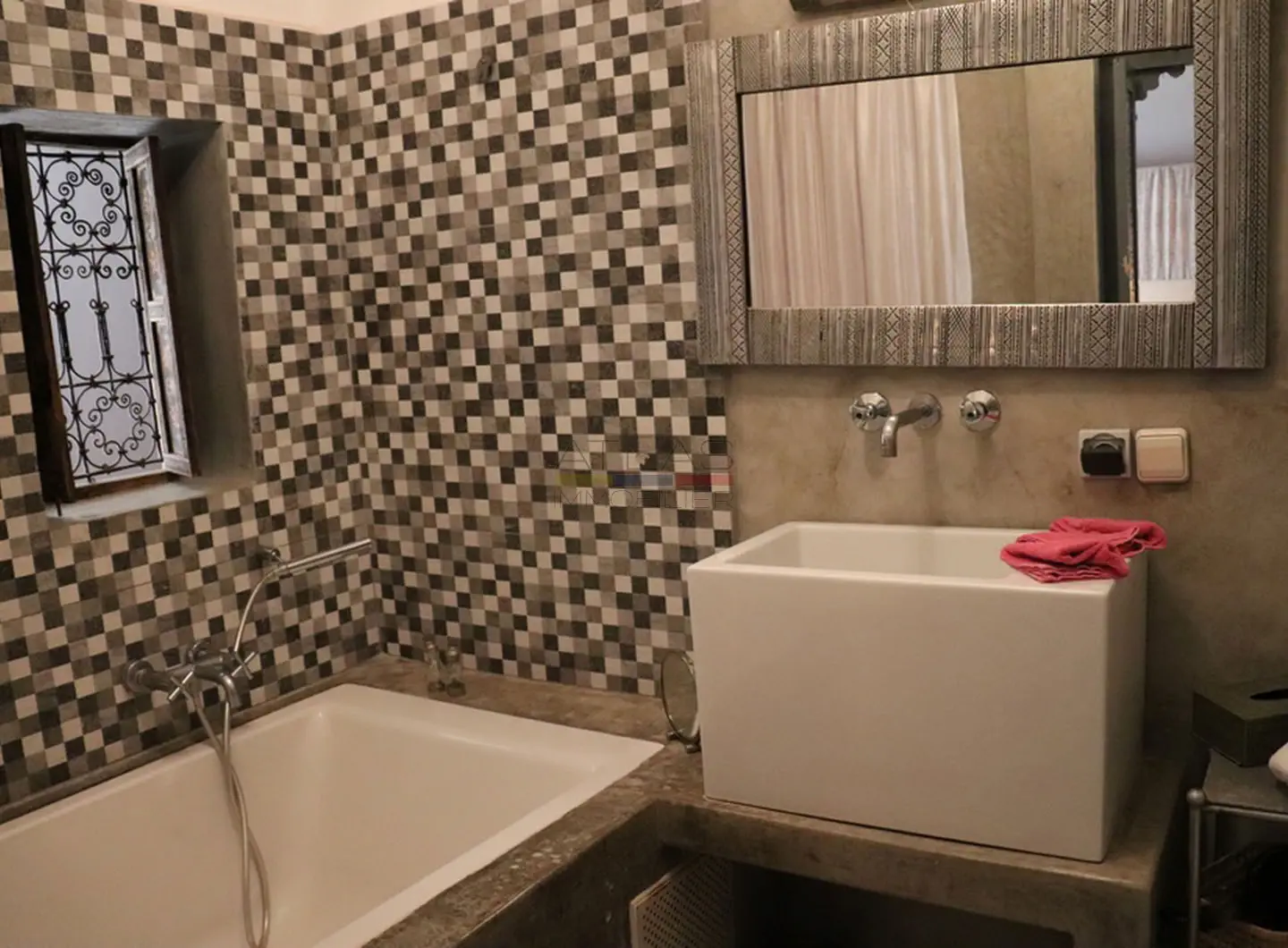 The first floor opened onto an inviting “L”-shaped hall, a reception area and guest toilets. The central patio, embellished by a large swimming pool, offered a relaxing space rare in the medina. The living room and dining room completed the ensemble, with a modern, functional fitted kitchen. A double bedroom with en-suite bathroom ensured comfort and privacy.