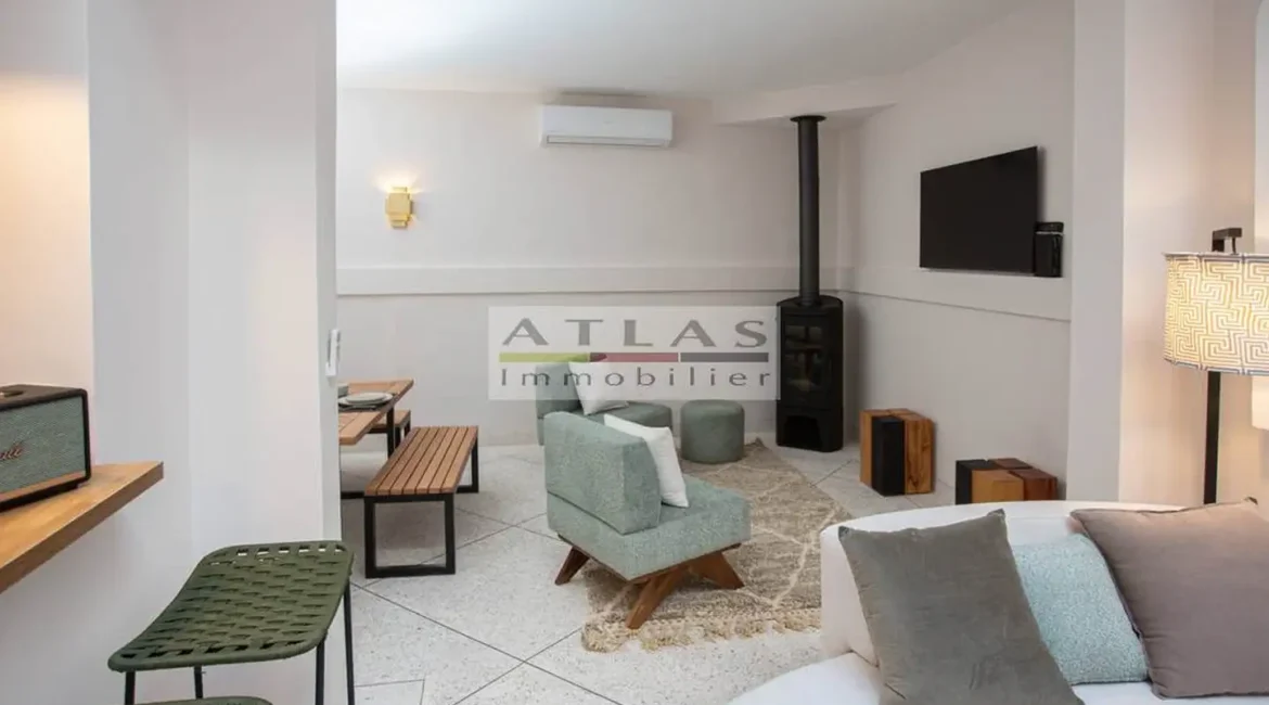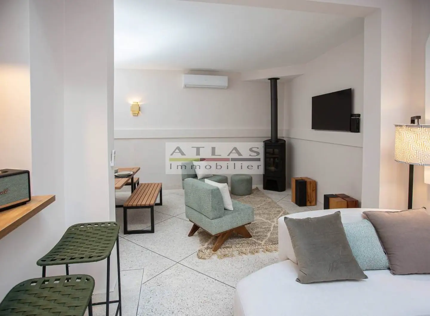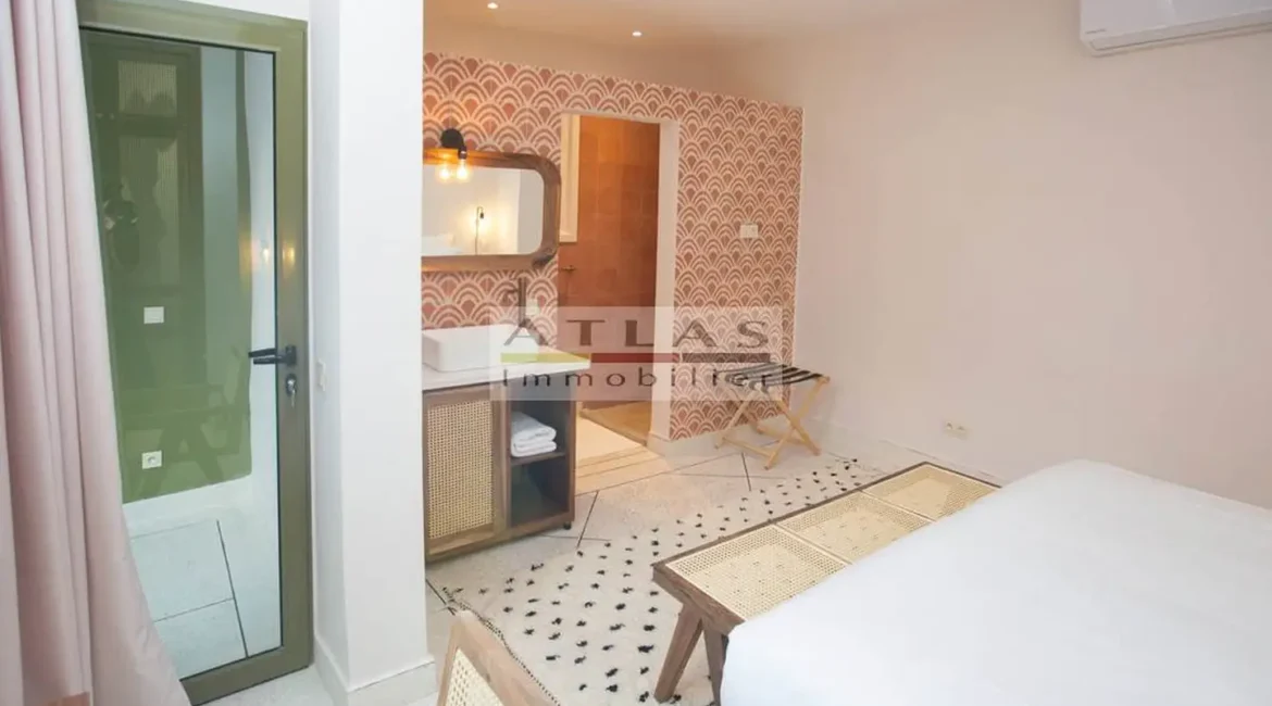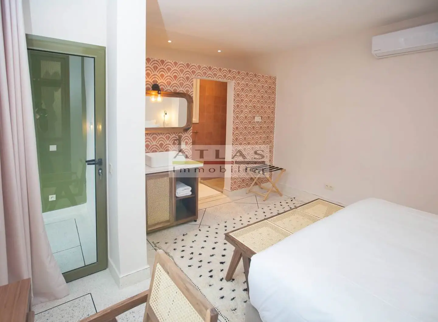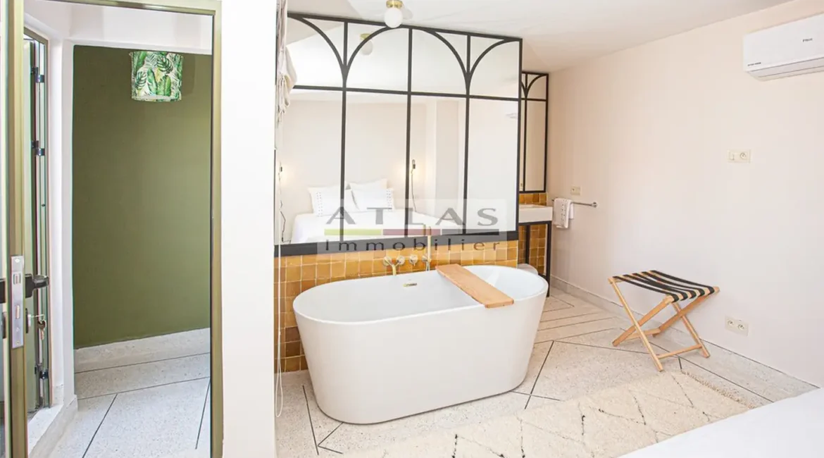With its 150 m² of living space, this renovated riad stood out for its generous volumes and luminosity. From the entrance, visitors were greeted by a toilet and shower area, before opening onto a luminous patio enhanced by an elegant glass roof. The new, fully-equipped open-plan kitchen opened onto a warm living room, complete with a contemporary wood-burning stove, ideal for winter evenings.