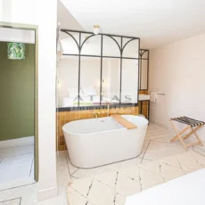 A multi-purpose room completed the first floor, offering multiple uses: office, library or additional bedroom. Upstairs, two double suites each boasted private shower rooms, one of which was enhanced by a dressing room. New, high-quality bedding added a remarkable touch of comfort. The terrace, a real living space, was home to a third suite with bathroom and bathtub, as well as a summer kitchen, a convivial dining area, a belvedere and an unoverlooked solarium.