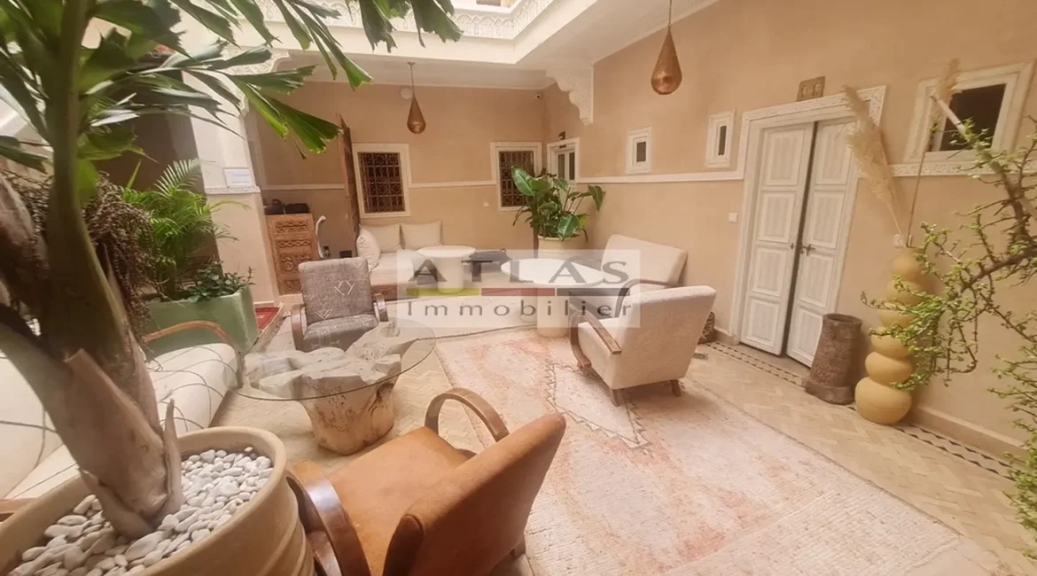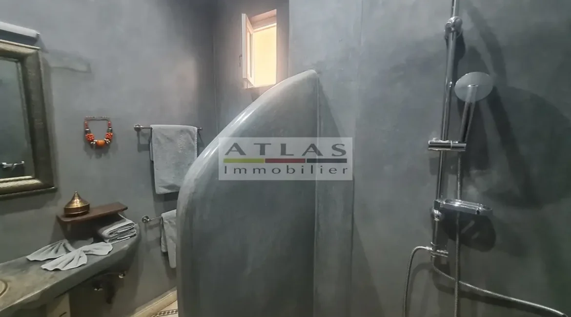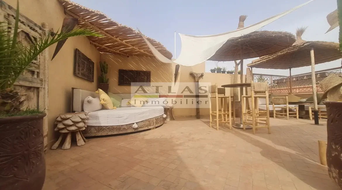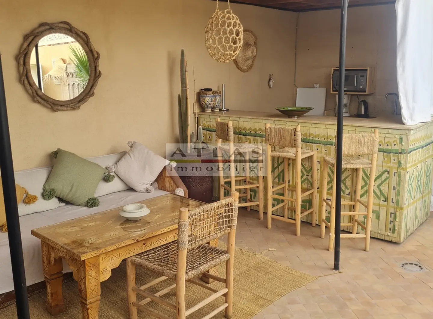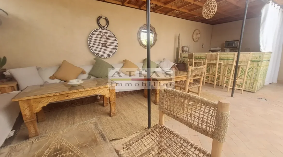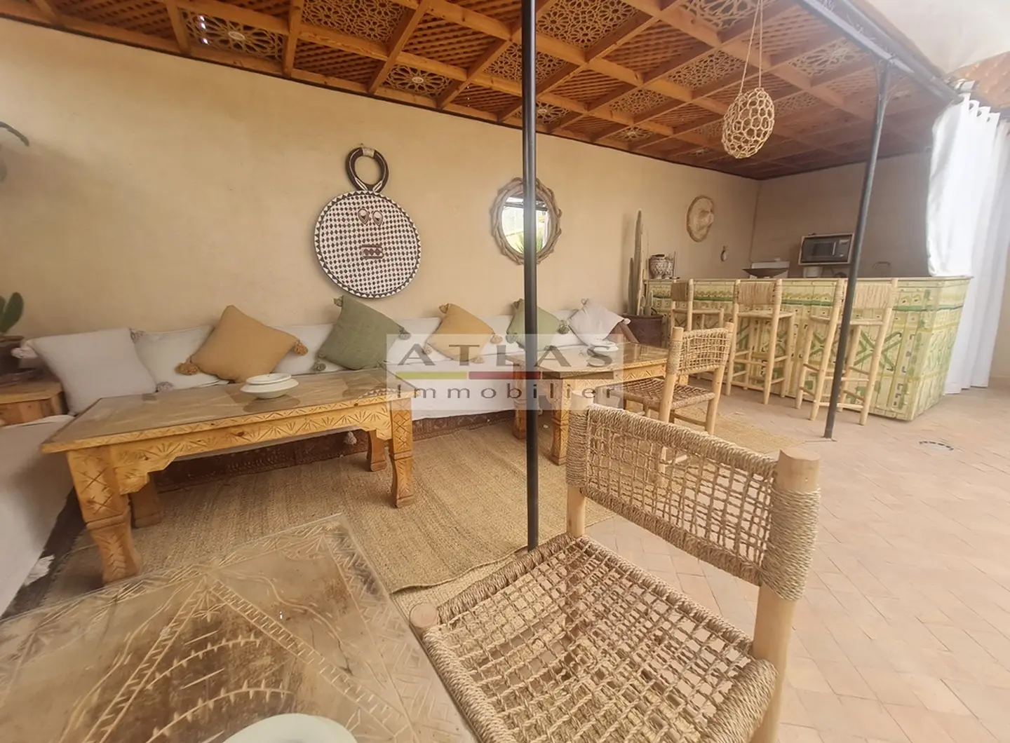Upstairs, three light-filled bedrooms with en-suite bathrooms complete the ensemble, while the terrace offers a solarium, a lounge under a pergola, a summer kitchen-bar and an unobstructed view of the Atlas Mountains. This property, sold furnished and classified by the Ministry of Tourism, had all the assets for immediate exploitation as a guest house or charming private residence.