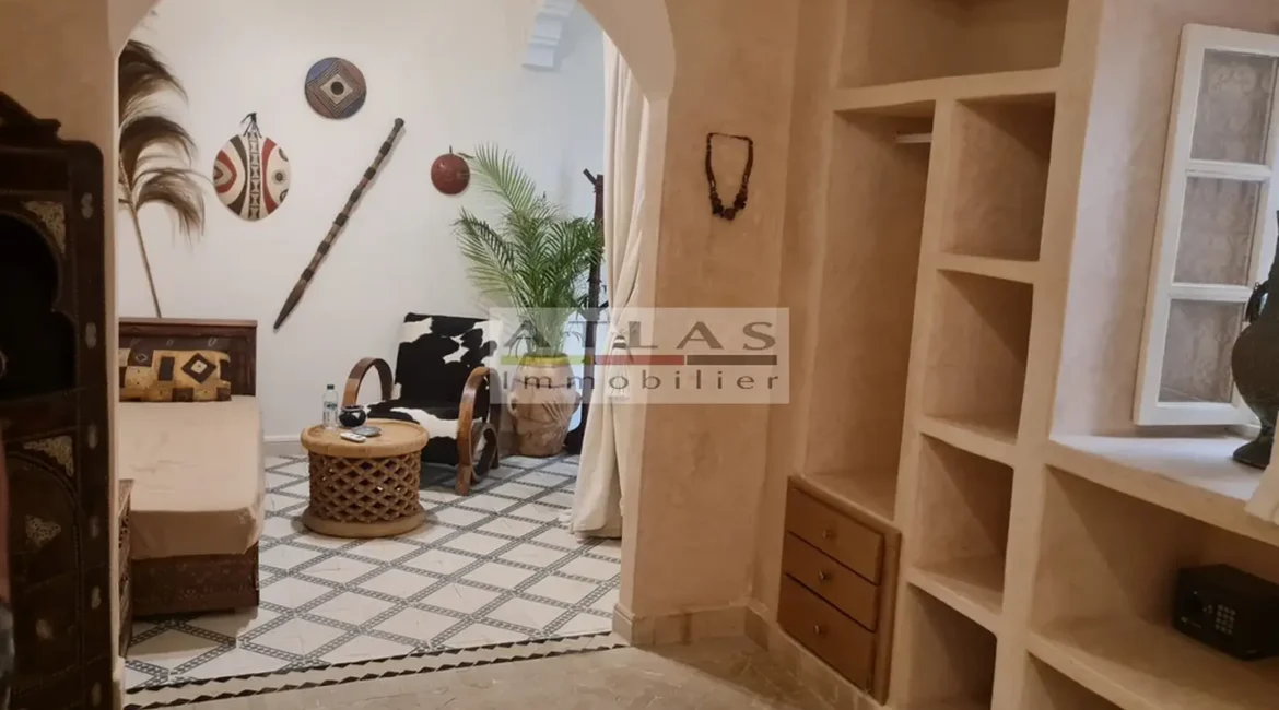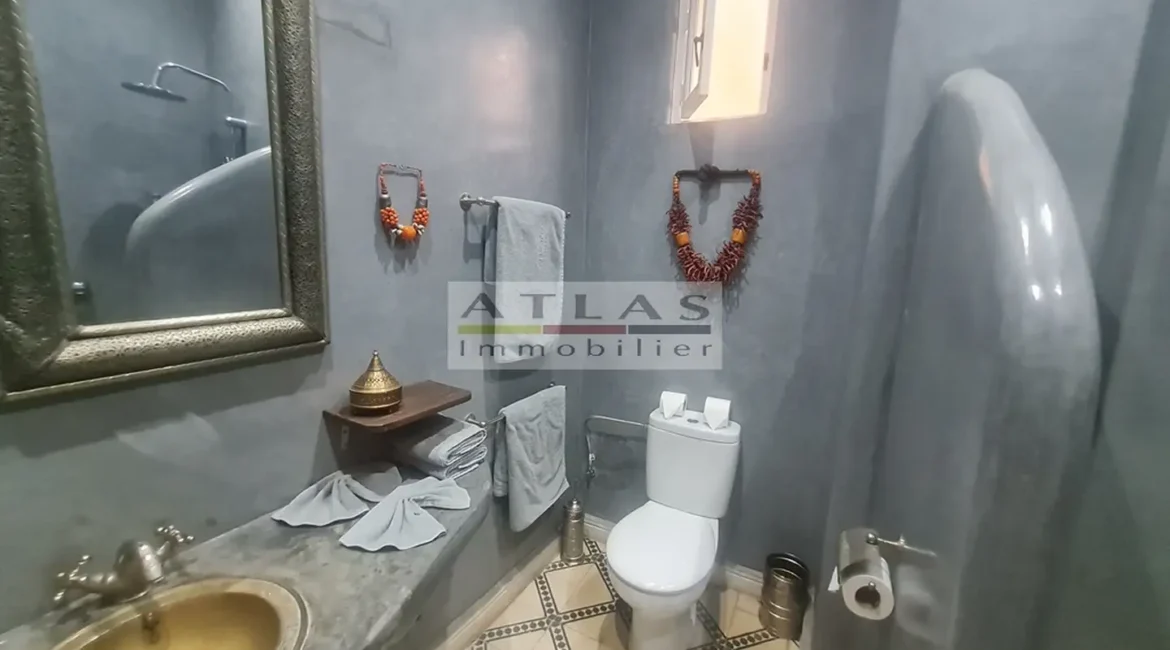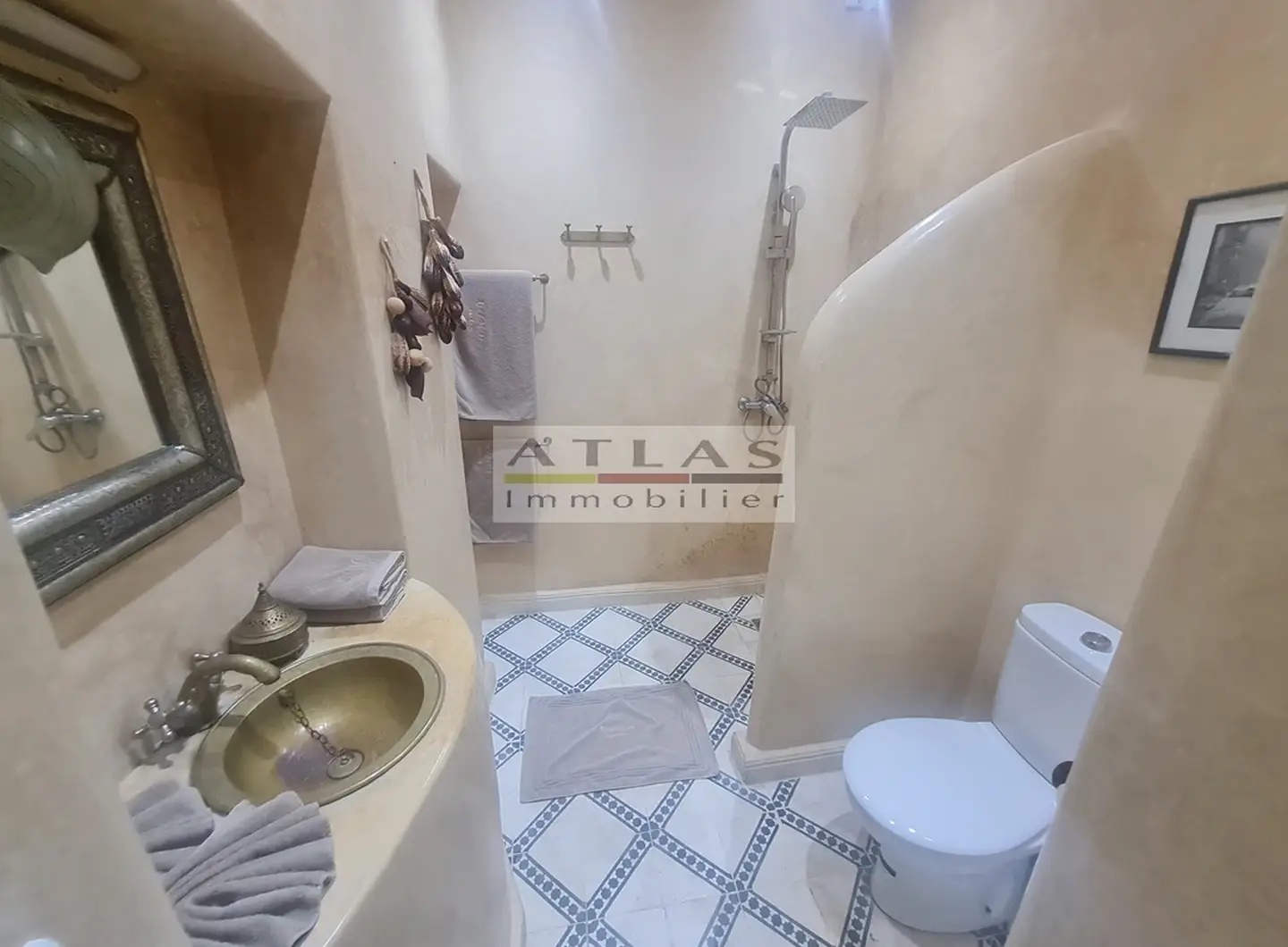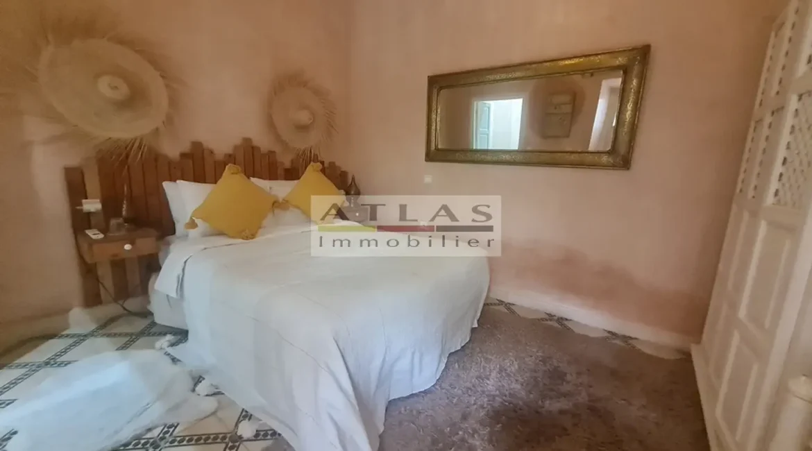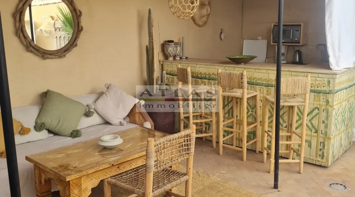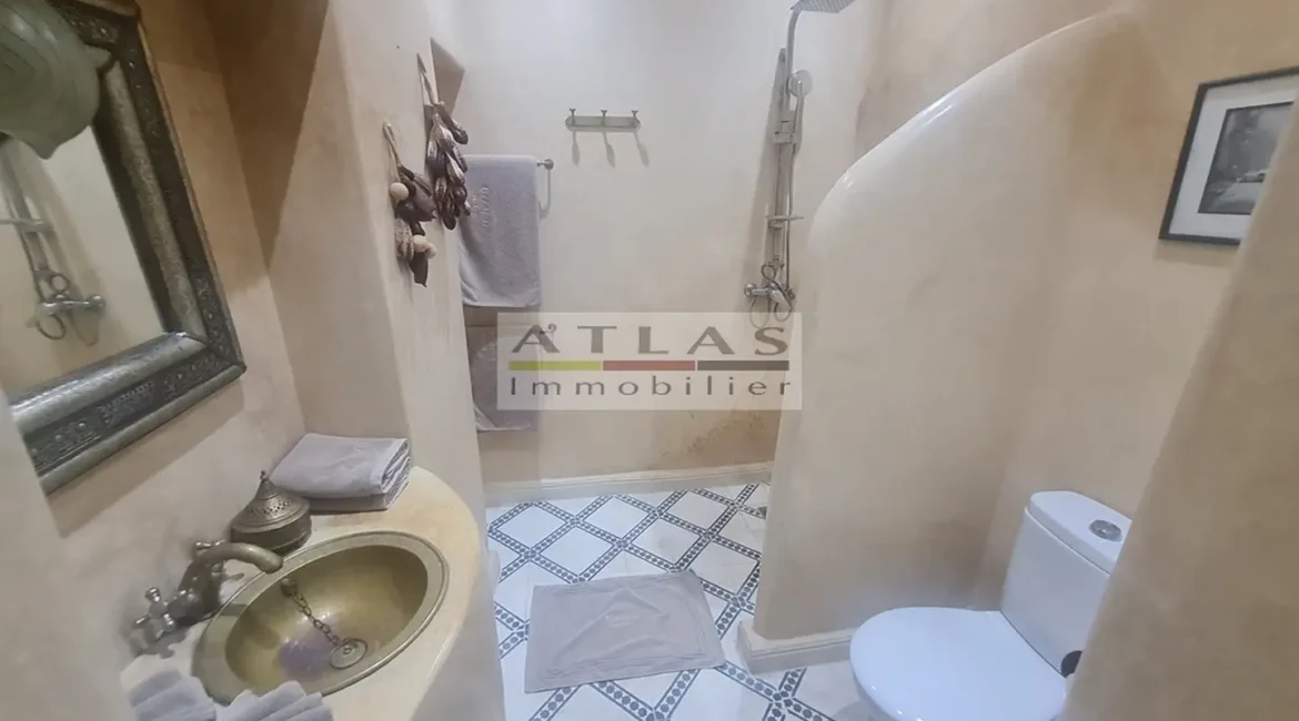 Upstairs, three light-filled bedrooms with en-suite bathrooms complete the ensemble, while the terrace offers a solarium, a lounge under a pergola, a summer kitchen-bar and an unobstructed view of the Atlas Mountains. This property, sold furnished and classified by the Ministry of Tourism, had all the assets for immediate exploitation as a guest house or charming private residence.