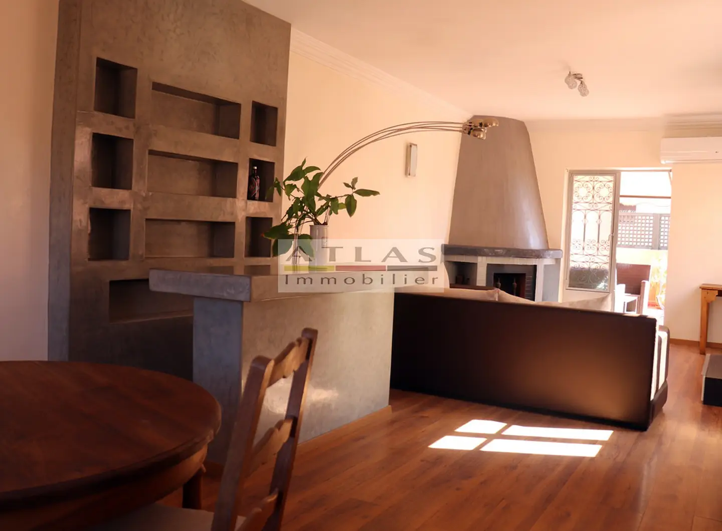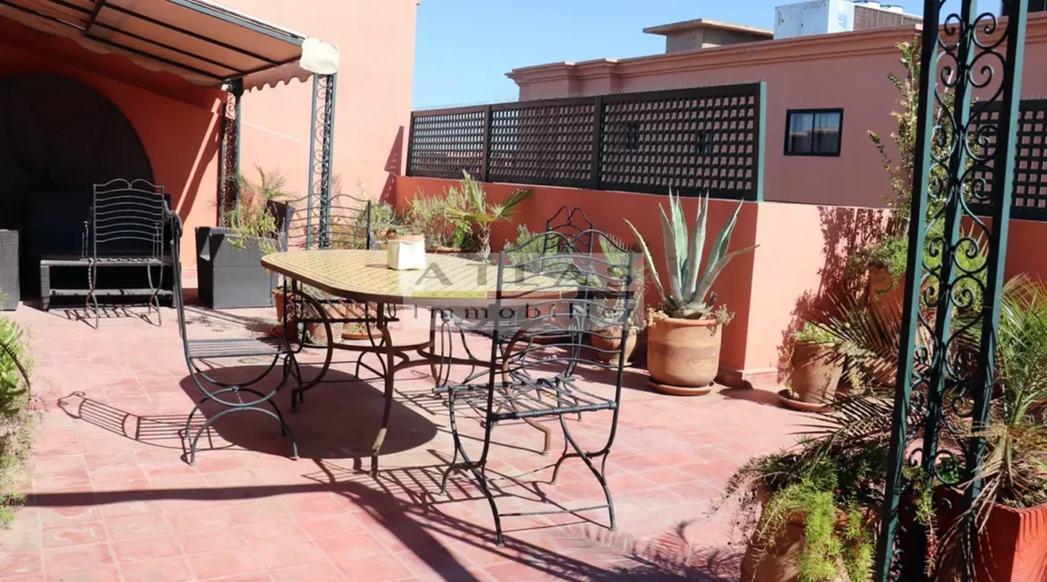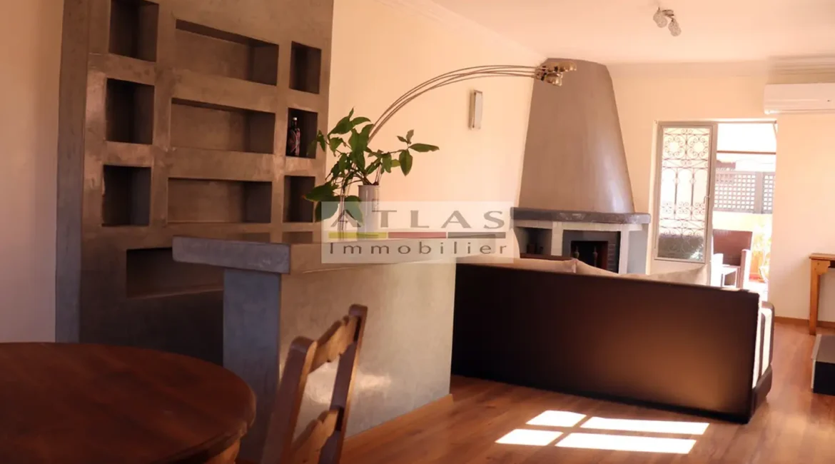 Appartement à proximité gare de Marrakech, appartement avec terrasse, dernier étage, appartement climatisé, appartement à louer à Marrakech, bien atypique, appartement meublé à louer, location rapide, agence immobilière Marrakech, appartement moderne avec cheminée, immobilier Marrakech