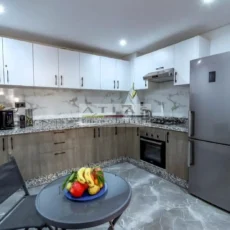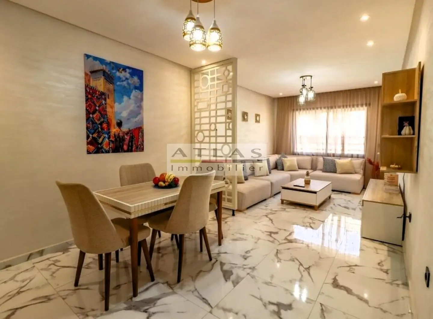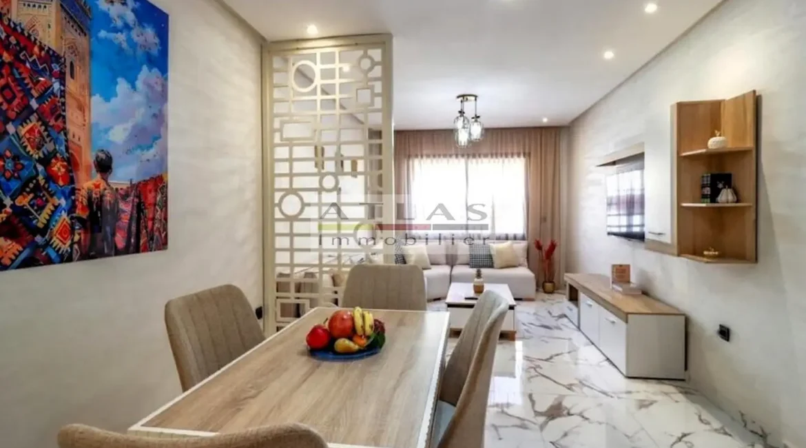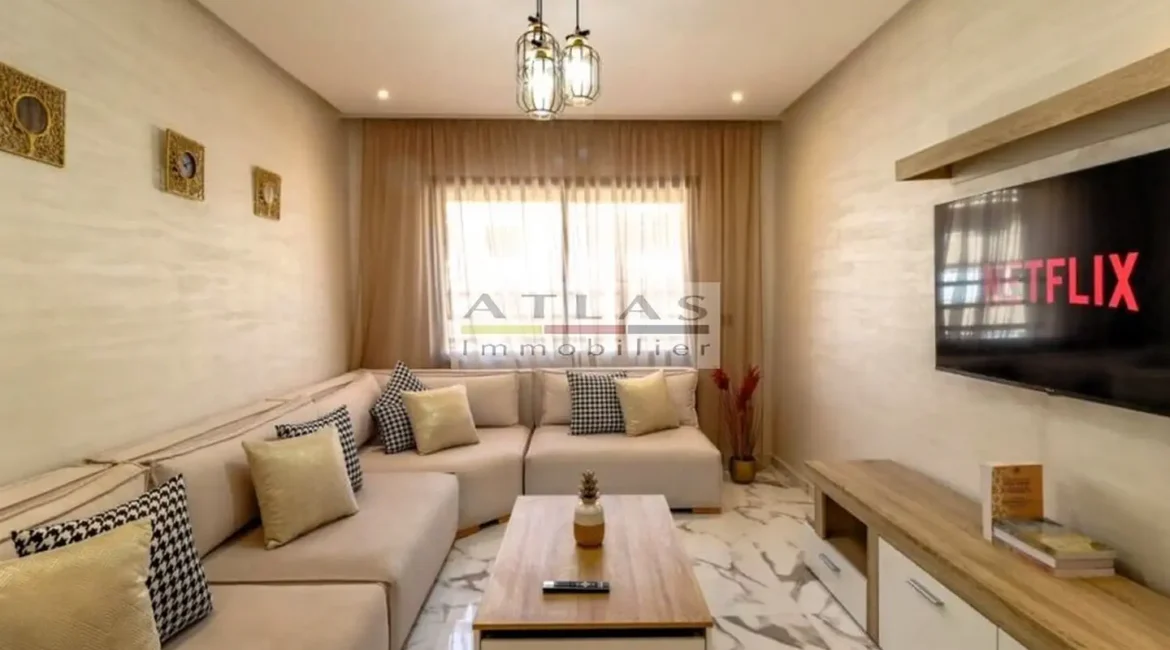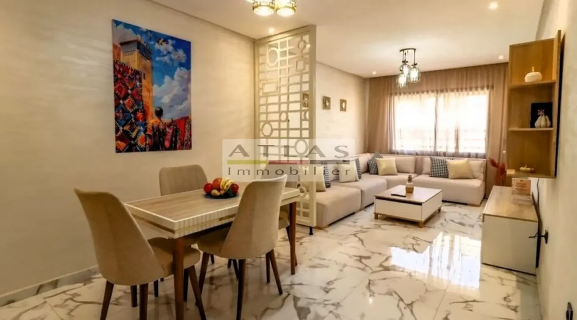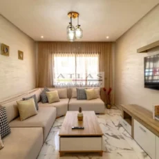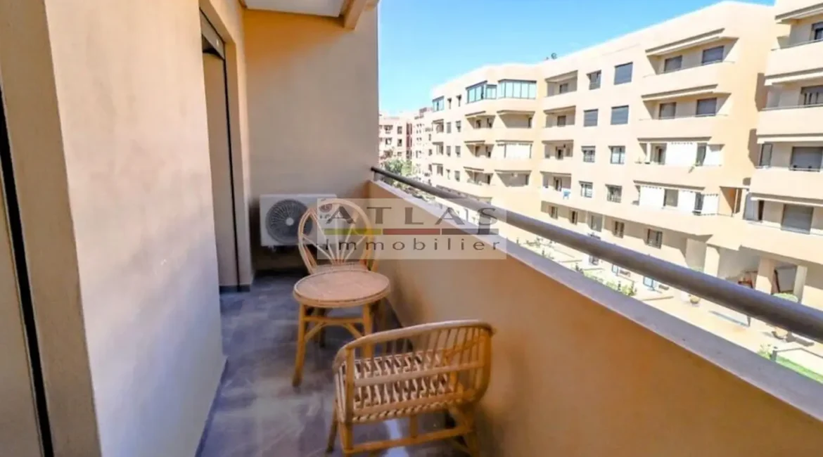 Son intérieur lumineux s’articule autour d’un vaste salon ouvrant sur une terrasse agréable, idéale pour savourer les douces soirées de Marrakech. Il comprend deux chambres spacieuses avec rangements intégrés, dont une suite parentale, ainsi qu’une salle de bain indépendante pour la seconde chambre. La cuisine, moderne et entièrement équipée, dispose d’un espace arrière-cuisine extérieur pour plus de praticité.
