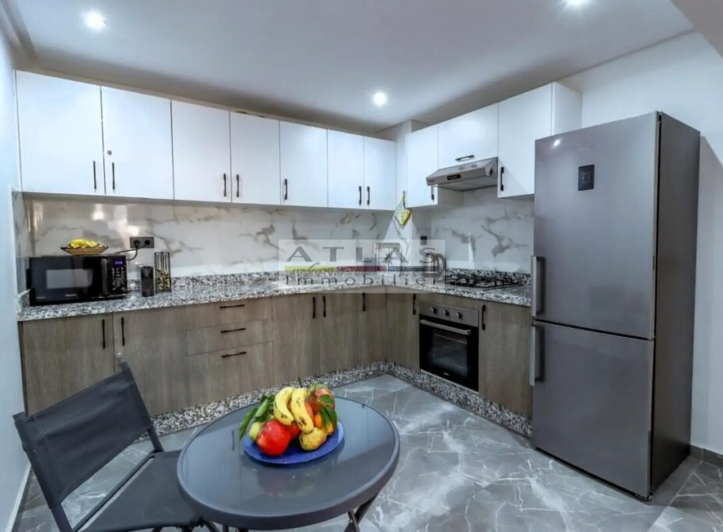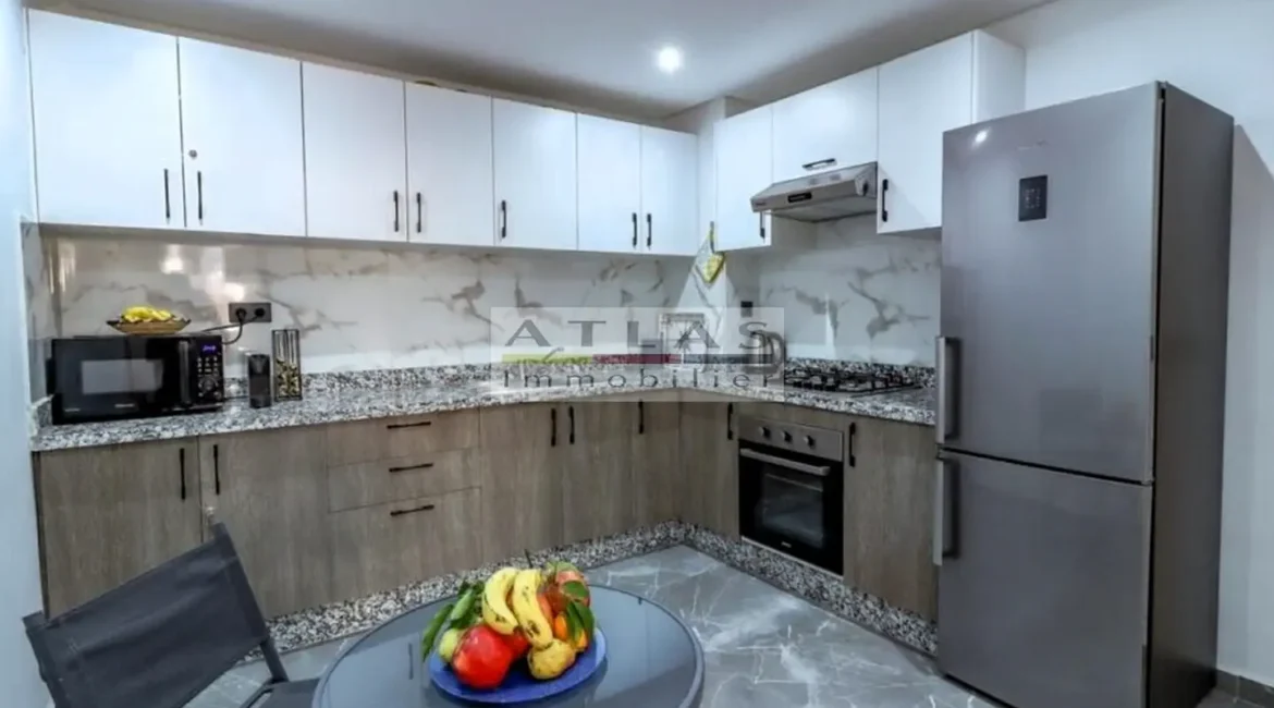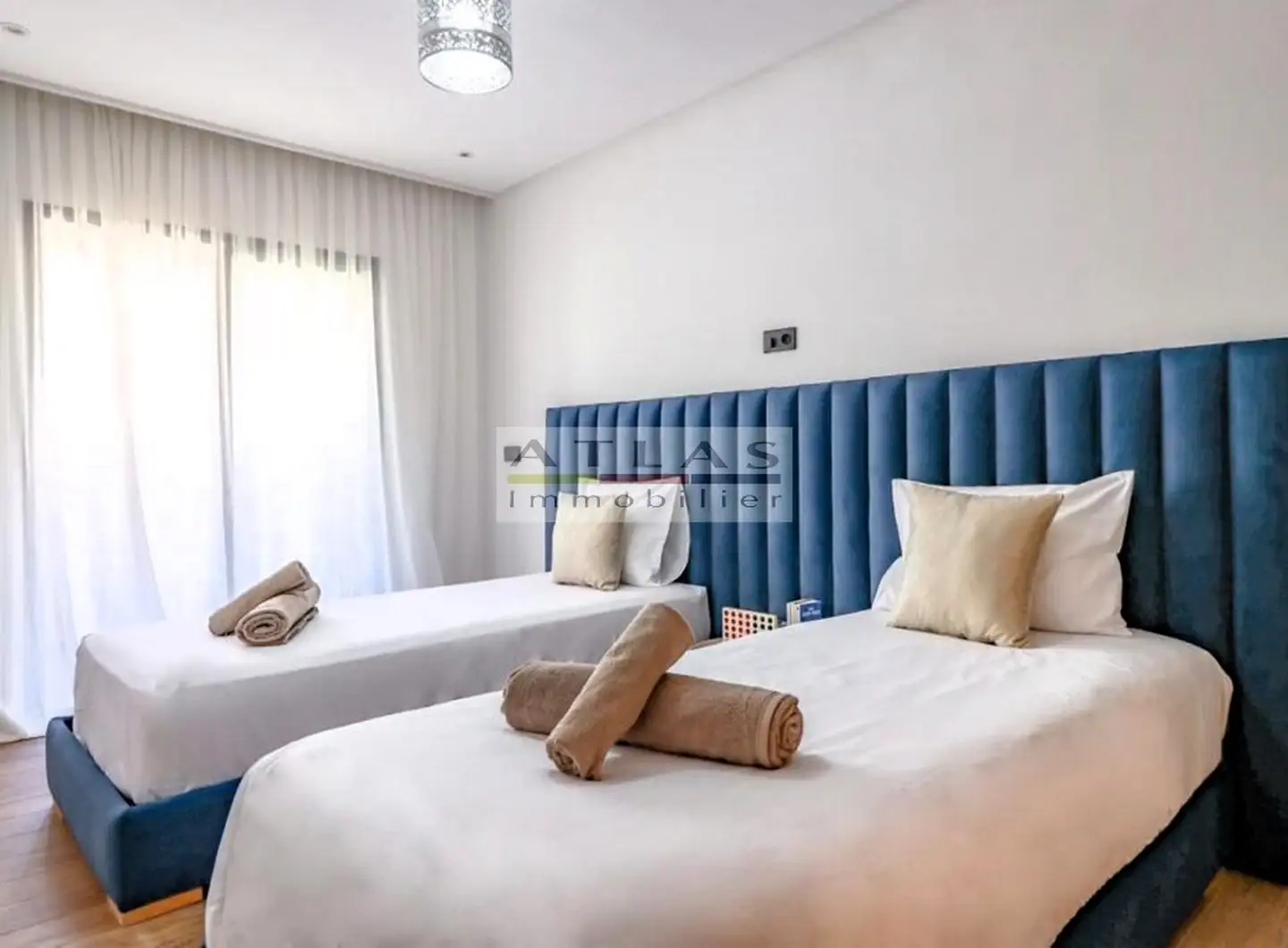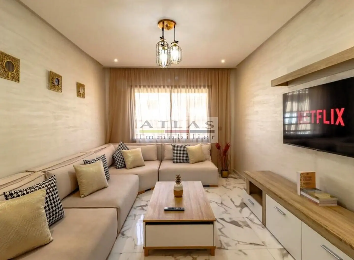 Son intérieur lumineux s’articule autour d’un vaste salon ouvrant sur une terrasse agréable, idéale pour savourer les douces soirées de Marrakech. Il comprend deux chambres spacieuses avec rangements intégrés, dont une suite parentale, ainsi qu’une salle de bain indépendante pour la seconde chambre. La cuisine, moderne et entièrement équipée, dispose d’un espace arrière-cuisine extérieur pour plus de praticité.