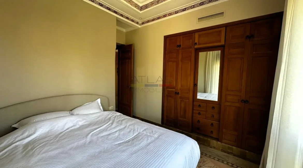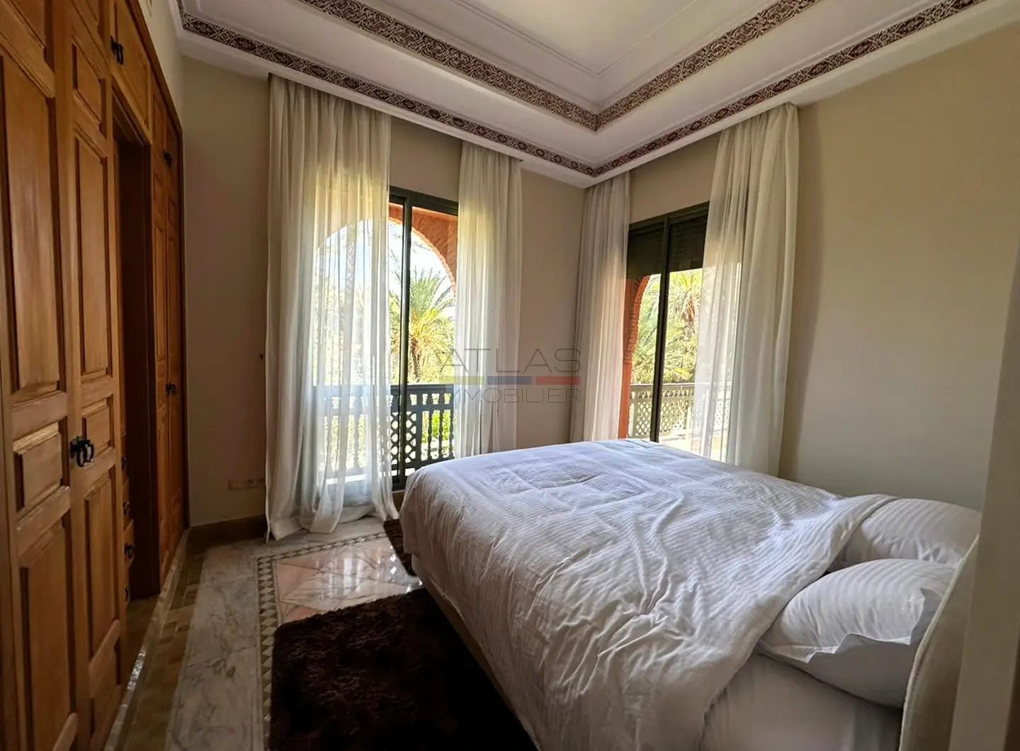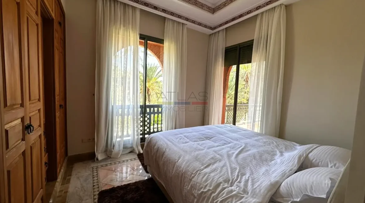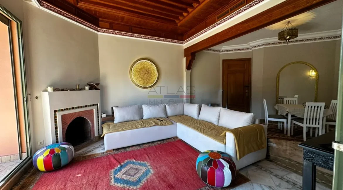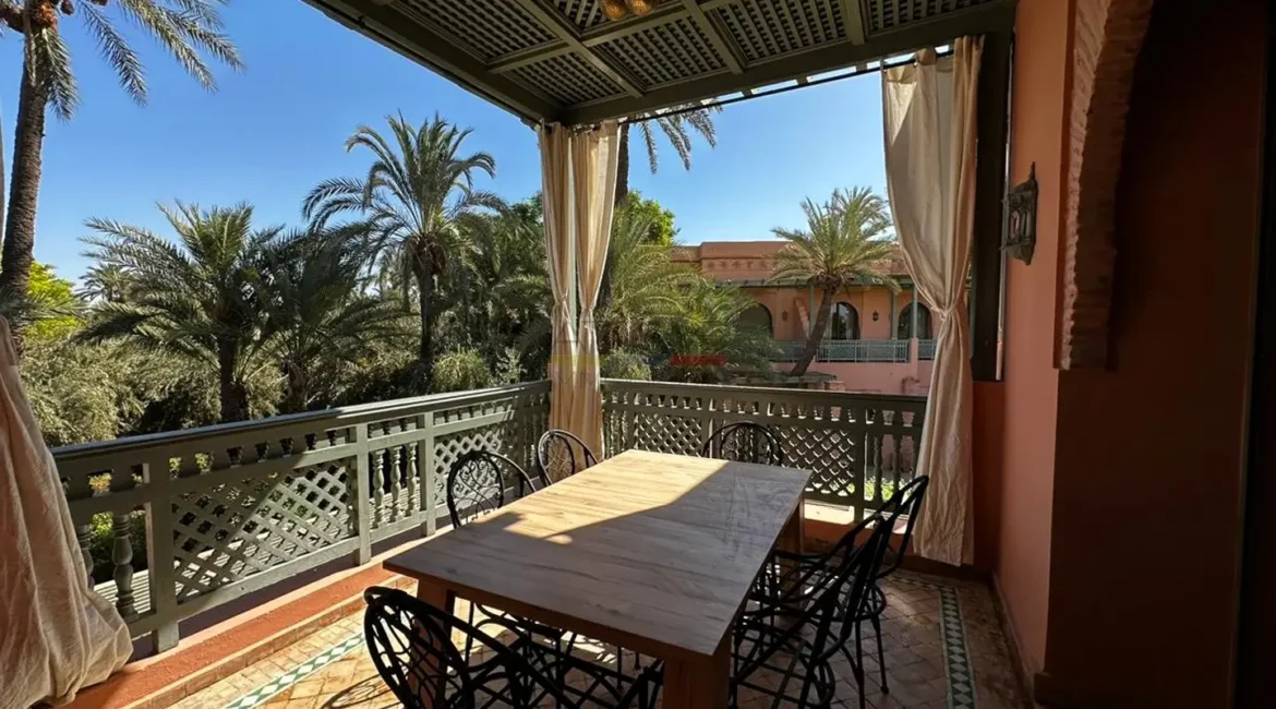 Situé dans l’une des résidences les plus prisées et sécurisées de la Palmeraie de Marrakech, cet élégant appartement séduit par sa luminosité, ses volumes généreux et son environnement verdoyant d’exception. Implanté au premier étage, il offre un cadre de vie paisible et raffiné, à seulement 10 minutes du centre-ville et à proximité immédiate des commerces et services essentiels.