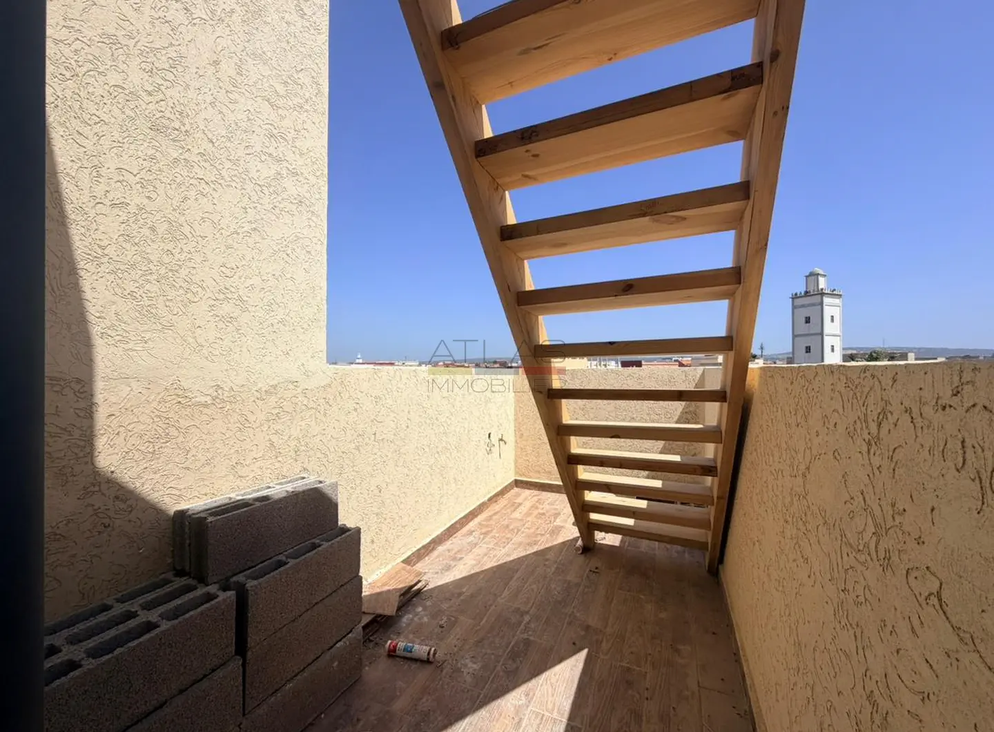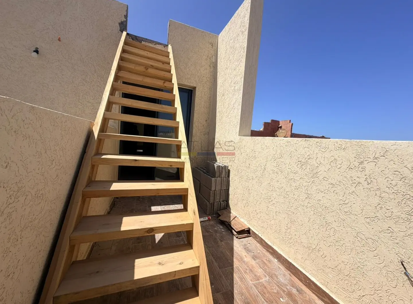 Ce bien se distingue par sa double terrasse, un avantage rare dans le secteur. Une première terrasse vous accueille dès l’espace de vie, prolongée par un escalier menant à une seconde terrasse privative de 39 m², parfaite pour aménager un espace extérieur convivial, profiter du climat ensoleillé d’Essaouira ou recevoir en toute tranquillité.
