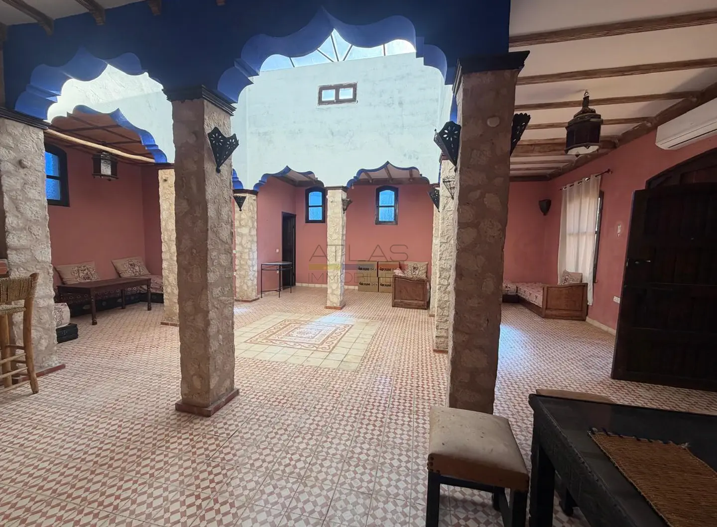 La première maison, d’environ 140 m², propose une atmosphère chaleureuse et fonctionnelle. Elle se compose de trois chambres, d’un grand salon lumineux, d’une cuisine ouverte, d’une salle de douche, d’un WC indépendant et d’une agréable terrasse sur le toit. Elle dispose également d’une réserve d’eau, en complément de l’eau de ville, et d’une piscine privée, idéale pour profiter pleinement du climat de la région d’Essaouira.