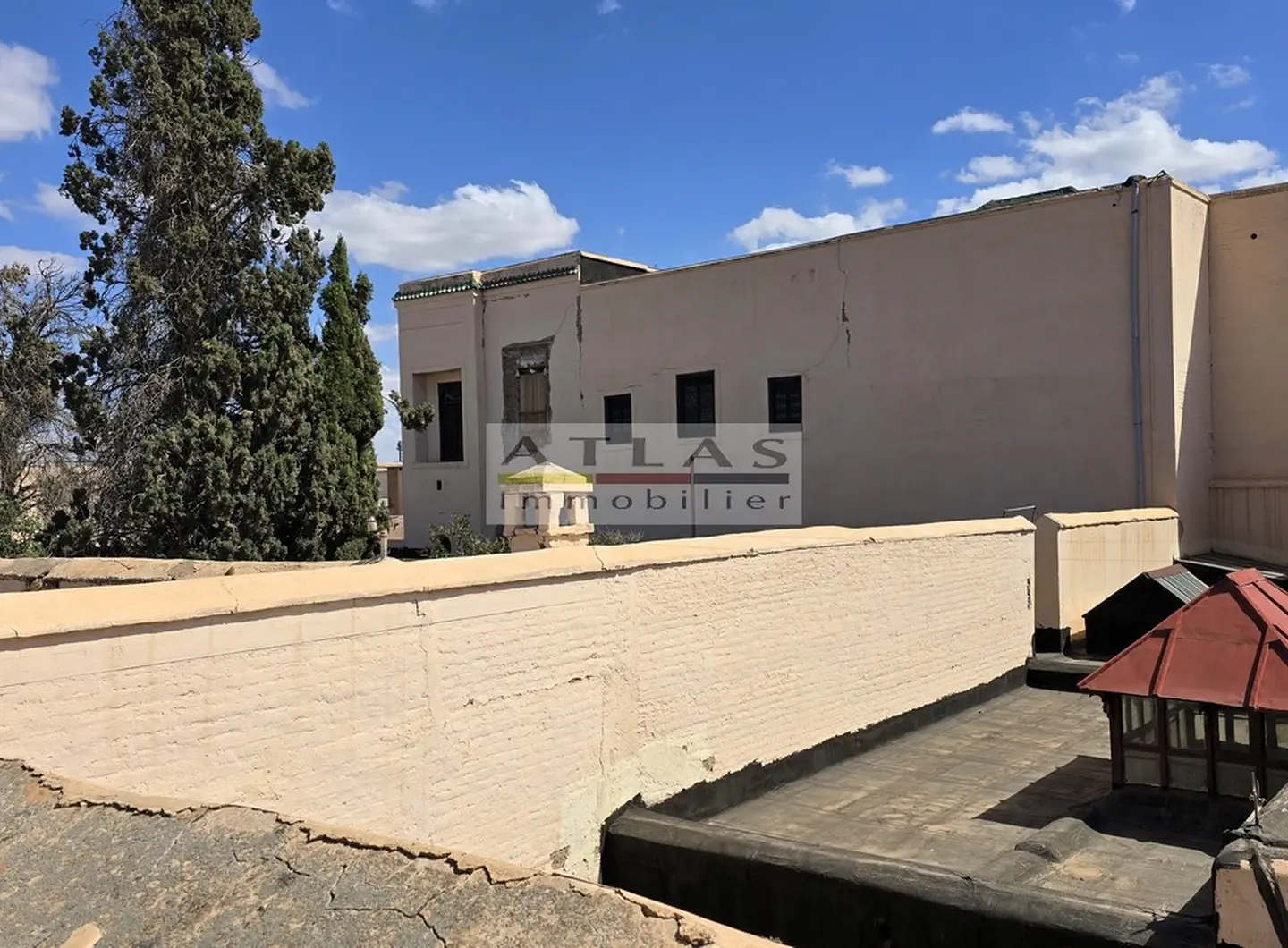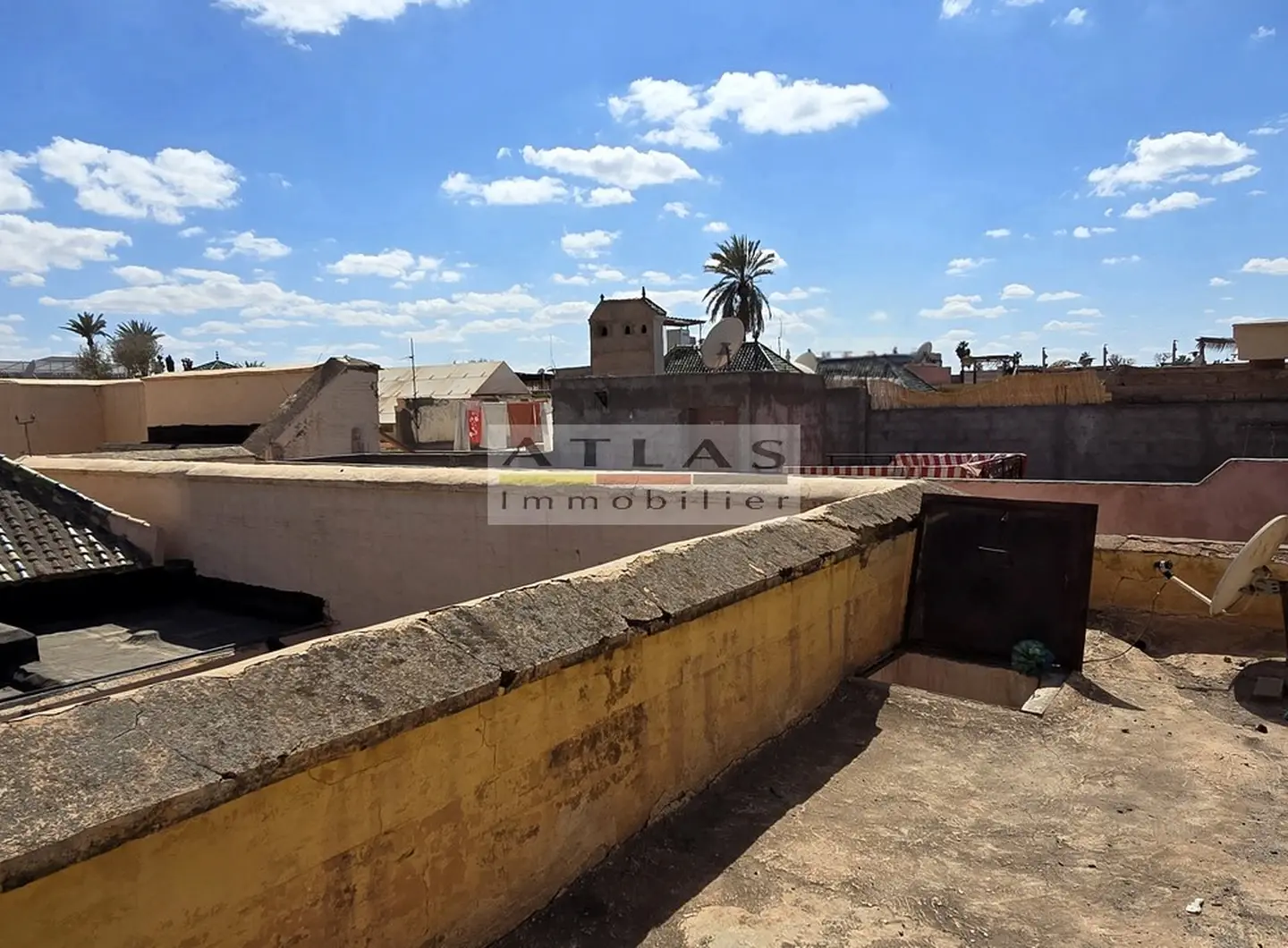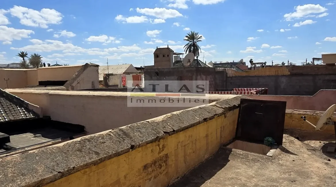 Un accès par échelle mène à une agréable terrasse de 25 m², idéale pour profiter du climat de Marrakech et offrant une vue dégagée sur les toits pittoresques de la médina. Cet espace extérieur constitue un véritable atout pour ce type de bien, parfait pour se détendre ou recevoir en toute intimité.