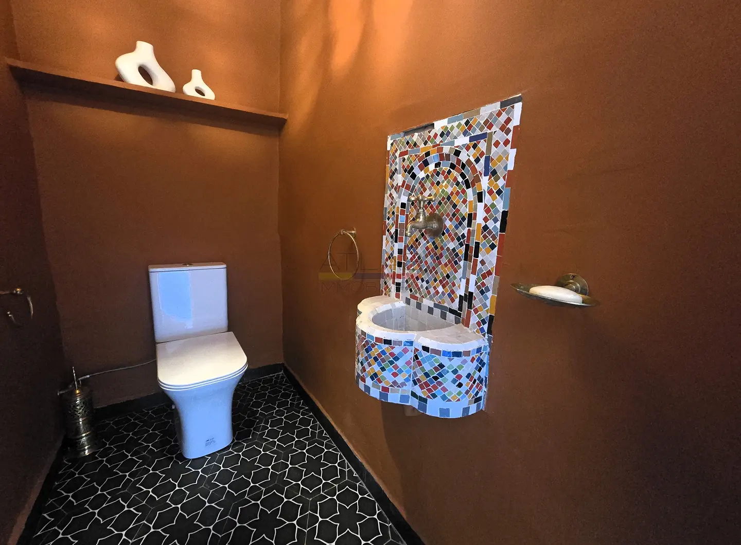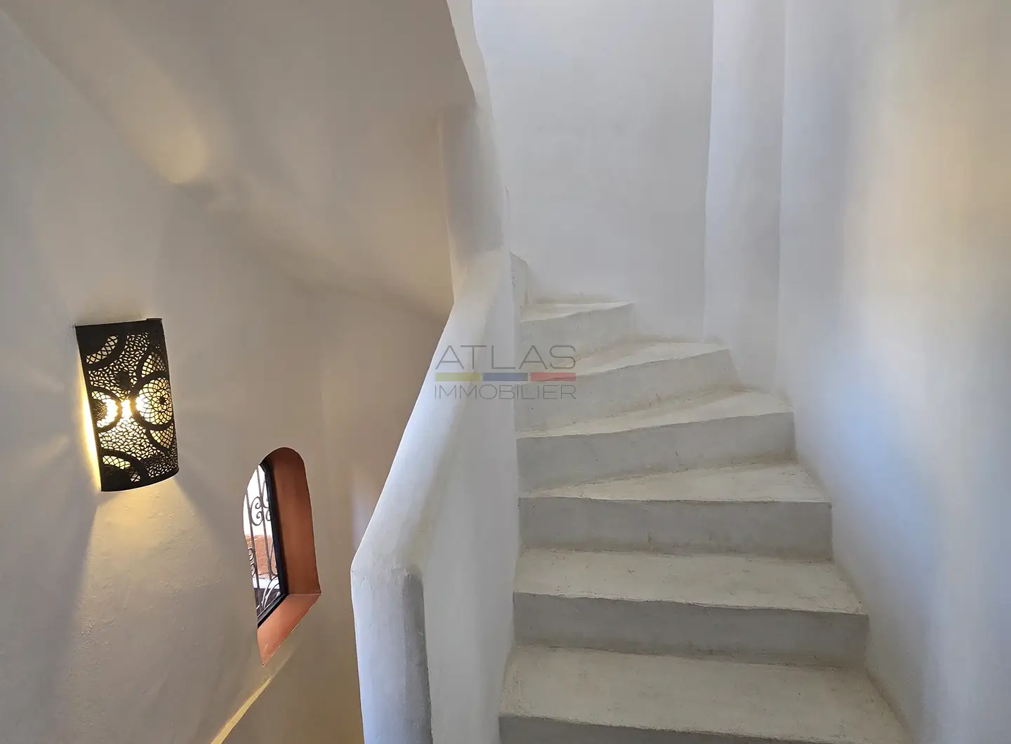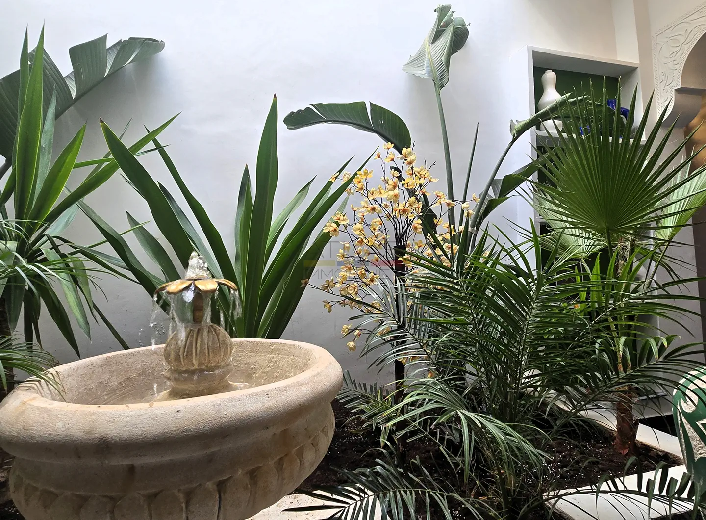 Le rez-de-chaussée s’organise autour d’un patio orné d’une fontaine, véritable cœur du riad. On y trouve un agréable séjour, une première suite avec salle de bain, un hall d’accueil, des toilettes invités, ainsi qu’un office pouvant servir de cuisine d’office pour le service et la réception. L’ensemble dégage une ambiance sereine et intimiste, idéale pour recevoir ou se détendre.