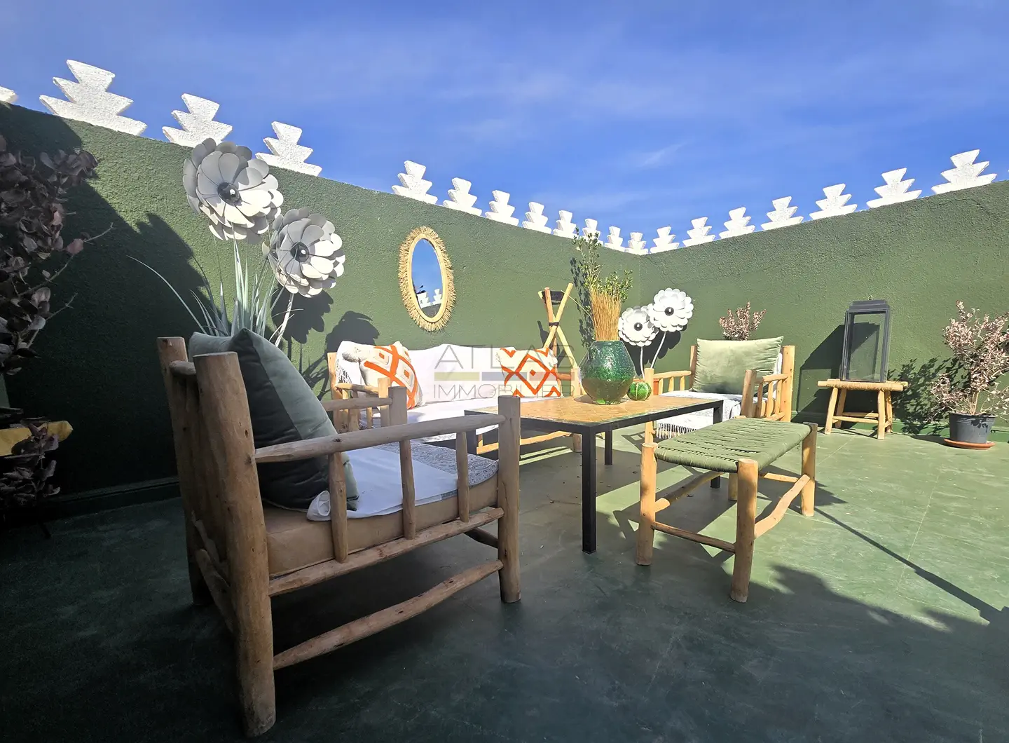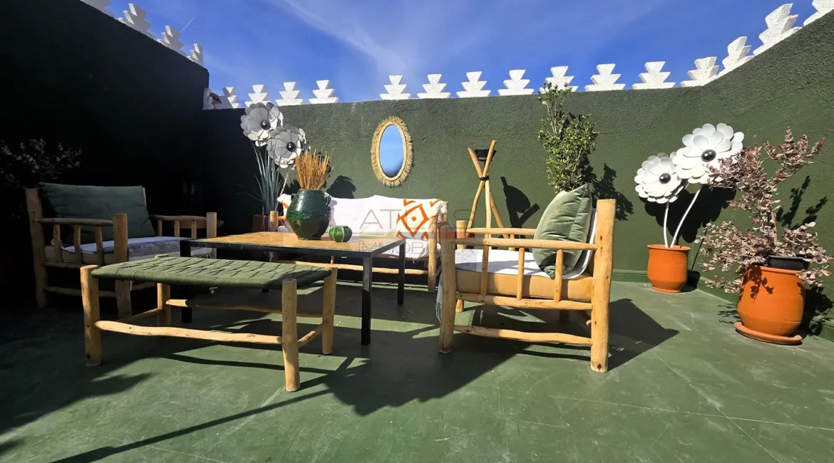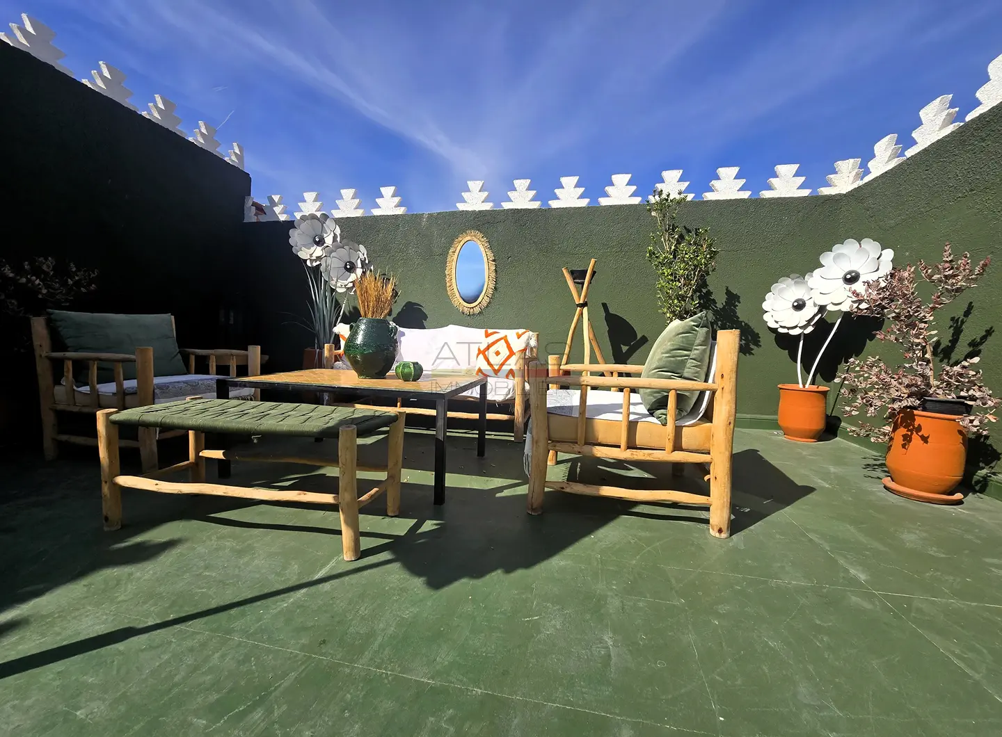 Au niveau supérieur, la cuisine équipée et la salle à manger s’ouvrent directement sur une vaste terrasse décorée et aménagée pour la détente. Véritable prolongement de la maison, cet espace invite à la convivialité et à la contemplation des toits de la médina. Selon l’audace de l’acquéreur et sa maîtrise des usages urbanistiques locaux, il est possible d’y ajouter un jacuzzi, un belvédère dominant la ville ou encore un bassin au cœur du patio. Ces options laissent toute liberté de personnalisation à l’acheteur, pour faire de ce lieu un riad d’exception à son image.