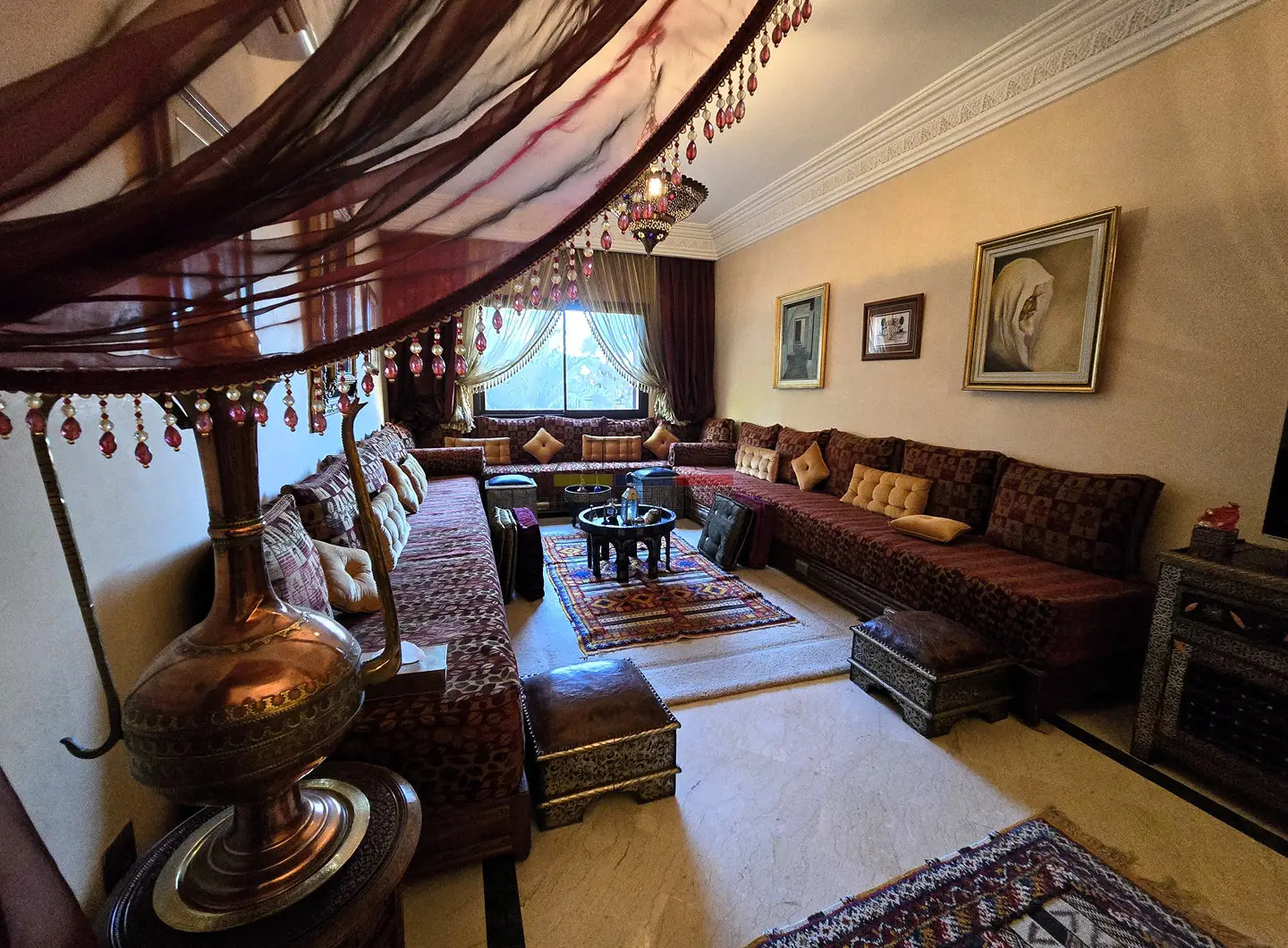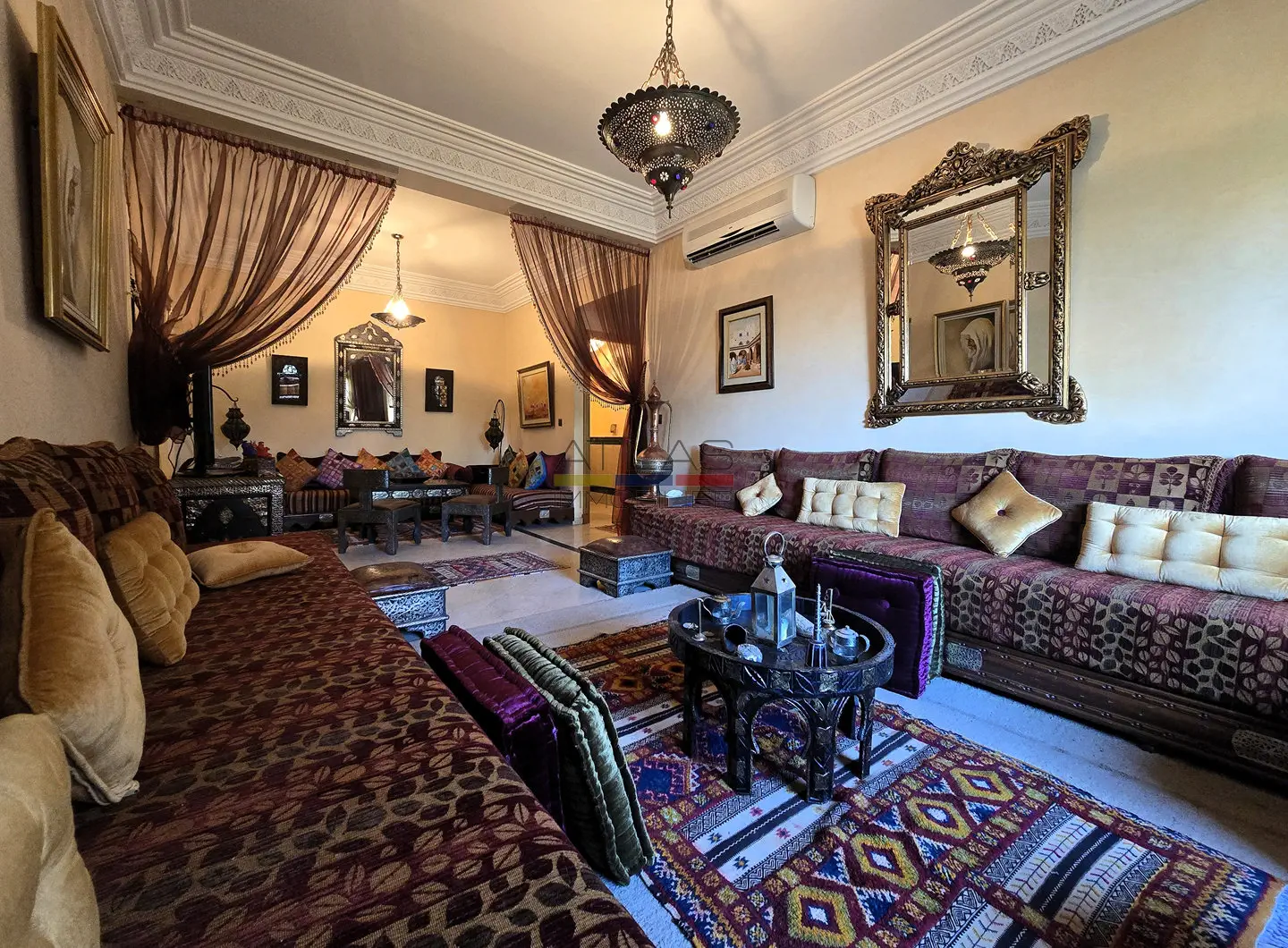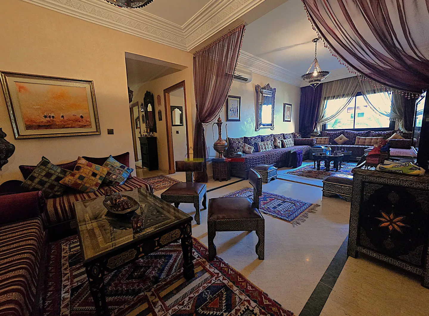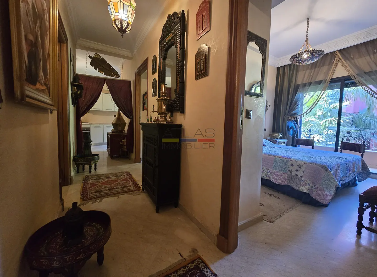 Dès l’entrée, un hall mène à un vaste séjour double, composé de salons marocains chaleureux et d’un espace convivial. Les volumes sont bien répartis et la disposition fonctionnelle permet de profiter pleinement du calme et du confort de l’appartement, sans vis-à-vis.