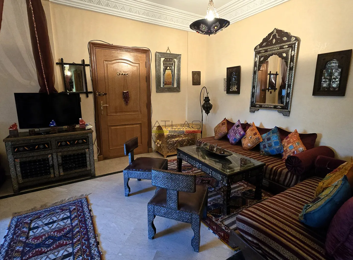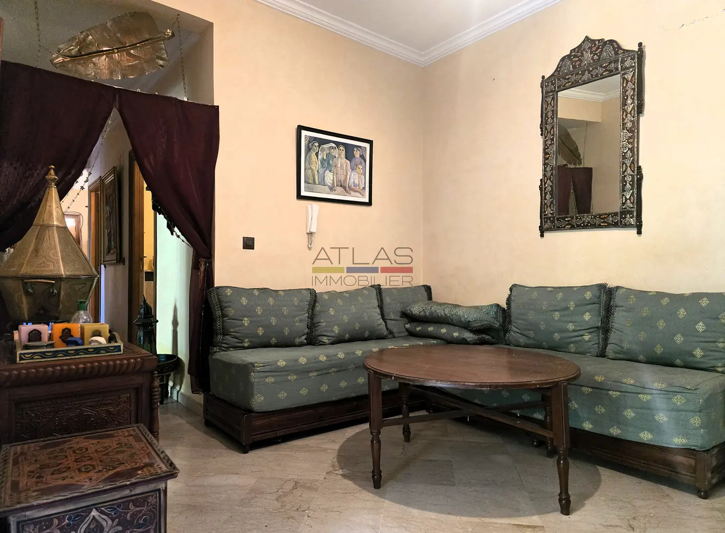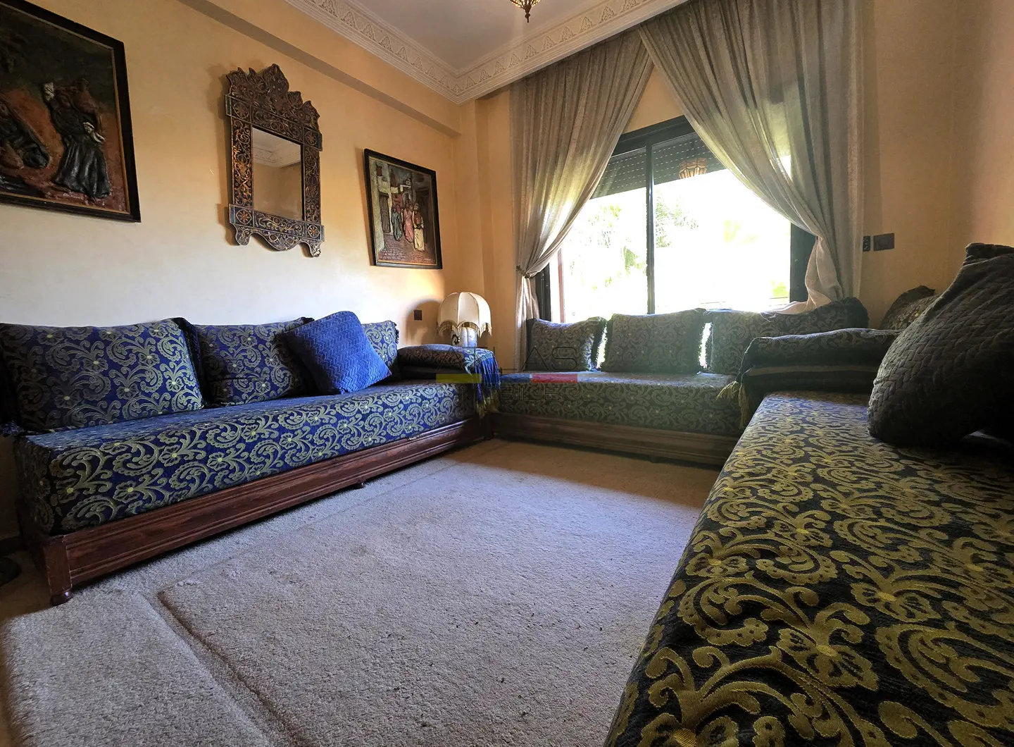 Dès l’entrée, un hall mène à un vaste séjour double, composé de salons marocains chaleureux et d’un espace convivial. Les volumes sont bien répartis et la disposition fonctionnelle permet de profiter pleinement du calme et du confort de l’appartement, sans vis-à-vis.