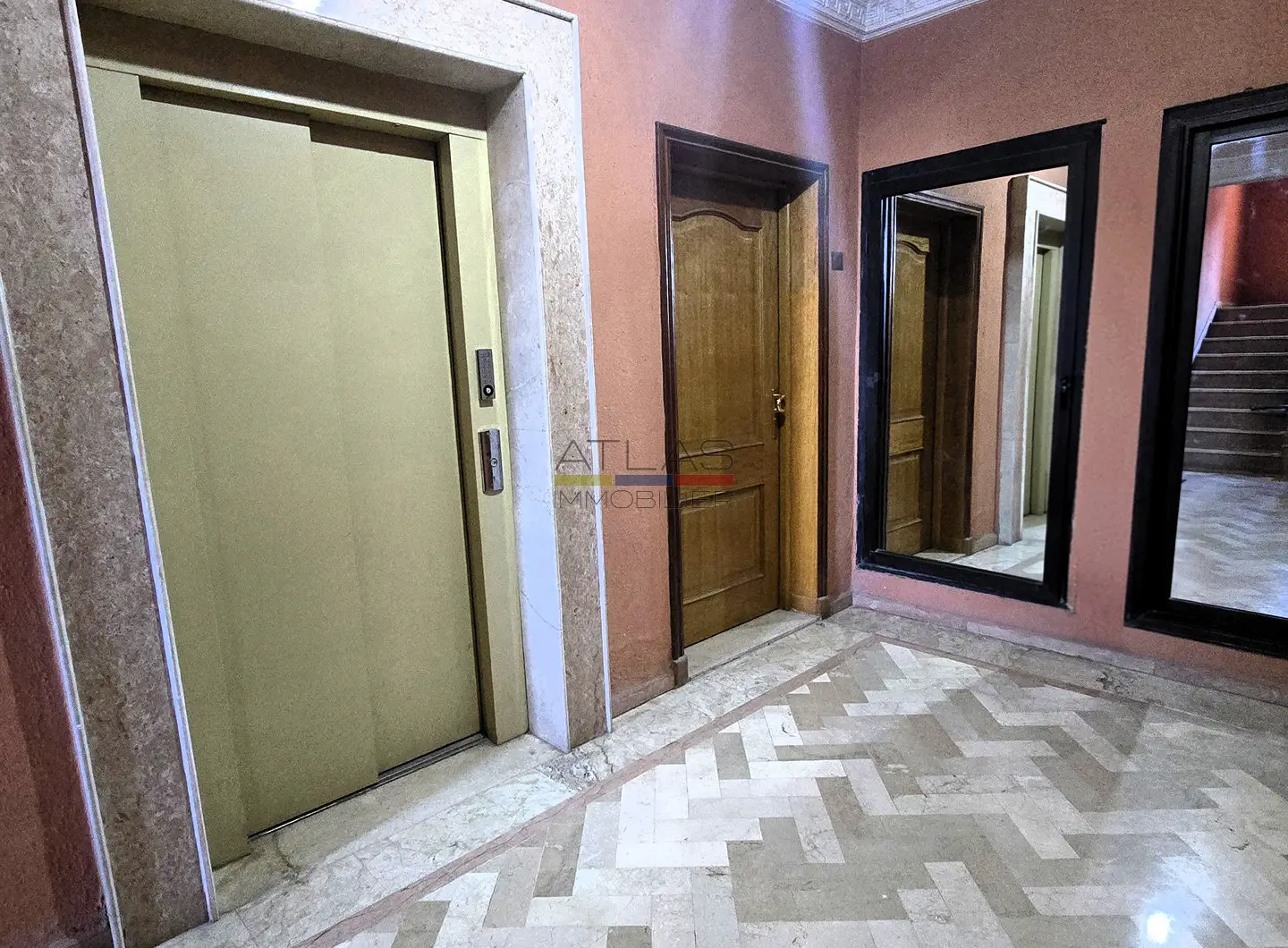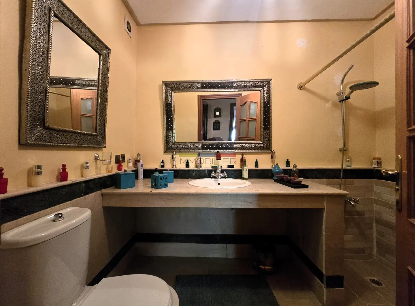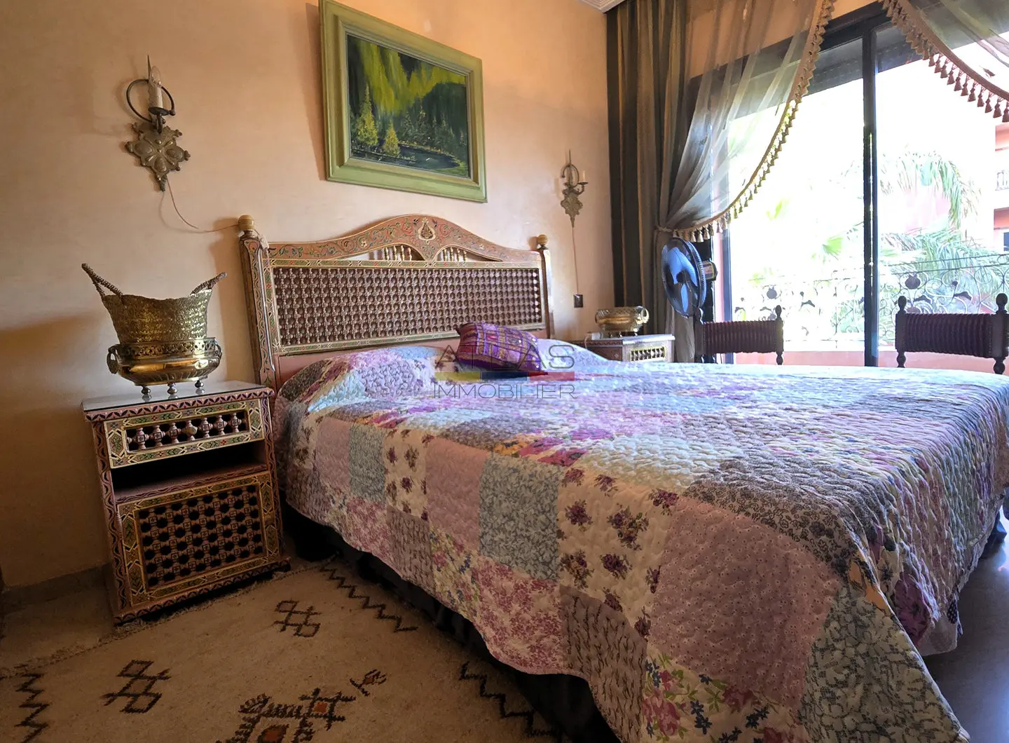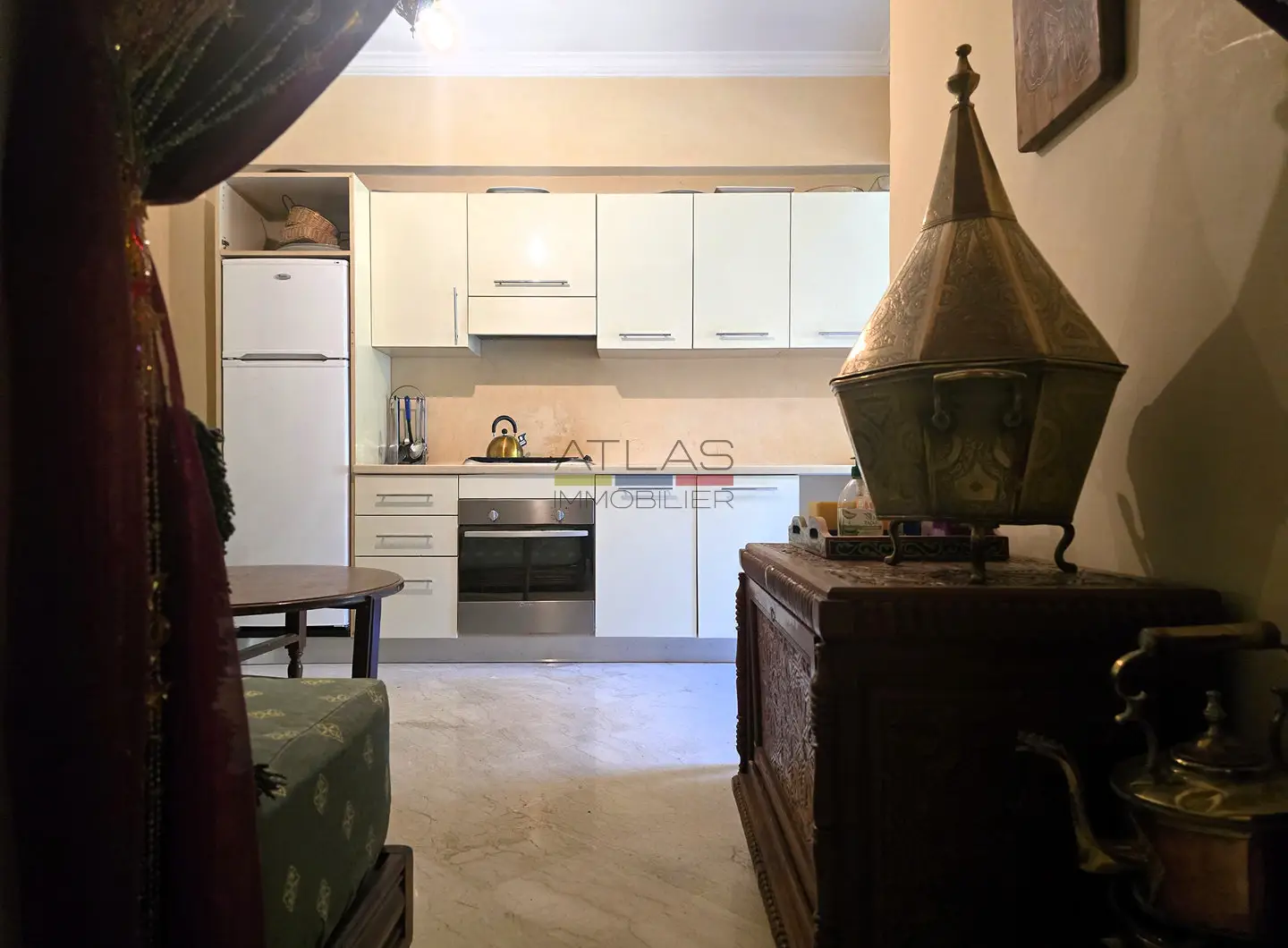 Dès l’entrée, un hall mène à un vaste séjour double, composé de salons marocains chaleureux et d’un espace convivial. Les volumes sont bien répartis et la disposition fonctionnelle permet de profiter pleinement du calme et du confort de l’appartement, sans vis-à-vis.