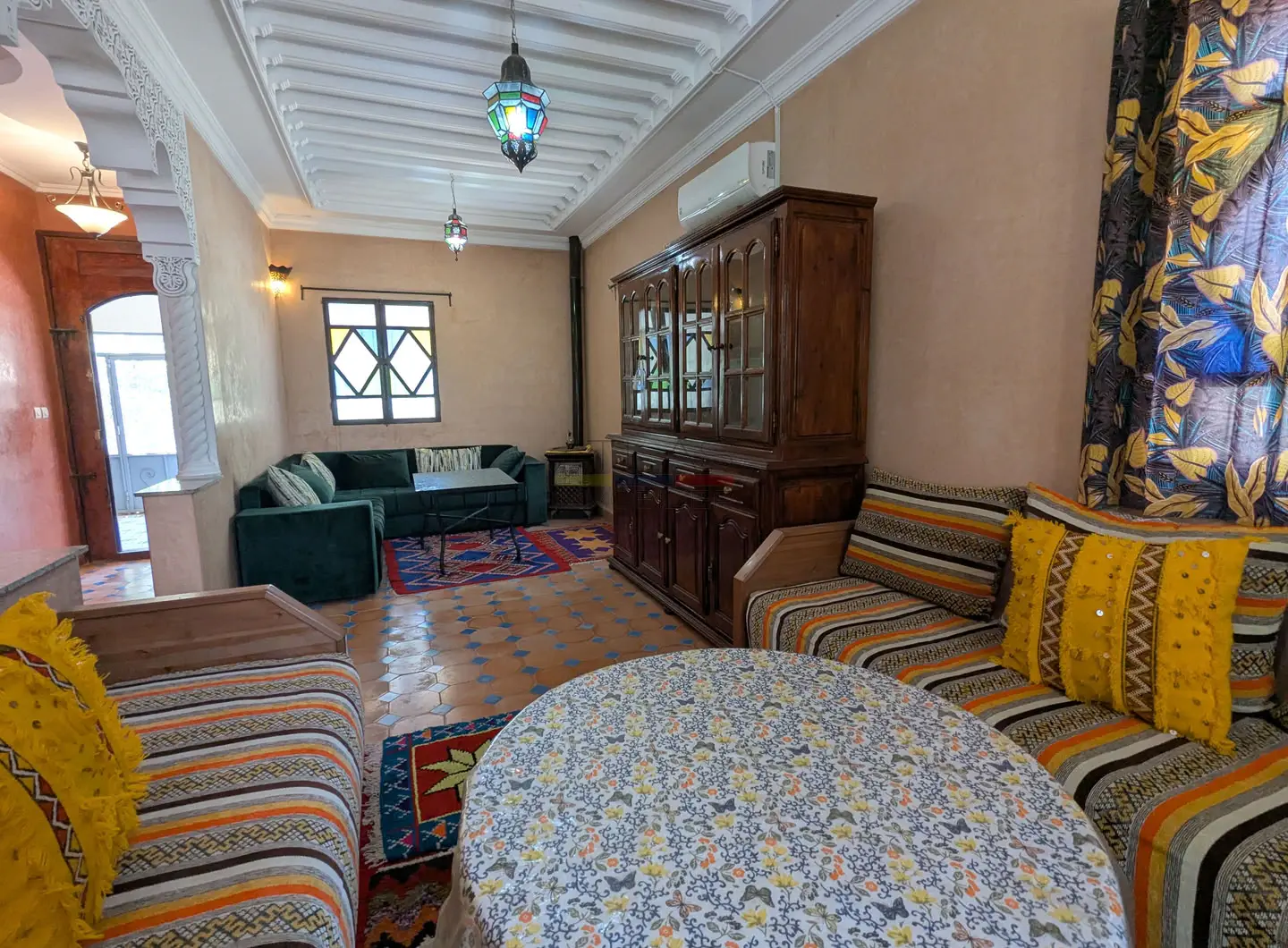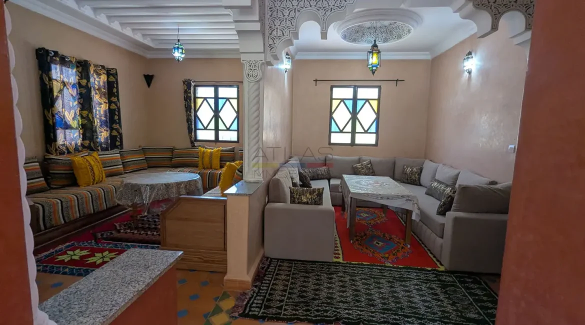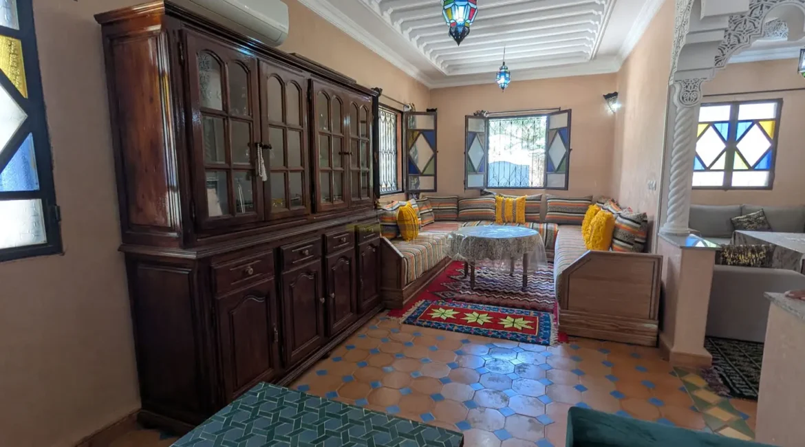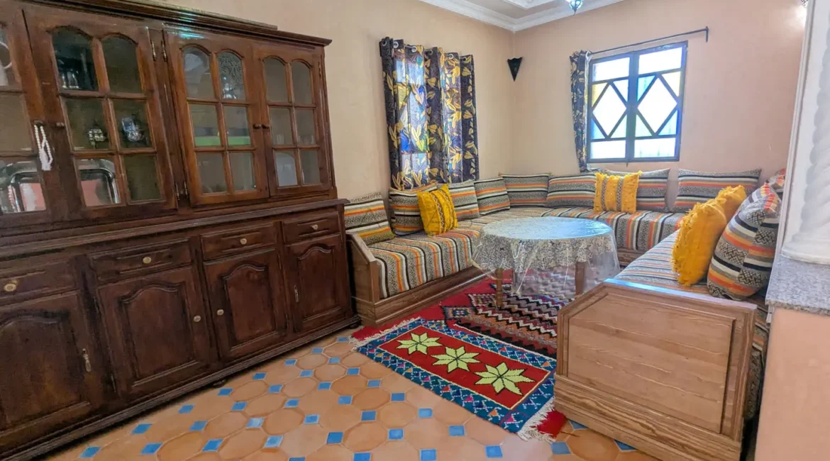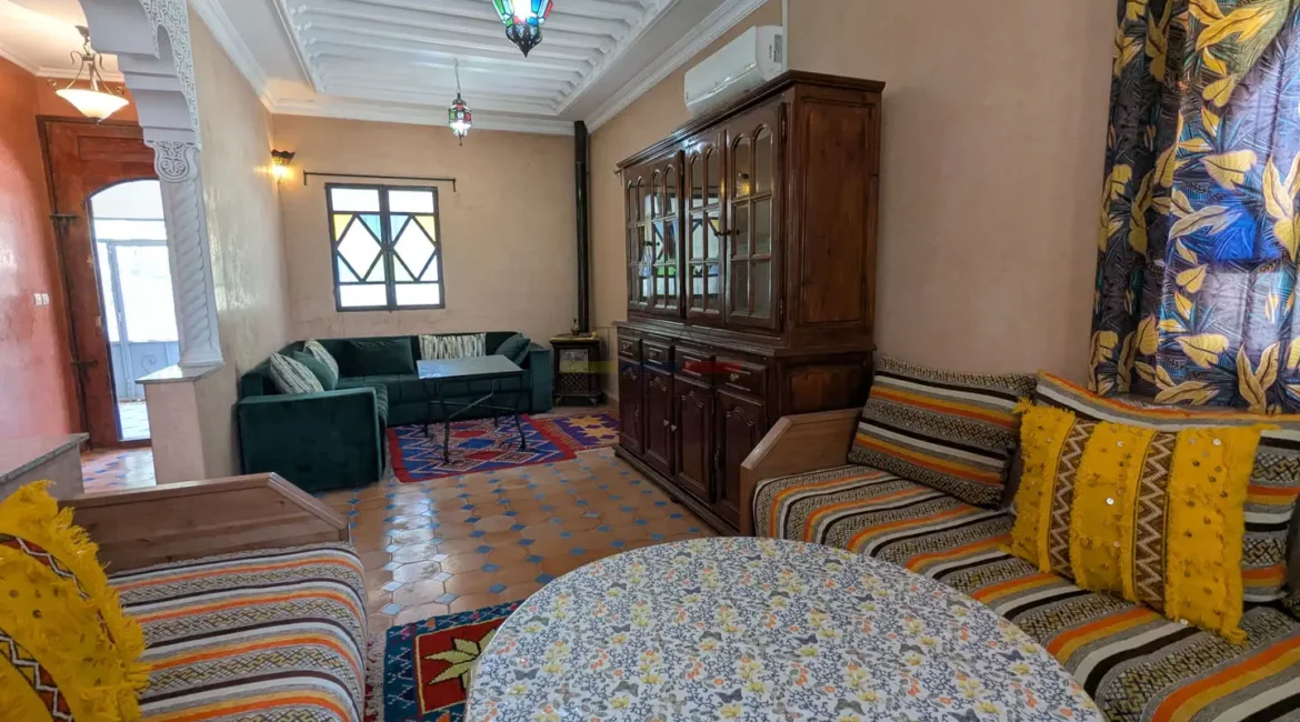 Nichée dans la région paisible d’Ounagha, à seulement 26 km d’Essaouira, cette villa de charme offre un cadre de vie privilégié, idéal pour une location longue durée. Édifiée sur un terrain généreux de 1000 m², elle conjugue confort moderne et authenticité grâce à son vaste jardin planté d’oliviers et de figuiers.