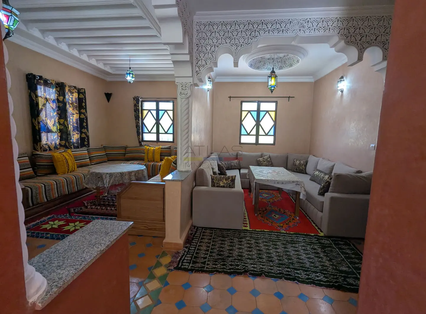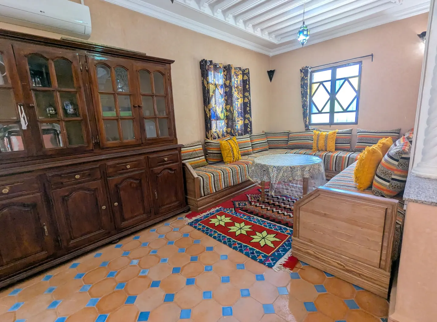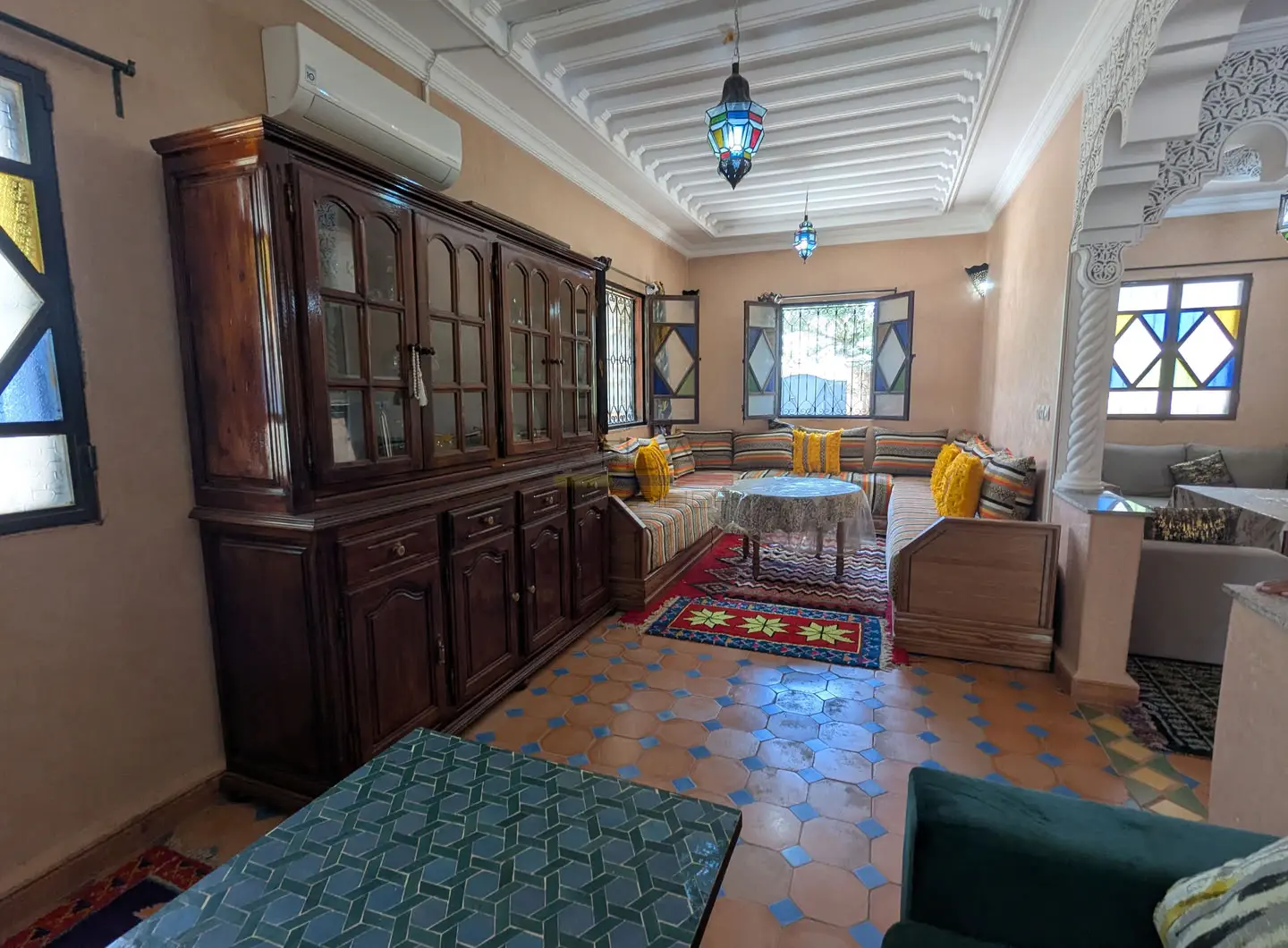 Nichée dans la région paisible d’Ounagha, à seulement 26 km d’Essaouira, cette villa de charme offre un cadre de vie privilégié, idéal pour une location longue durée. Édifiée sur un terrain généreux de 1000 m², elle conjugue confort moderne et authenticité grâce à son vaste jardin planté d’oliviers et de figuiers.