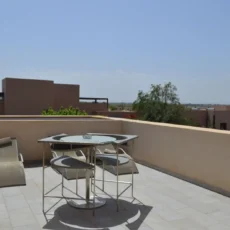 Le toit abrite un véritable espace bien-être avec solarium, pergola bioclimatique, jacuzzi et hammam, idéal pour profiter des douces soirées de Marrakech.