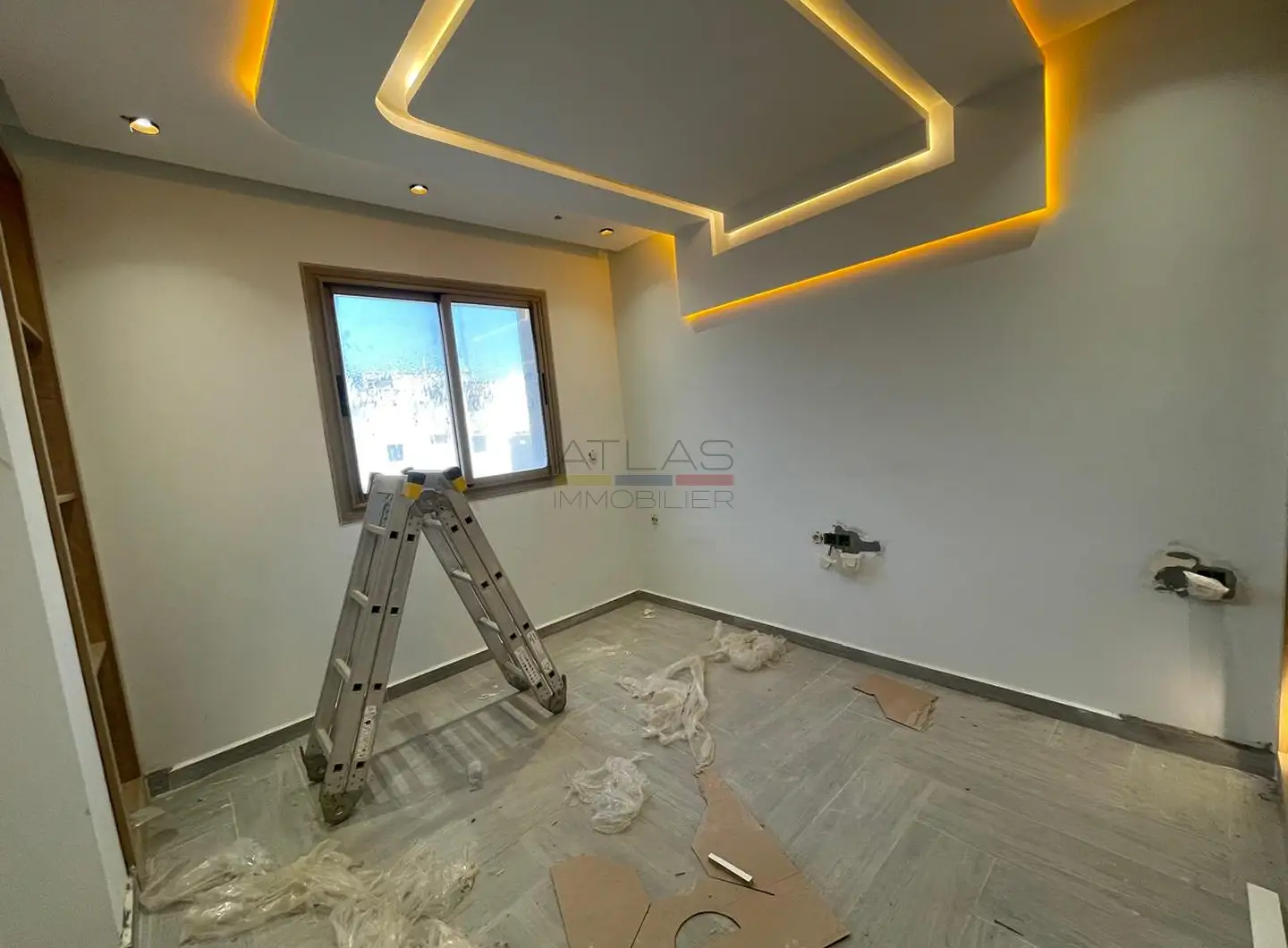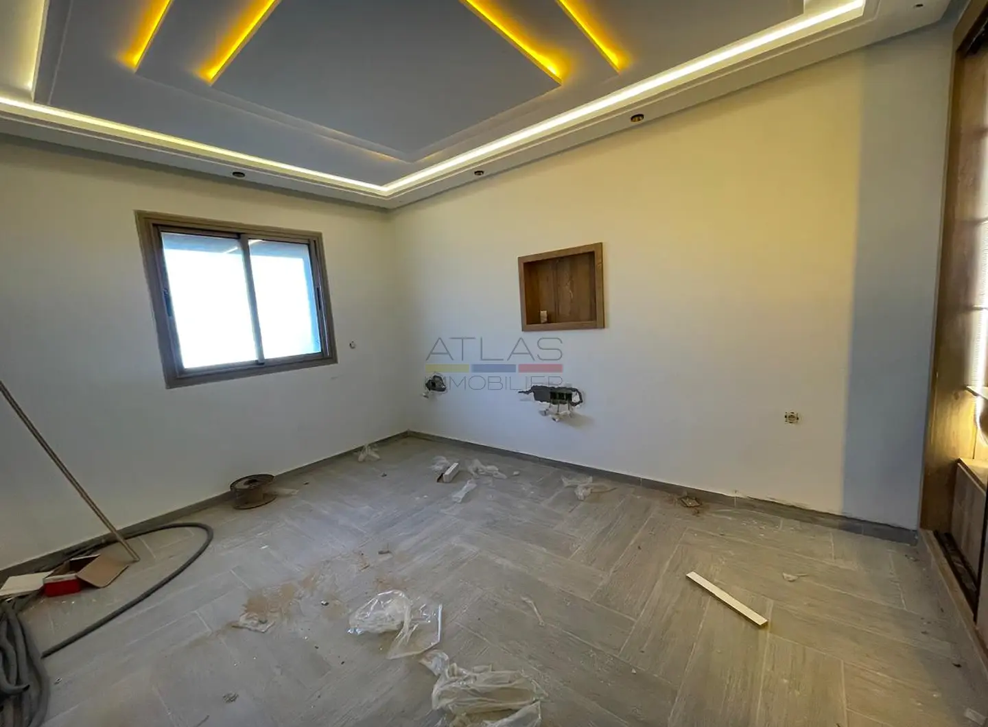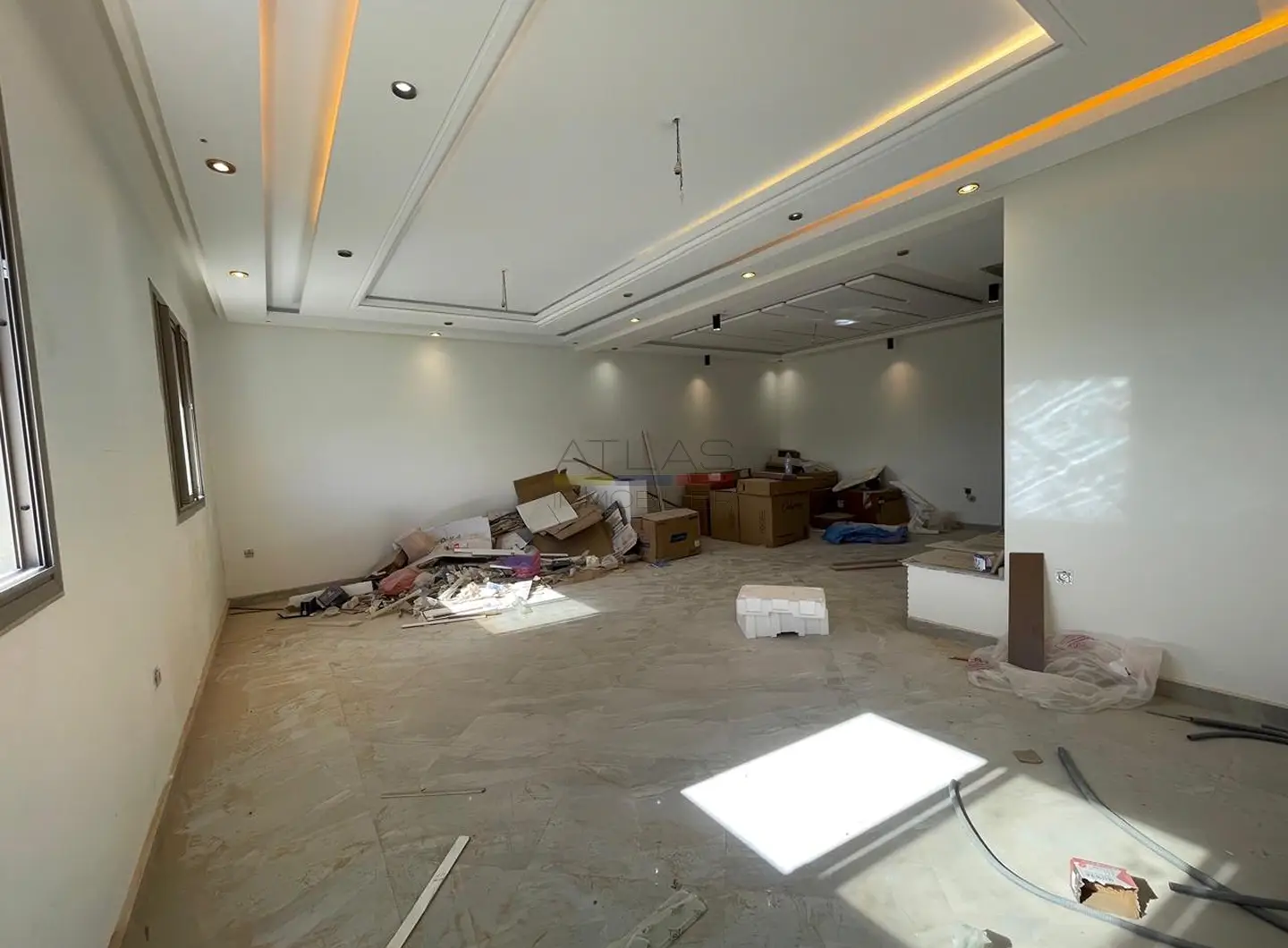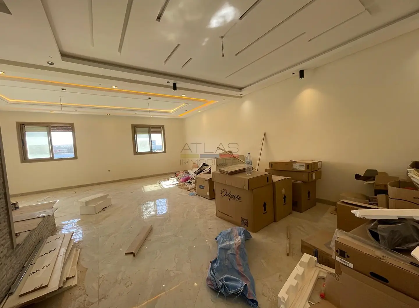 Dès l’entrée, le vaste salon séduit par sa luminosité et son volume généreux, renforcé par la présence d’une cheminée, élément rare dans les programmes neufs et apportant une touche chaleureuse à l’ensemble. L’appartement, pensé pour offrir un confort optimal, profite d’une distribution fluide des espaces et d’un ensoleillement naturel appréciable tout au long de la journée, atout majeur dans le quartier de Raounak.