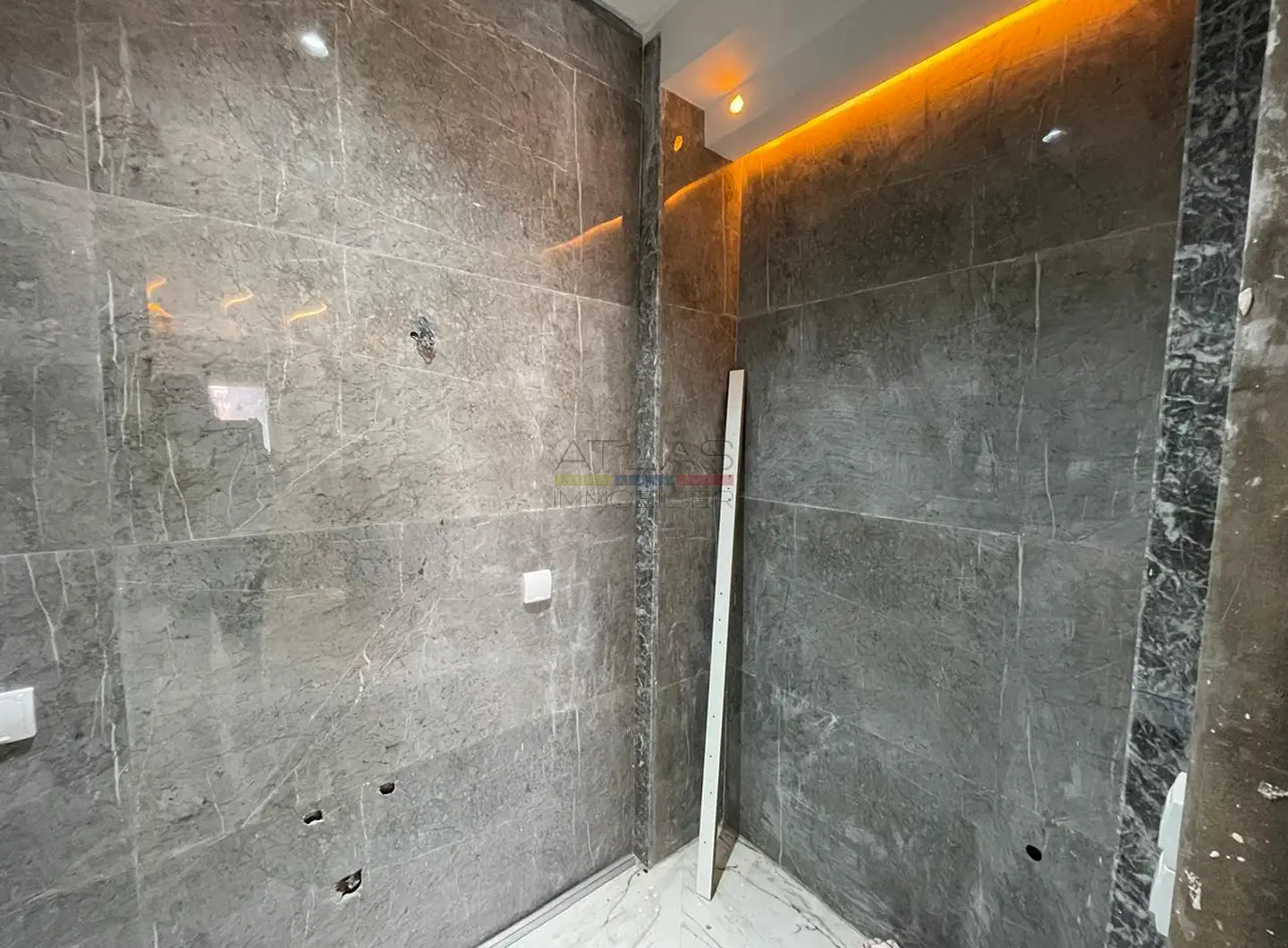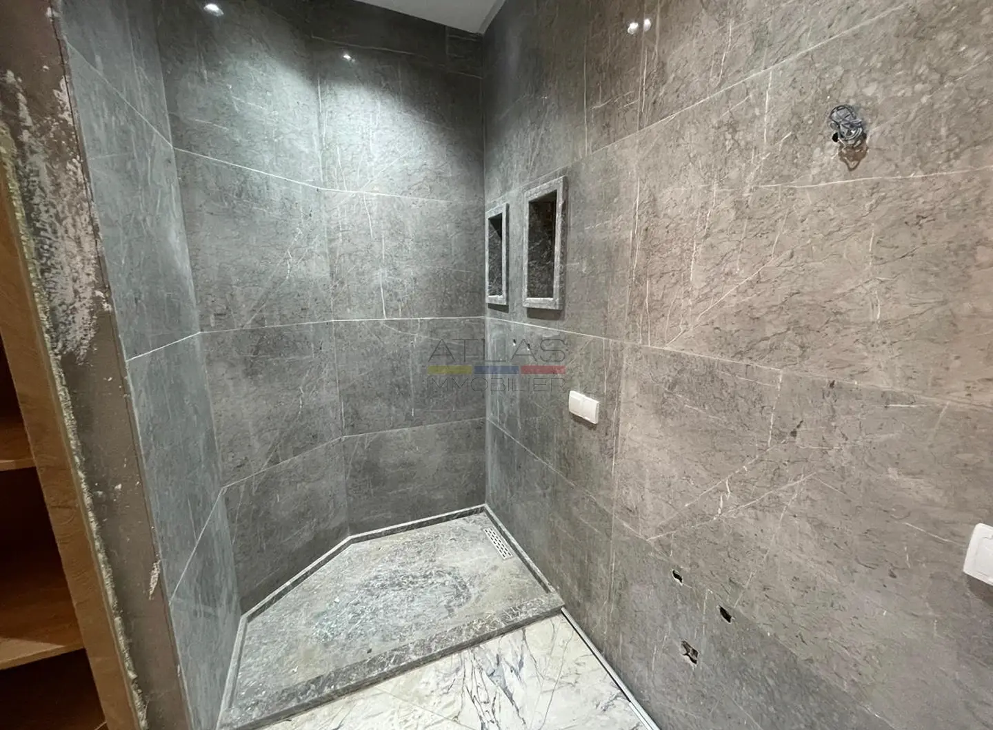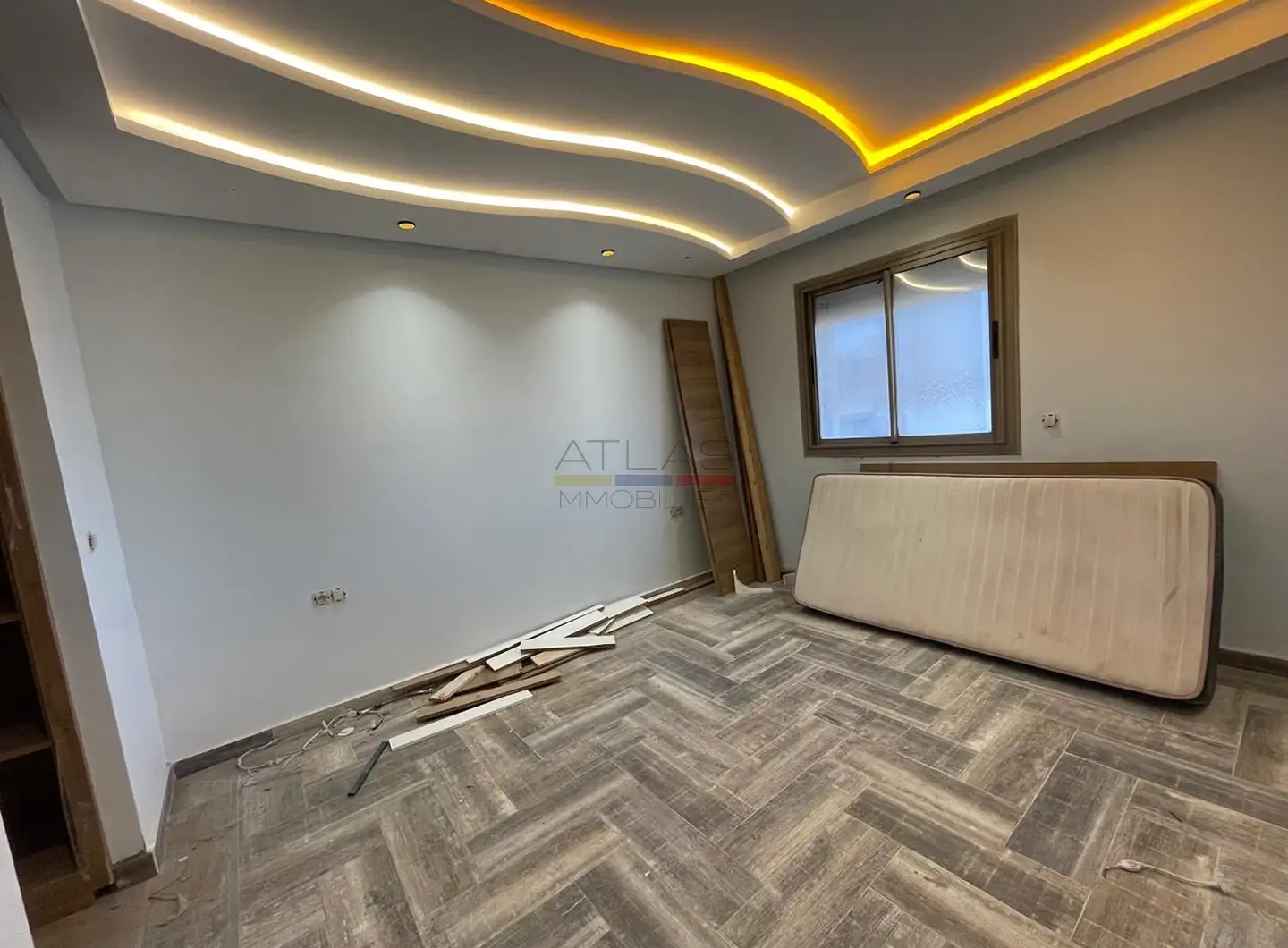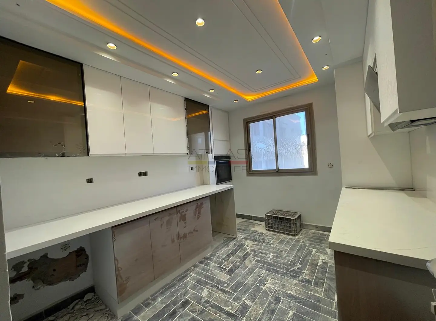 Dès l’entrée, le vaste salon séduit par sa luminosité et son volume généreux, renforcé par la présence d’une cheminée, élément rare dans les programmes neufs et apportant une touche chaleureuse à l’ensemble. L’appartement, pensé pour offrir un confort optimal, profite d’une distribution fluide des espaces et d’un ensoleillement naturel appréciable tout au long de la journée, atout majeur dans le quartier de Raounak.