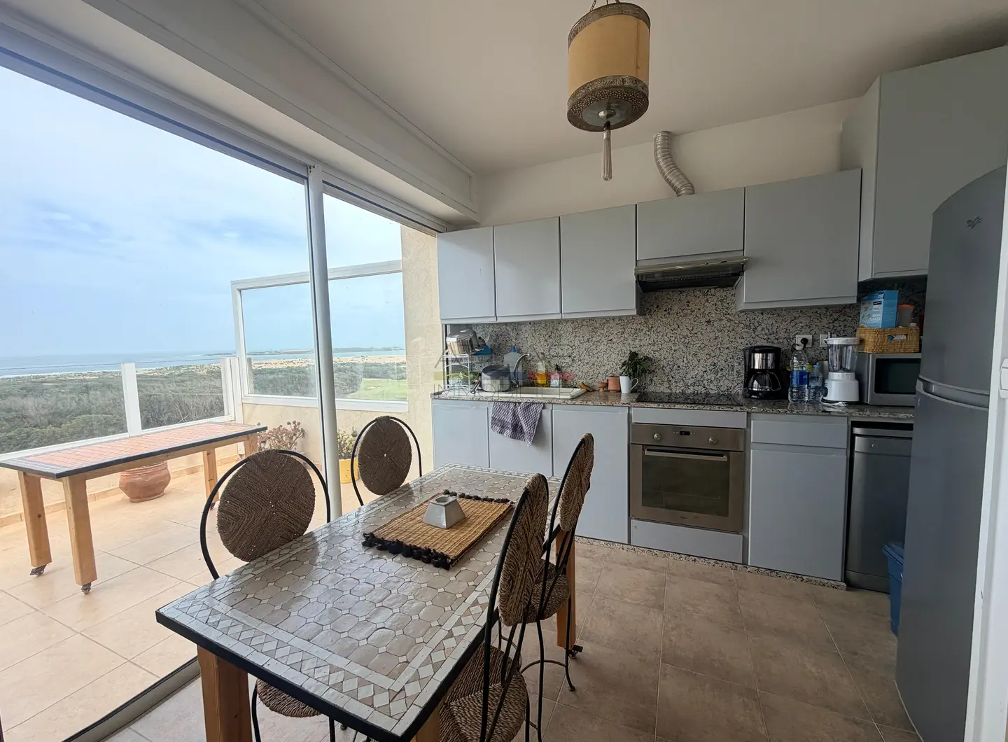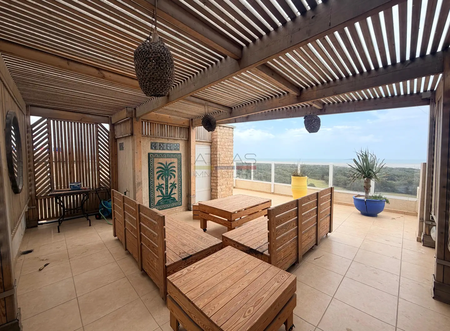 Le toit-terrasse aménagé avec pergola offre une vue à couper le souffle sur l’océan, le golf et la médina d’Essaouira, parfait pour profiter des couchers de soleil dans un cadre privilégié.