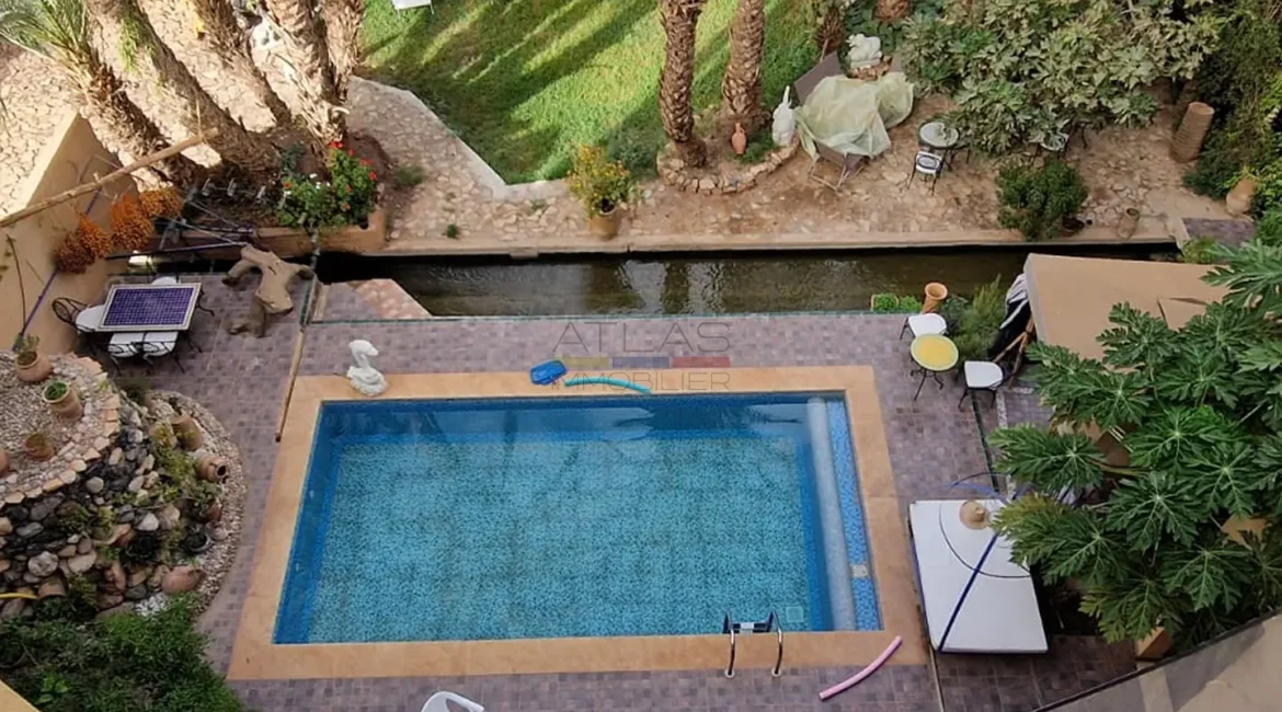 Les extérieurs offrent un jardin donnant directement sur l’oasis, une terrasse panoramique aménagée, une piscine et un hammam au feu de bois. L’accès se fait par route, et la maison bénéficie de l’eau de ville complétée par une saghia assurant un approvisionnement permanent. Les connexions téléphoniques et internet sont disponibles, avec un réseau globalement stable renforcé par le Wi-Fi.