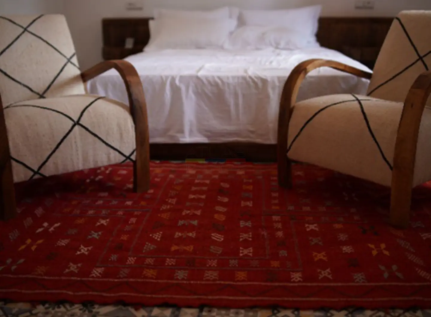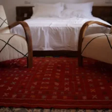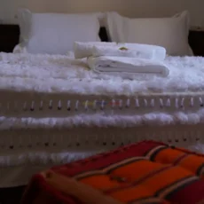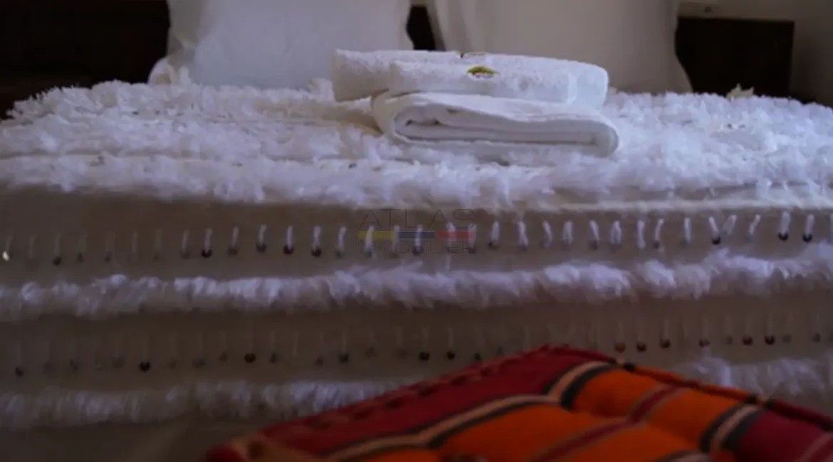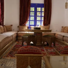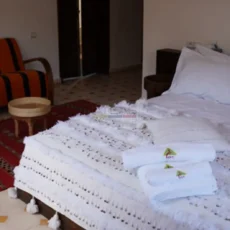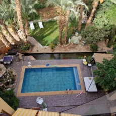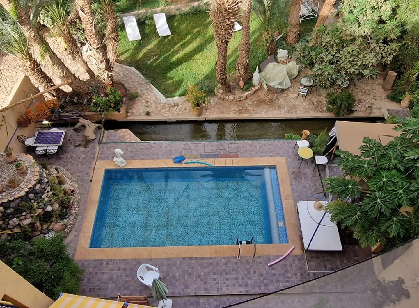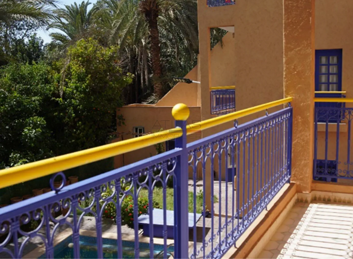 Édifiée sur un terrain d’environ 1 400 m² et développant près de 800 m² habitables, la propriété comprend dix chambres destinées à l’hébergement, toutes avec salle de bain privative et terrasse sur l’oasis, ainsi que neuf autres pièces à usage commun ou de service. Conçue et réalisée par un architecte, elle respecte les codes de l’architecture traditionnelle berbère : murs en pierre et pisé, plafonds en tataoui, menuiseries bois de l’Atlas. Les espaces de réception se composent d’un hall, d’un séjour, d’un salon marocain, d’une salle à manger, d’une bibliothèque et d’un salon à l’étage.