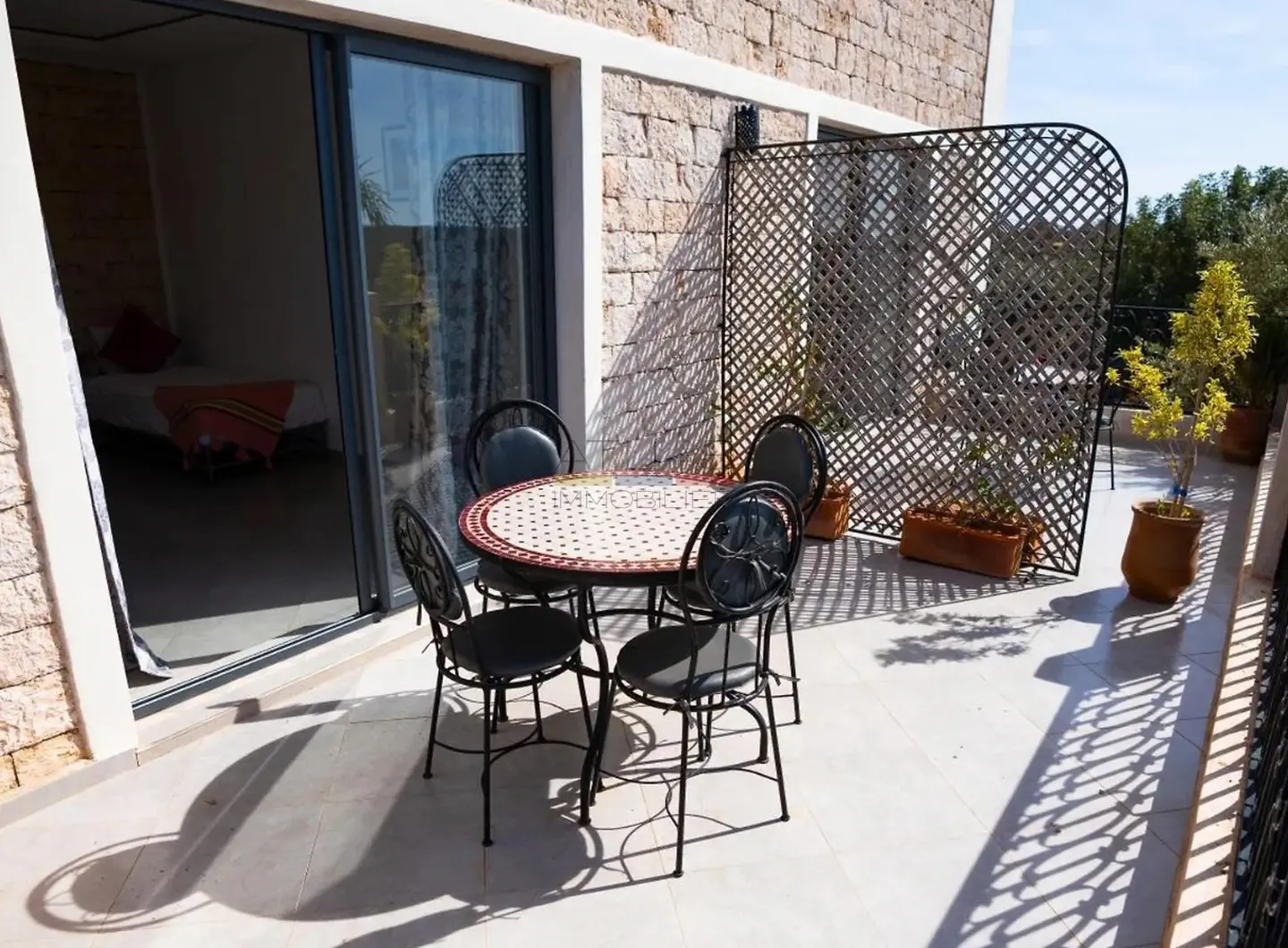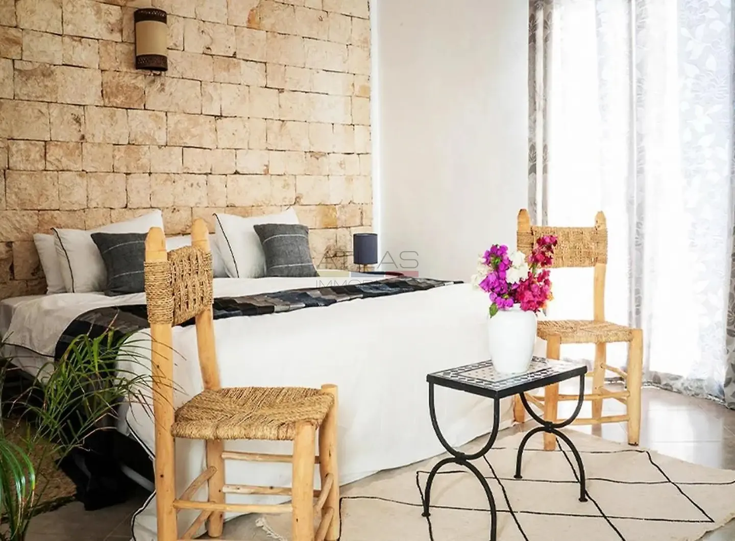 À l’étage, quatre chambres supplémentaires disposent toutes de salles de douche privatives. Deux suites bénéficient de terrasses privées avec vue dégagée sur la campagne environnante, tandis que deux autres chambres profitent de balcons privatifs, renforçant l’attrait de cette maison d’hôtes à vendre près d’Essaouira pour une exploitation immédiate. Les literies, de qualité hôtelière, sont hypoallergéniques et équipées de couettes en duvet d’oie, participant au positionnement confort et bien-être de l’établissement.