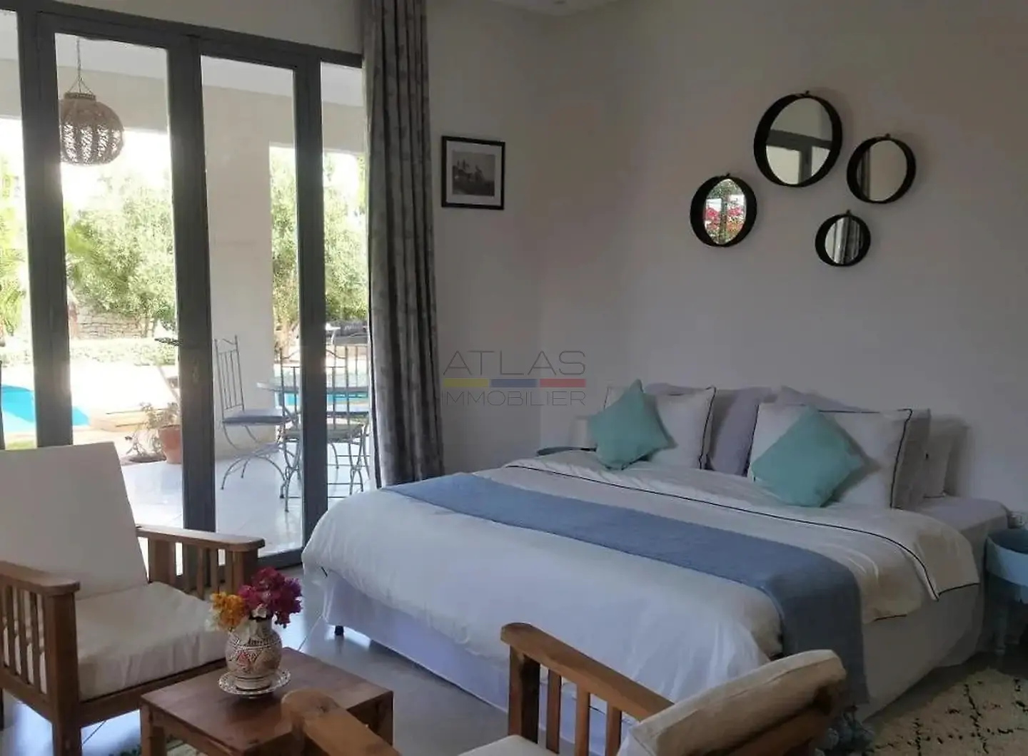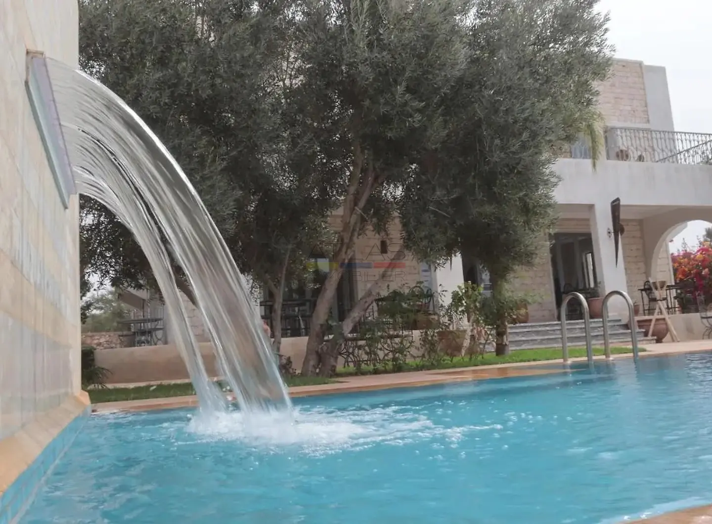 La propriété se compose d’un ensemble principal et d’une dépendance indépendante comprenant deux suites haut de gamme, chacune dotée de sa piscine privée, de son hammam et d’une terrasse sur le toit, offrant une expérience exclusive très appréciée en hébergement touristique. L’ensemble est organisé autour d’un grand jardin paysager et d’une vaste piscine centrale, véritable point focal de la maison d’hôtes, idéale pour la détente et les séjours bien-être.