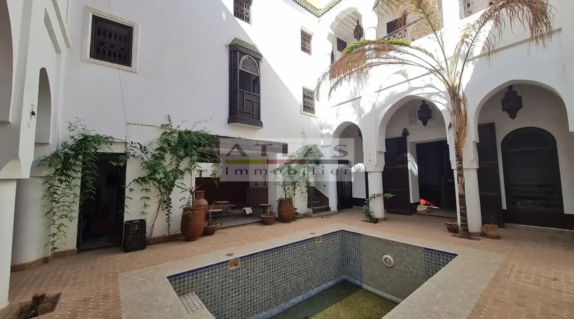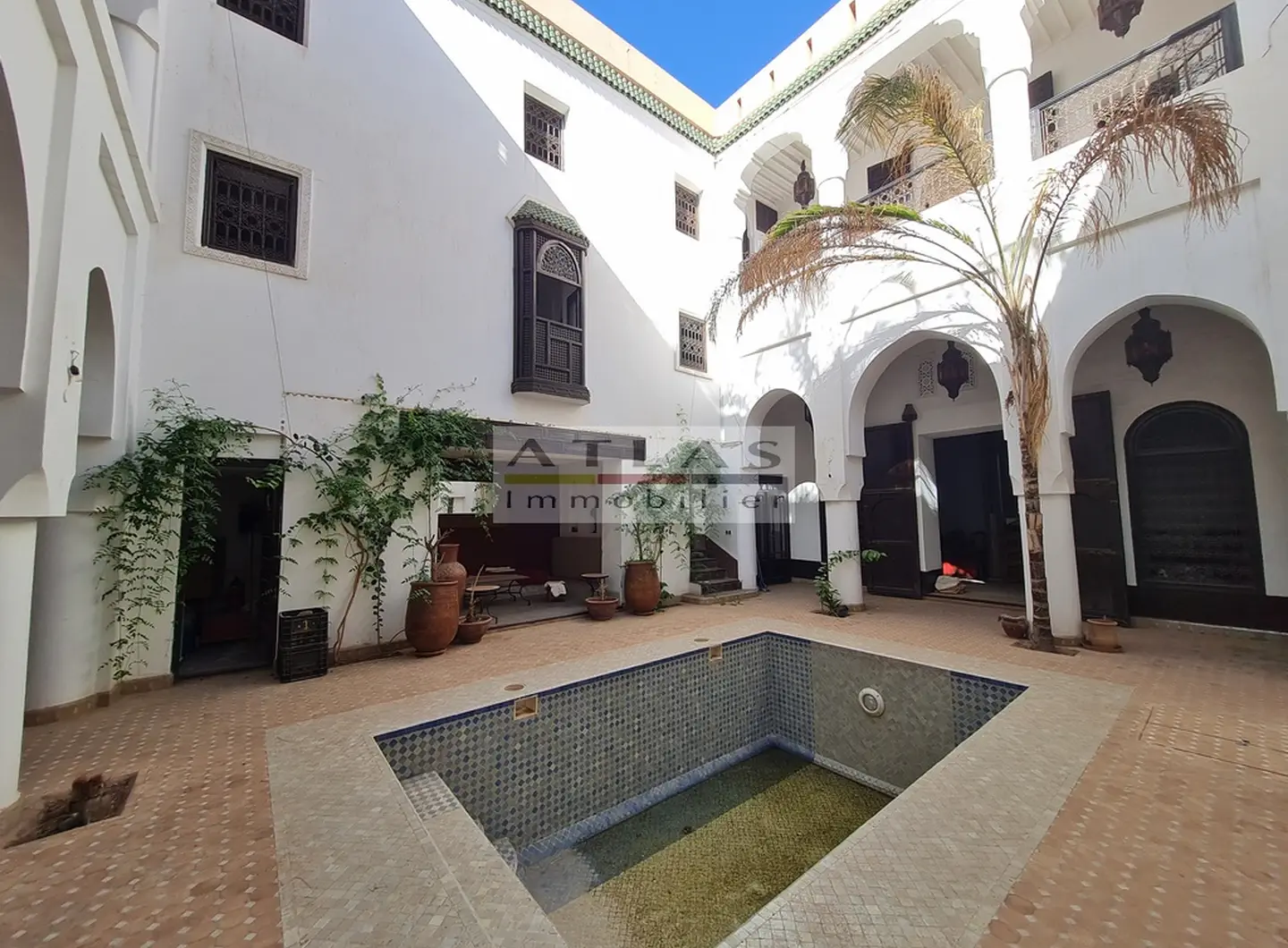 Le riad s’articulait autour d’un vaste patio de plus de cent mètres carrés avec un bhou traditionnel et une piscine chauffée de cinq mètres sur trois, rareté appréciée dans ce secteur historique. À proximité immédiate d’un accès voiture, il offrait une facilité d’accès particulièrement recherchée dans la médina.
