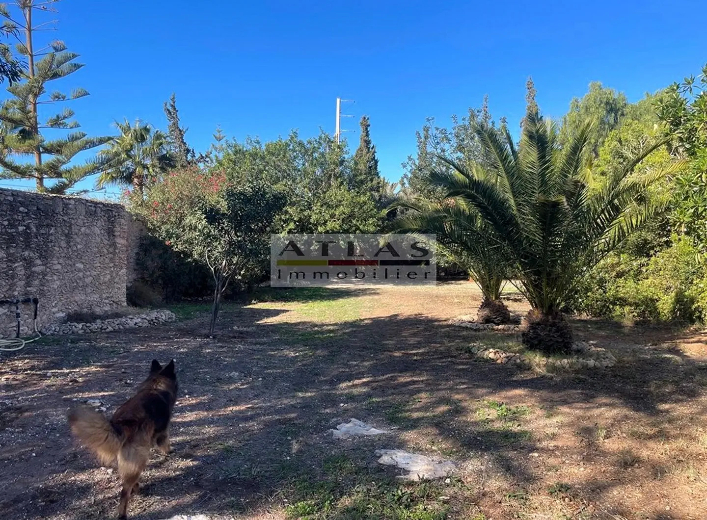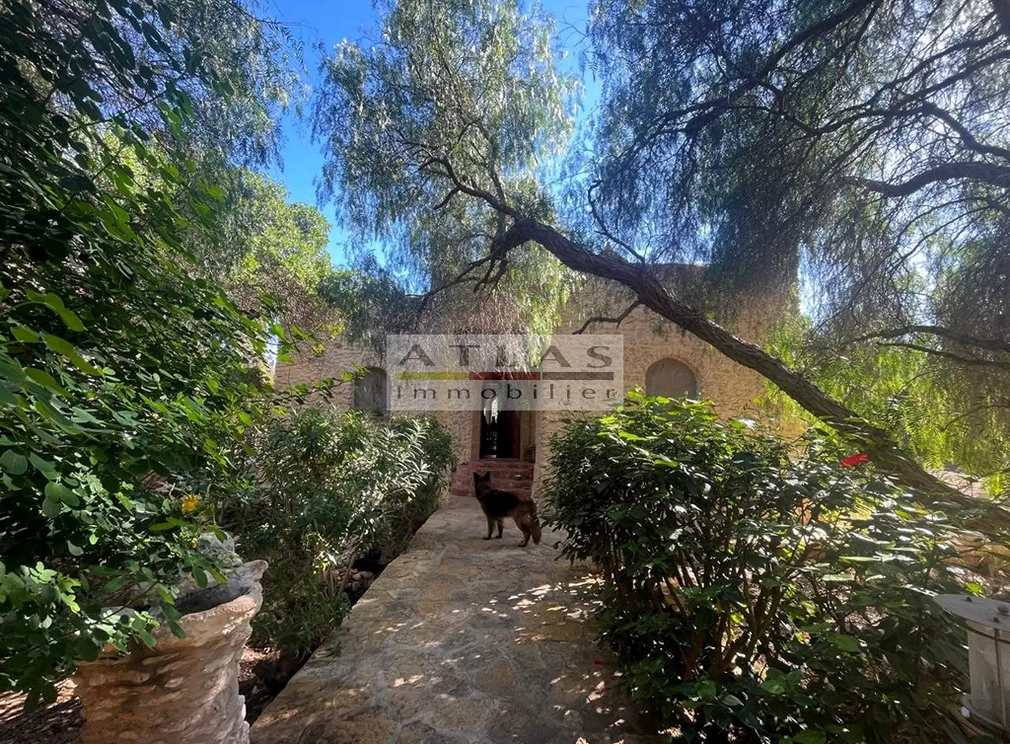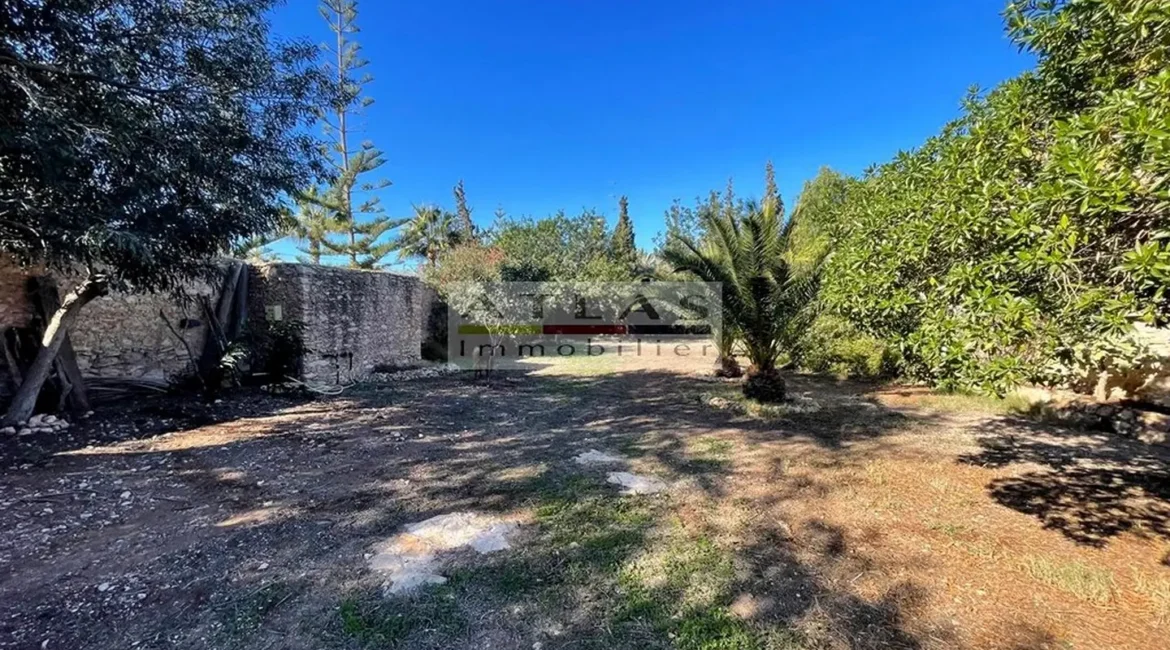 Le jardin, soigneusement entretenu, est planté de figuiers, de grenadiers et d’oliviers, offrant un cadre bucolique et apaisant. Un grand garage/atelier, deux locaux techniques et un puits privé viennent compléter les aménagements pratiques de la propriété.