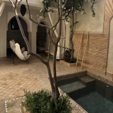 Construit sur un terrain de 127 m² et développant environ 200 m² habitables, ce riad déploie son charme sur deux niveaux complétés par une terrasse aménagée. L’architecture marocaine traditionnelle s’allie au confort moderne pour créer un lieu à la fois chaleureux, fonctionnel et unique. Le patio central, orné de jasmin, d’oranger et de bougainvillier, abrite un bassin de rafraîchissement autorisé, véritable cœur de la maison.