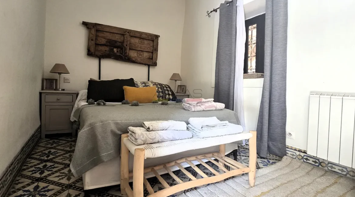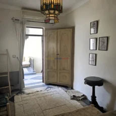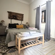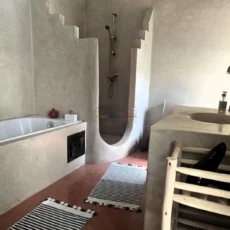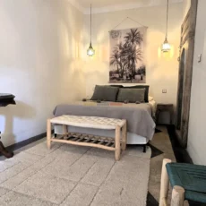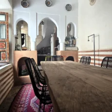 Le toit-terrasse accueille un espace lecture et détente, une cuisine extérieure avec coin repas et un salon sous pergola pour profiter des soirées d’été. Chaque détail du décor a été pensé avec soin : tadelakt, tapis Beni Ouarain et Azilal, textiles tissés à la main, menuiseries artisanales… L’authenticité a été préservée, offrant un lieu raffiné et imprégné de l’âme marocaine.