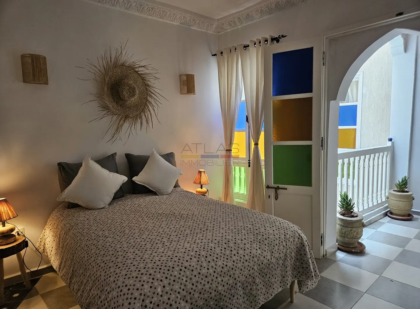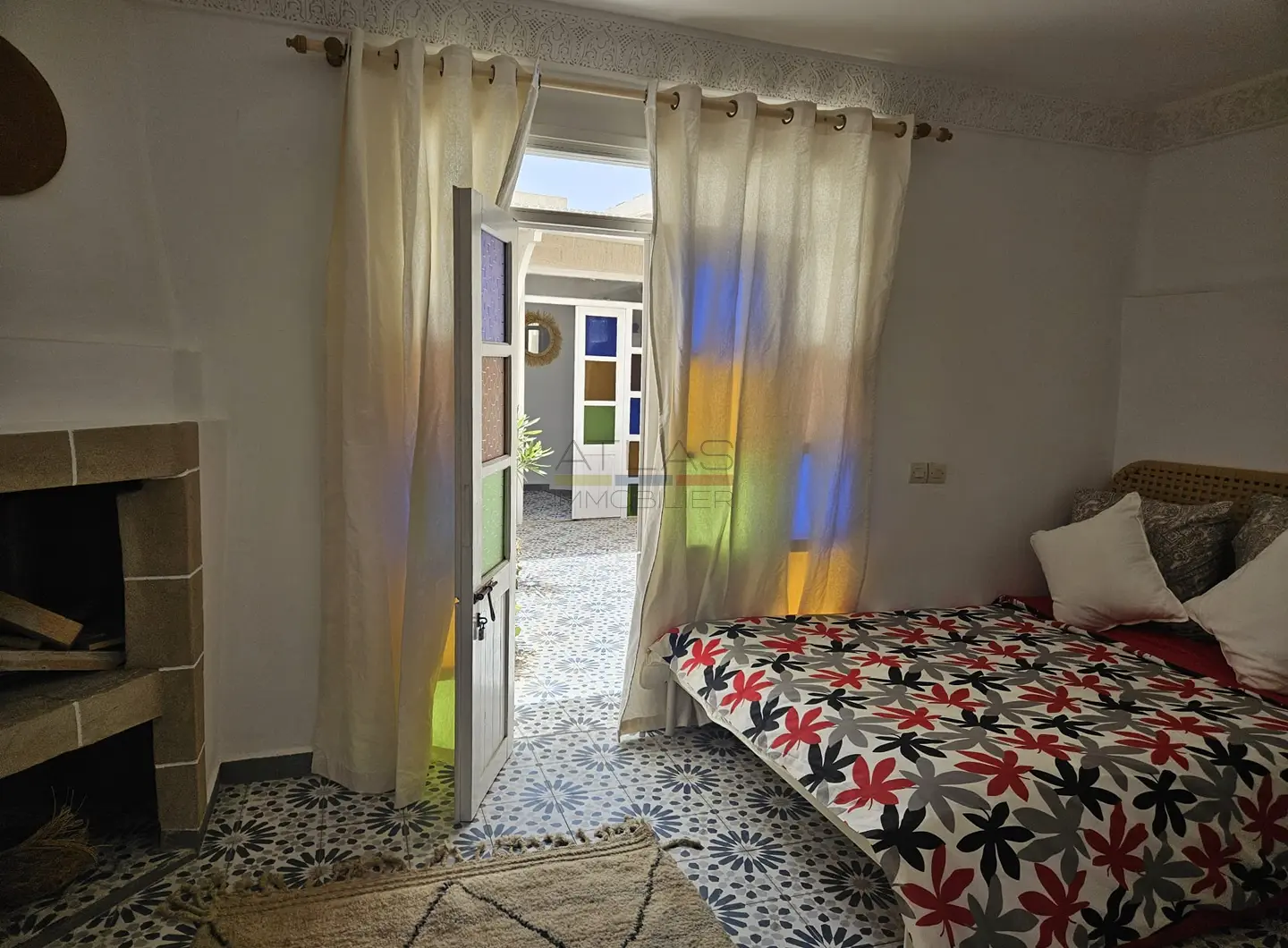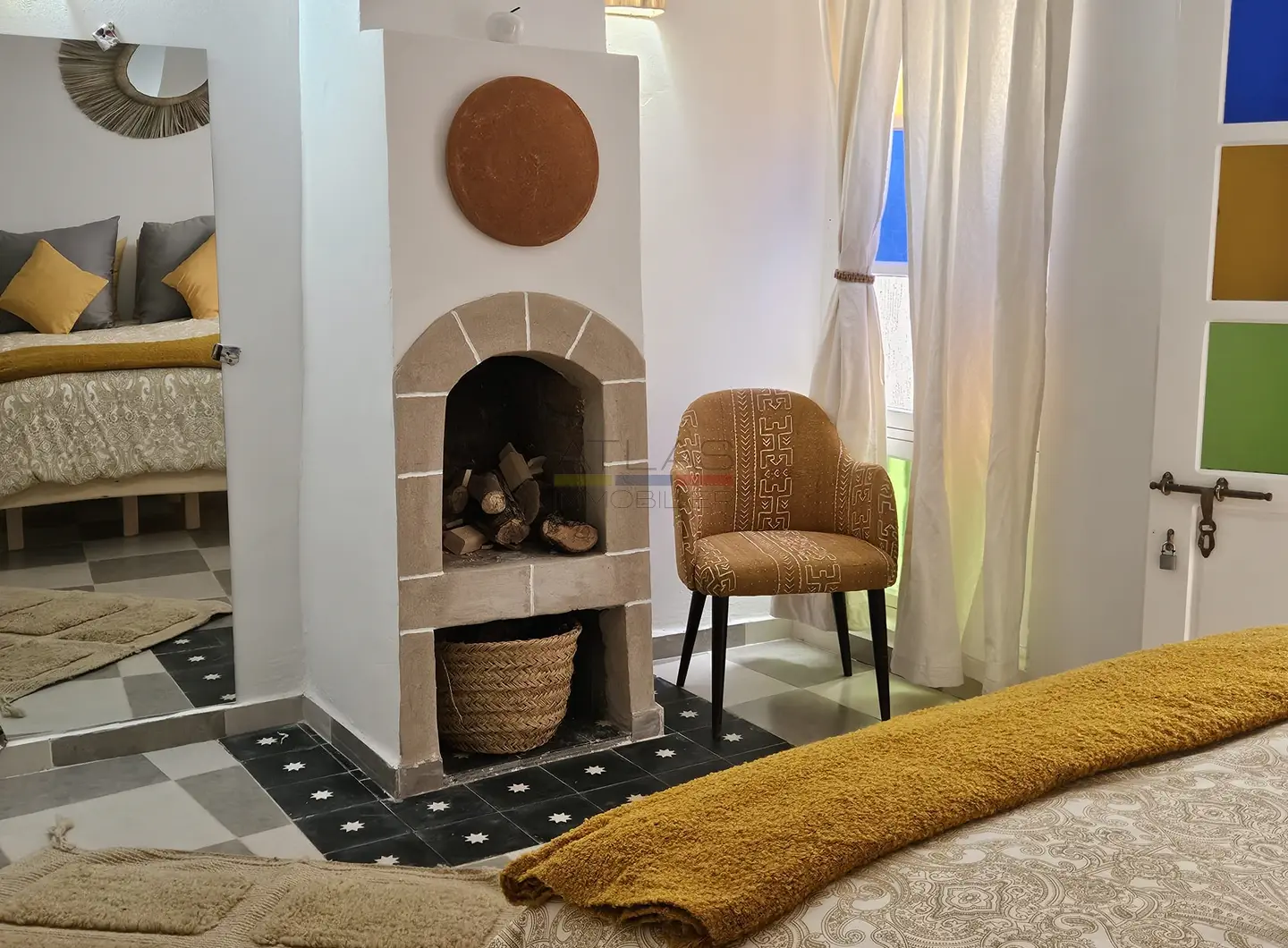 Les premier et deuxième étages proposent chacun deux chambres lumineuses et confortables, dont une avec salle de douche, WC et cheminée fonctionnelle, complétées par un coin salon, idéal pour créer des espaces de lecture ou de repos. Le dernier niveau comprend une cinquième chambre avec salle de douche, WC et cheminée, une cuisine fonctionnelle supplémentaire, un espace de rangement et surtout deux superbes terrasses offrant une vue panoramique sur la médina d’Essaouira, parfaites pour profiter du climat et de l’ambiance unique de la ville.