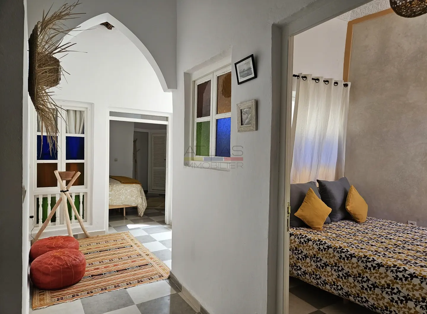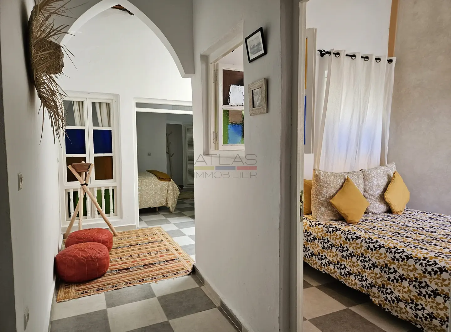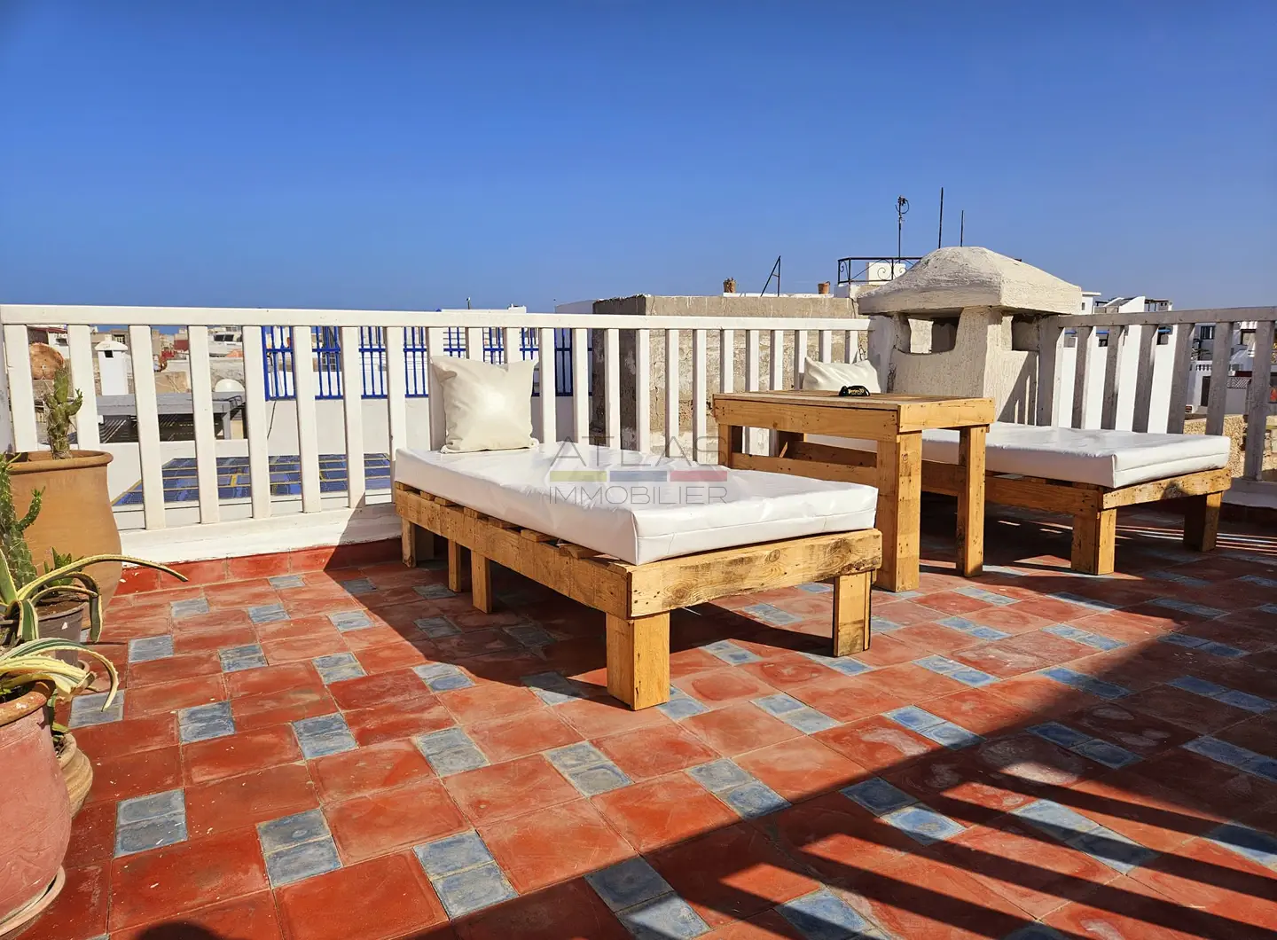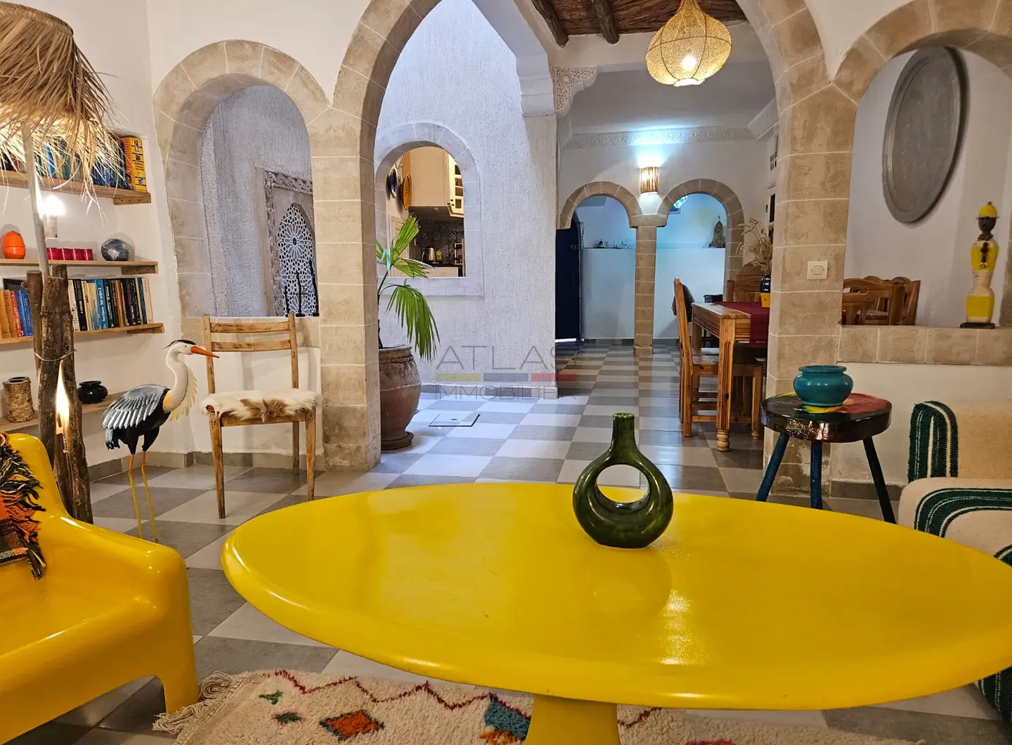 Les premier et deuxième étages proposent chacun deux chambres lumineuses et confortables, dont une avec salle de douche, WC et cheminée fonctionnelle, complétées par un coin salon, idéal pour créer des espaces de lecture ou de repos. Le dernier niveau comprend une cinquième chambre avec salle de douche, WC et cheminée, une cuisine fonctionnelle supplémentaire, un espace de rangement et surtout deux superbes terrasses offrant une vue panoramique sur la médina d’Essaouira, parfaites pour profiter du climat et de l’ambiance unique de la ville.