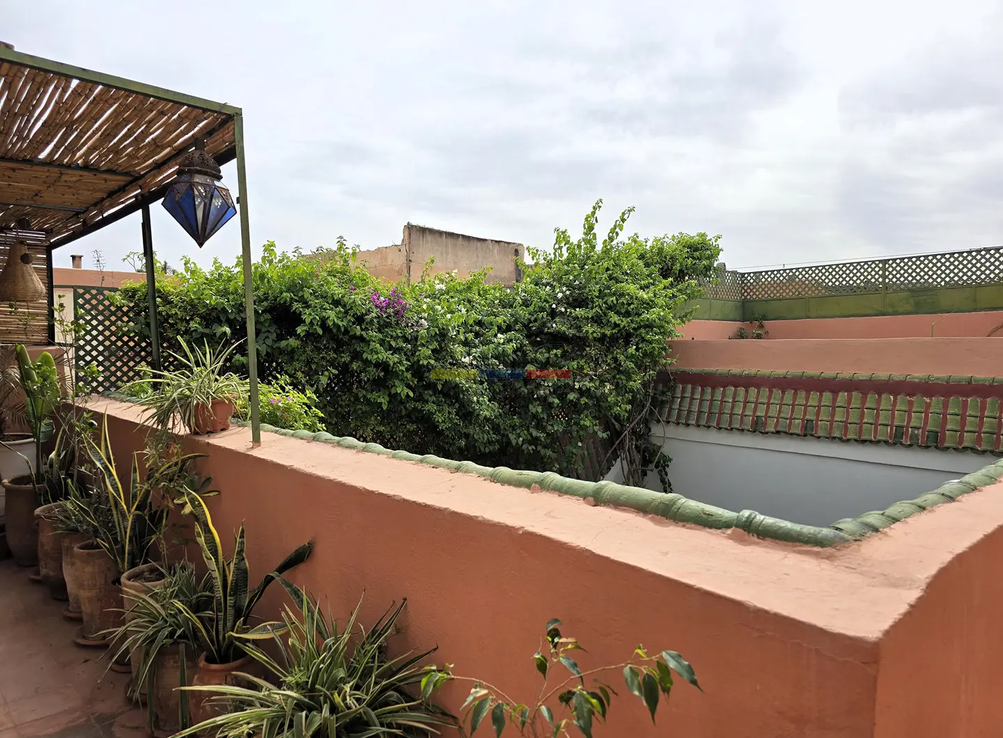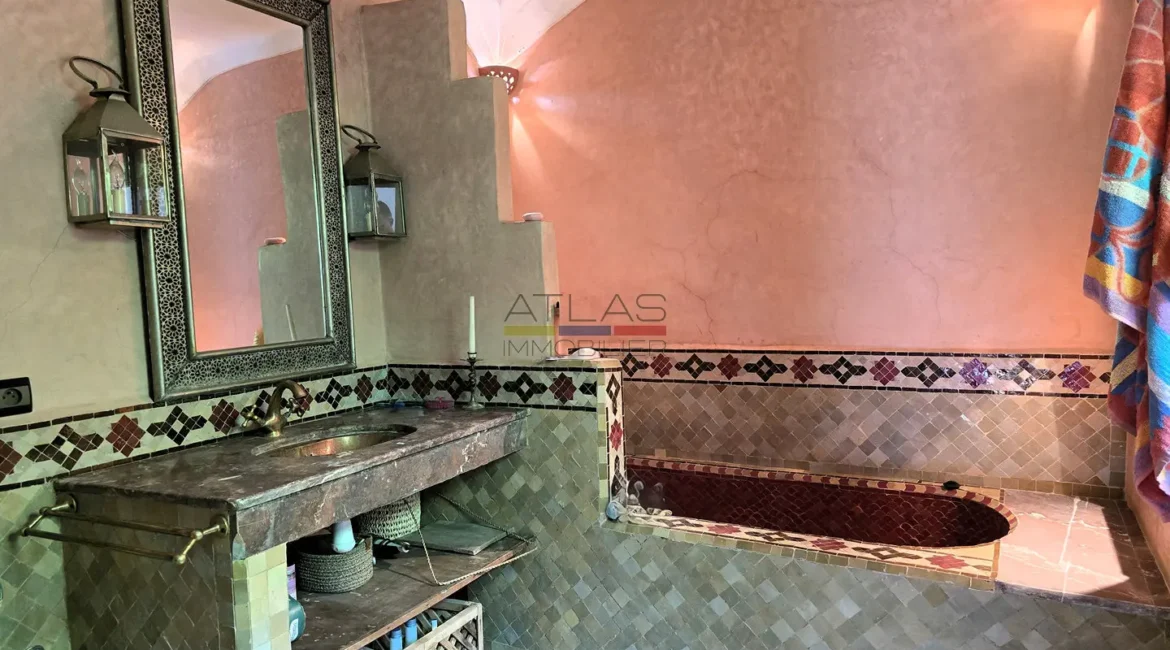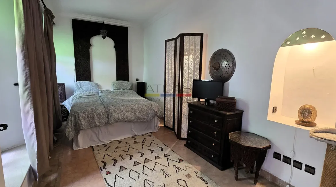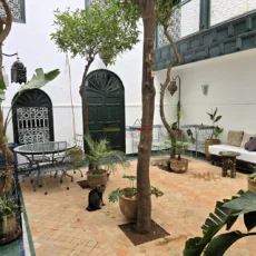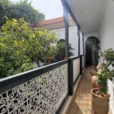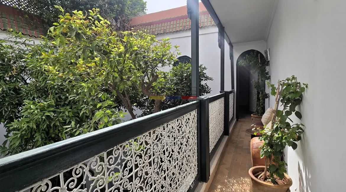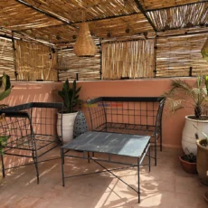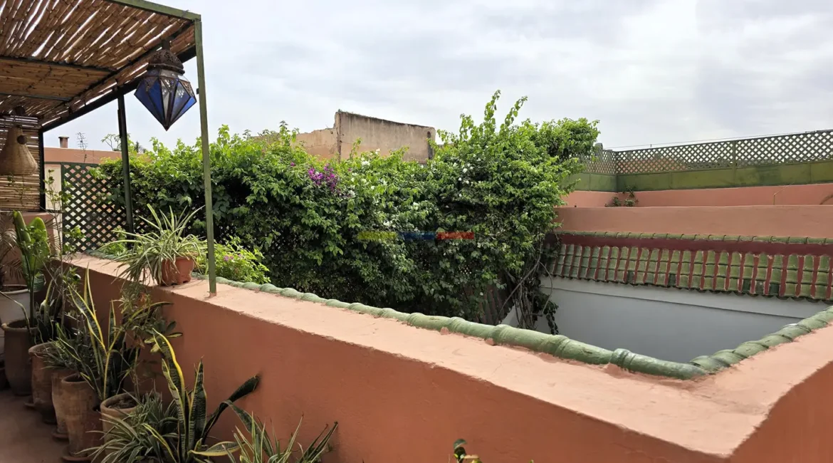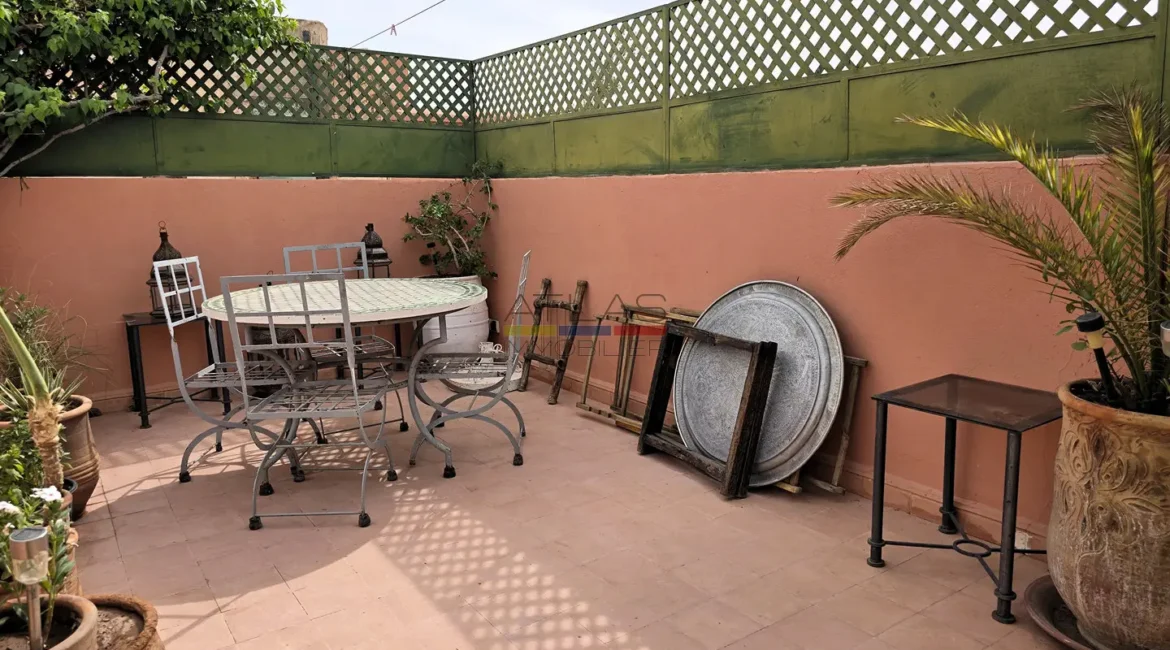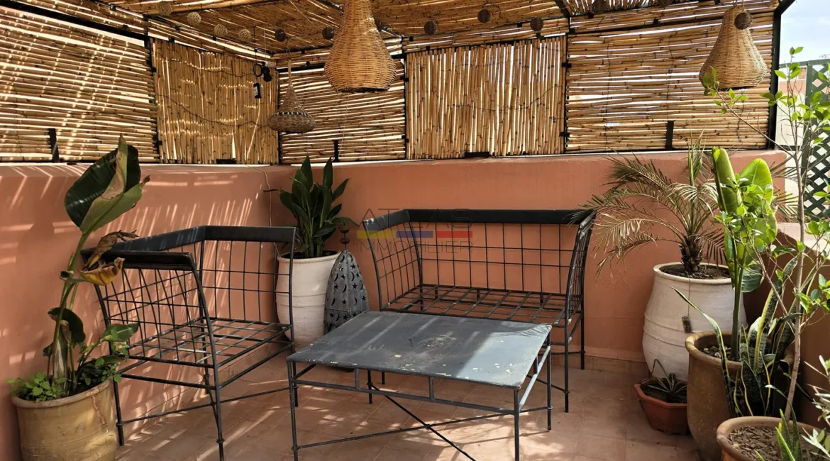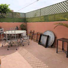 La terrasse, accessible par l’escalier intérieur, propose un agréable coin abrité idéal pour les repas en plein air, ainsi qu’un espace « solarium » invitant à la détente. L’ensemble forme un lieu de vie paisible, baigné de lumière, parfait pour une résidence principale, secondaire ou un investissement locatif dans l’un des secteurs les plus recherchés de Marrakech.