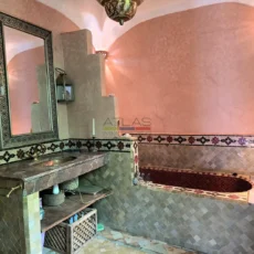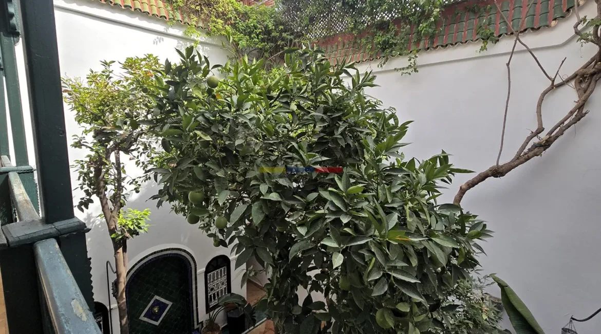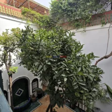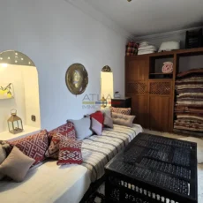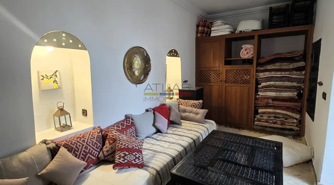 Ce riad en très bon état, d’une surface d’environ 89 m², offre une distribution harmonieuse et fonctionnelle. Au rez-de-chaussée, une entrée mène vers un patio lumineux d’environ 35 m², orné d’orangers et d’une bougainvillée, qui constitue le cœur vivant de la maison. On y trouve également une petite cuisine, des toilettes et un salon pouvant faire office de chambre. À l’étage, une chambre confortable et une salle de bains complètent l’espace nuit.