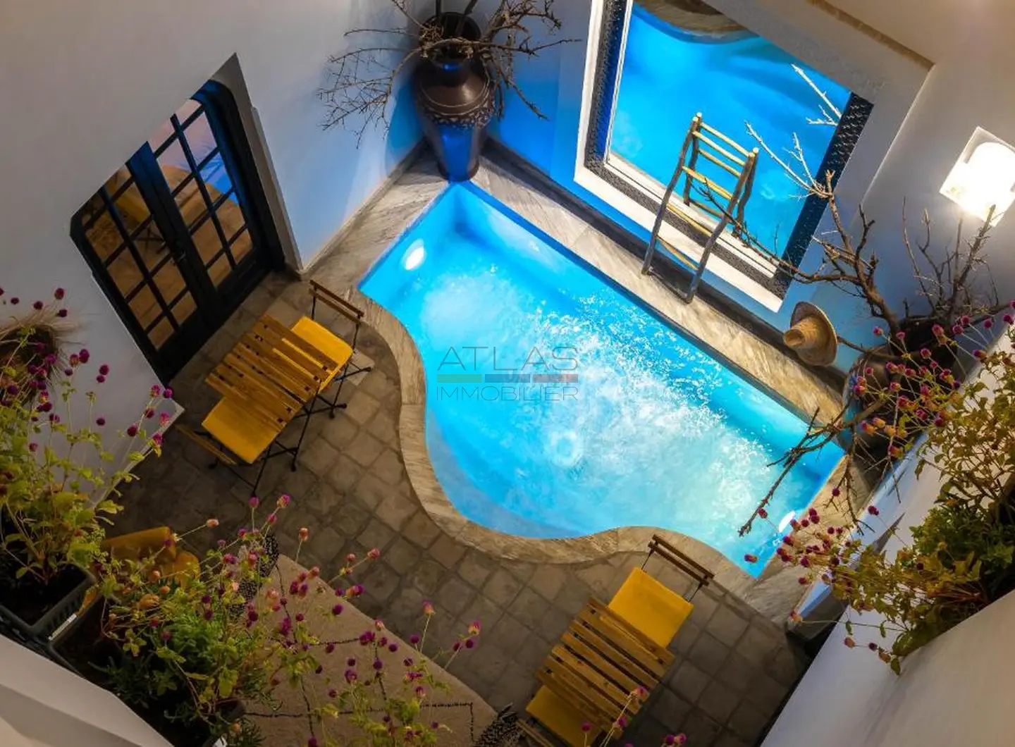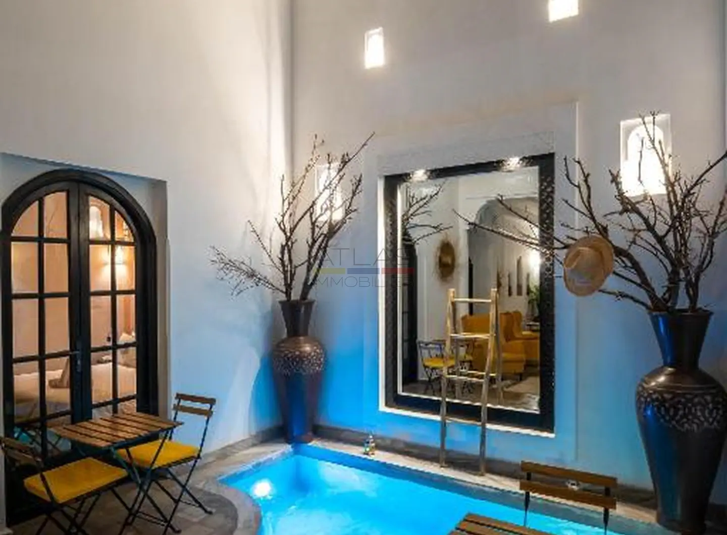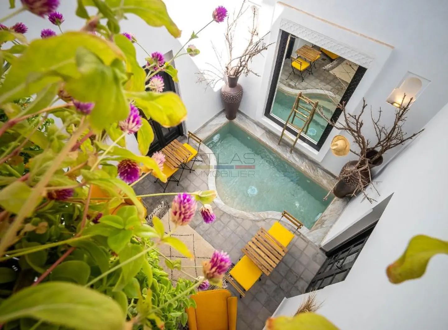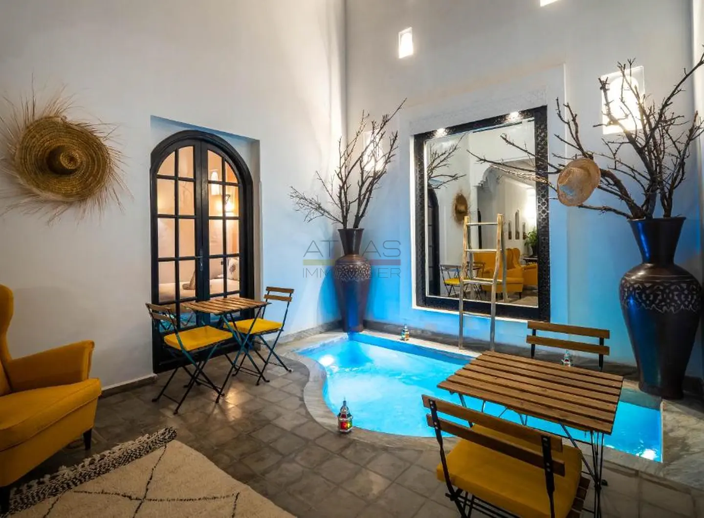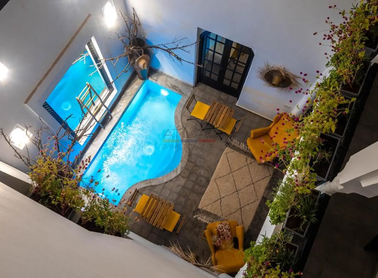 Entièrement repensé et rénové avec des matériaux nobles, le riad s’articule autour d’un superbe patio baigné de lumière, agrémenté d’une élégante piscine. Les volumes harmonieux et le raffinement des finitions créent une atmosphère apaisante, idéale pour une résidence privée ou la poursuite de l’activité de maison d’hôtes de standing.