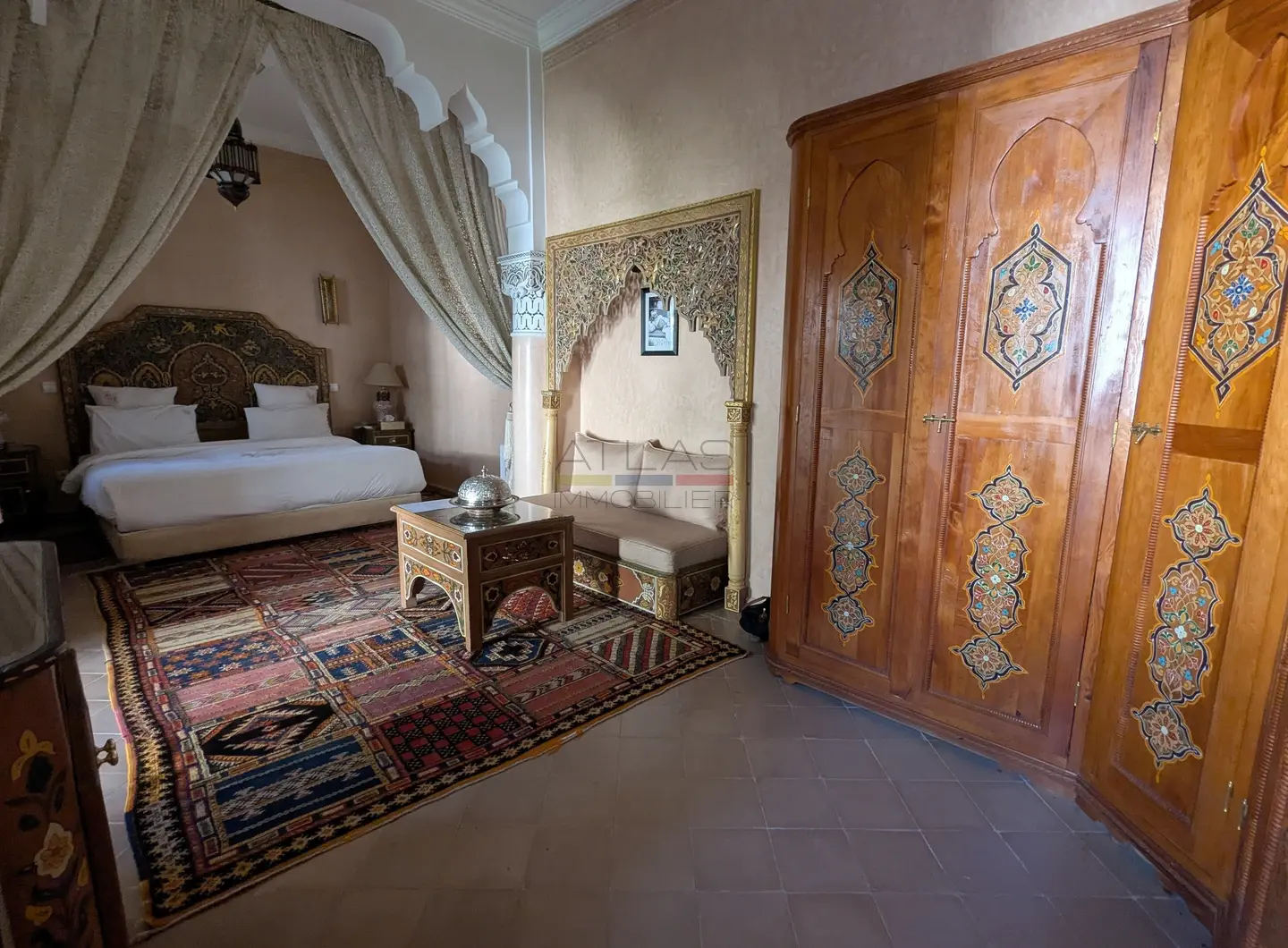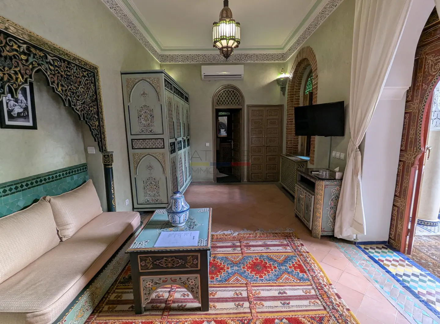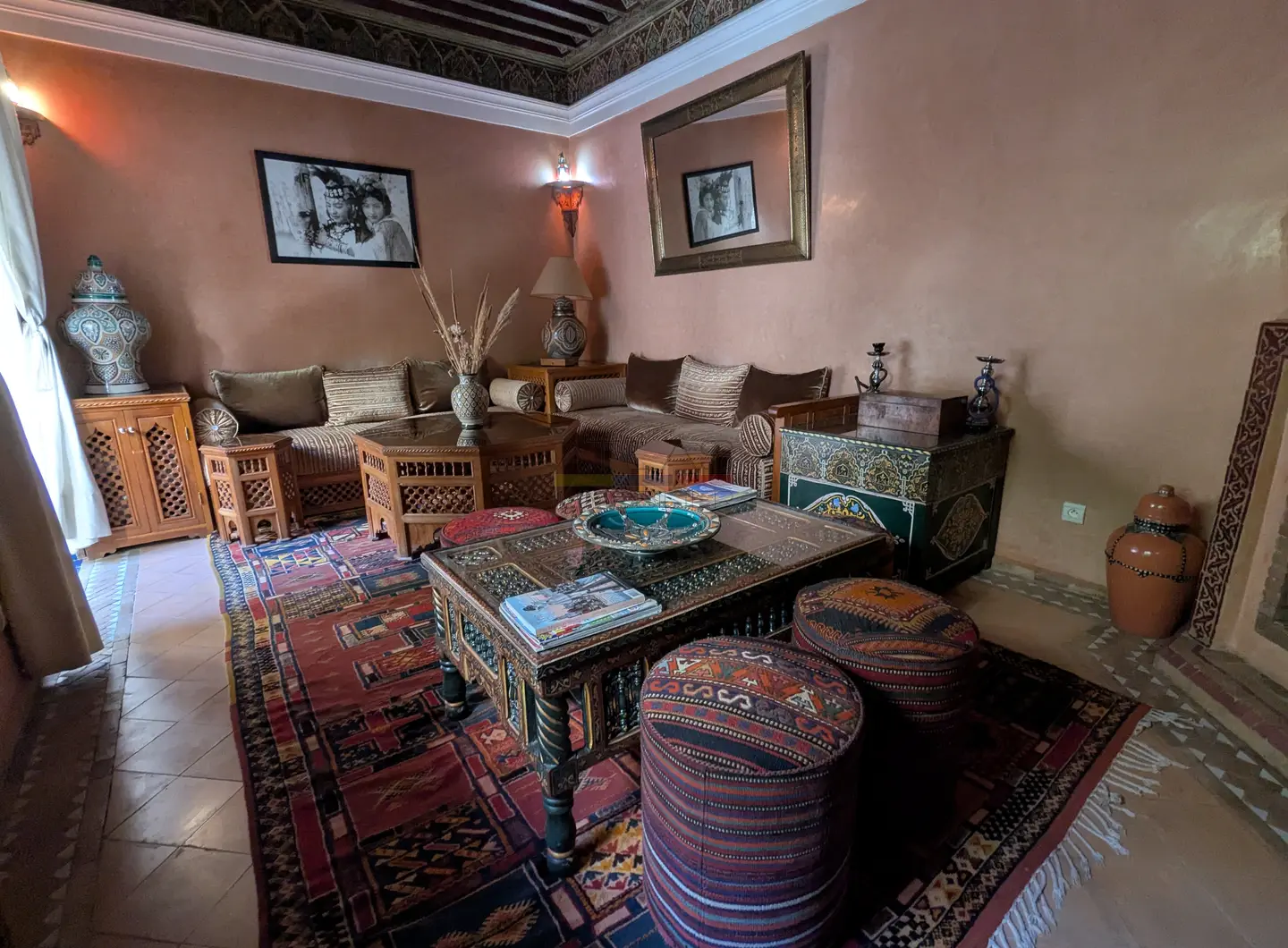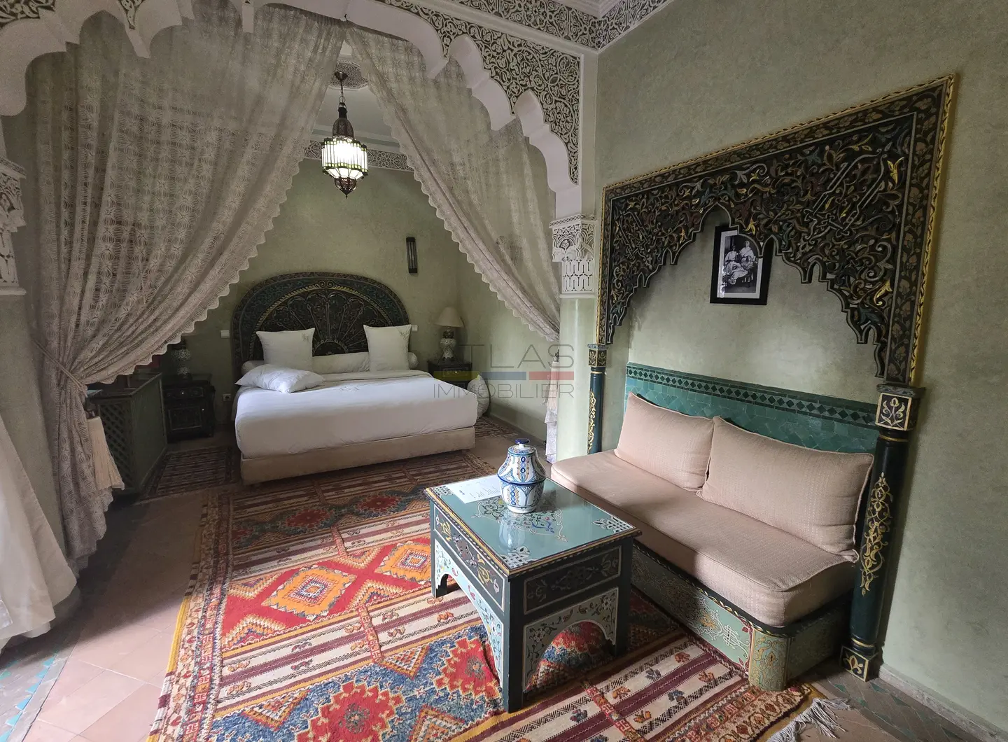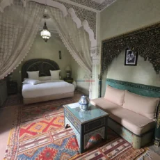 Cette propriété se distingue par une configuration unique : il s’agit de deux riads disposant chacun de leur propre titre de propriété, habilement réunis pour former un ensemble harmonieux et spacieux de 464 m² habitables.