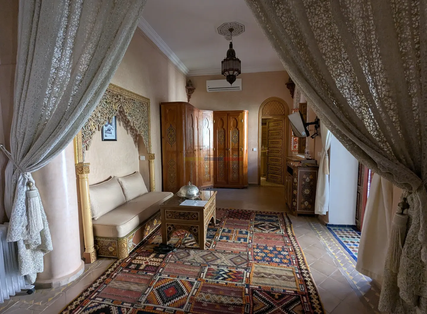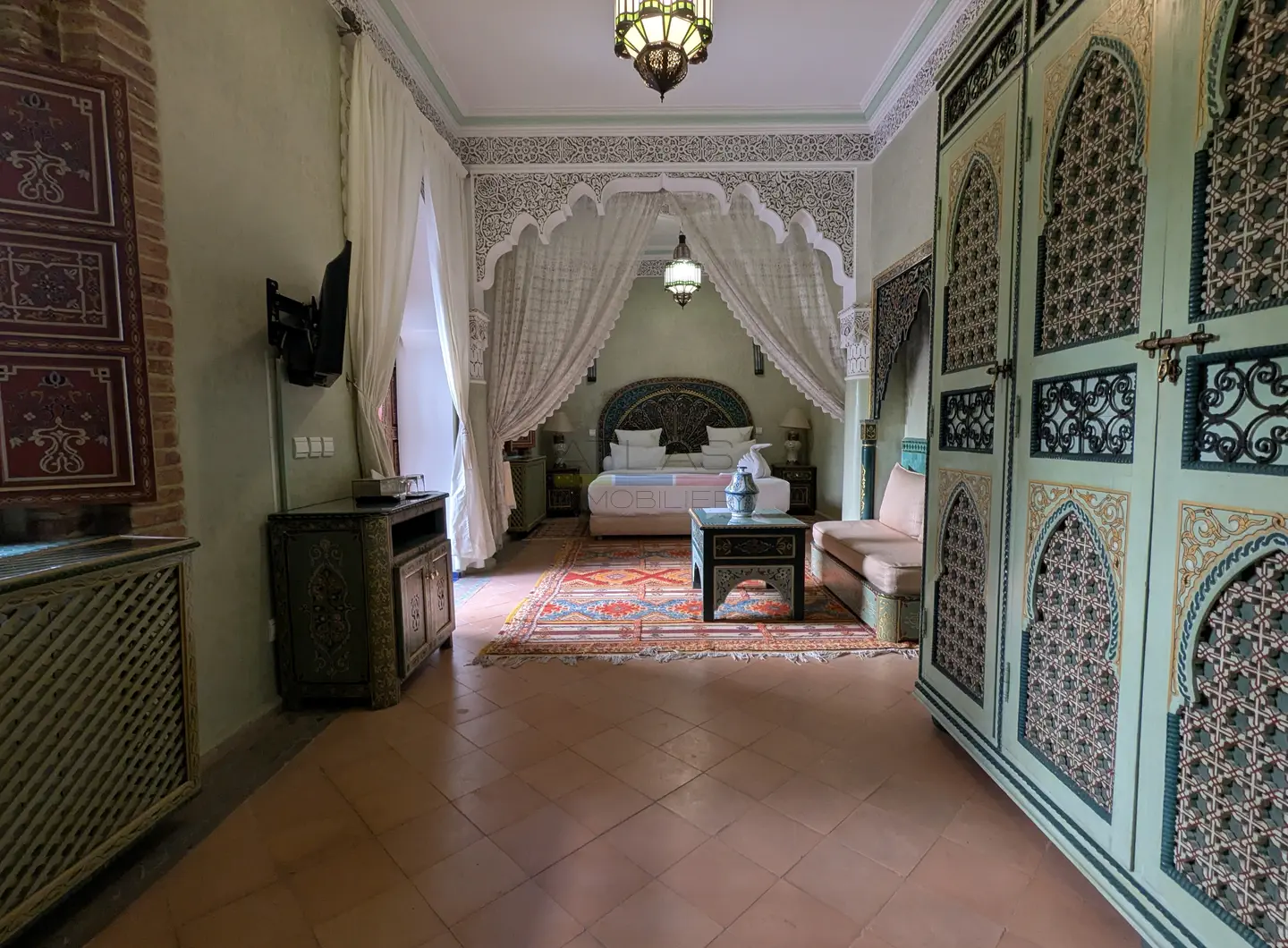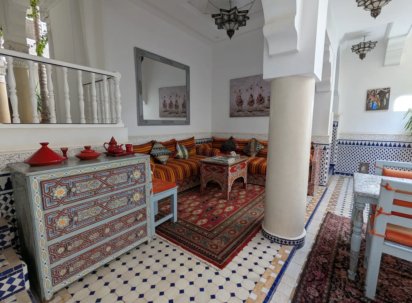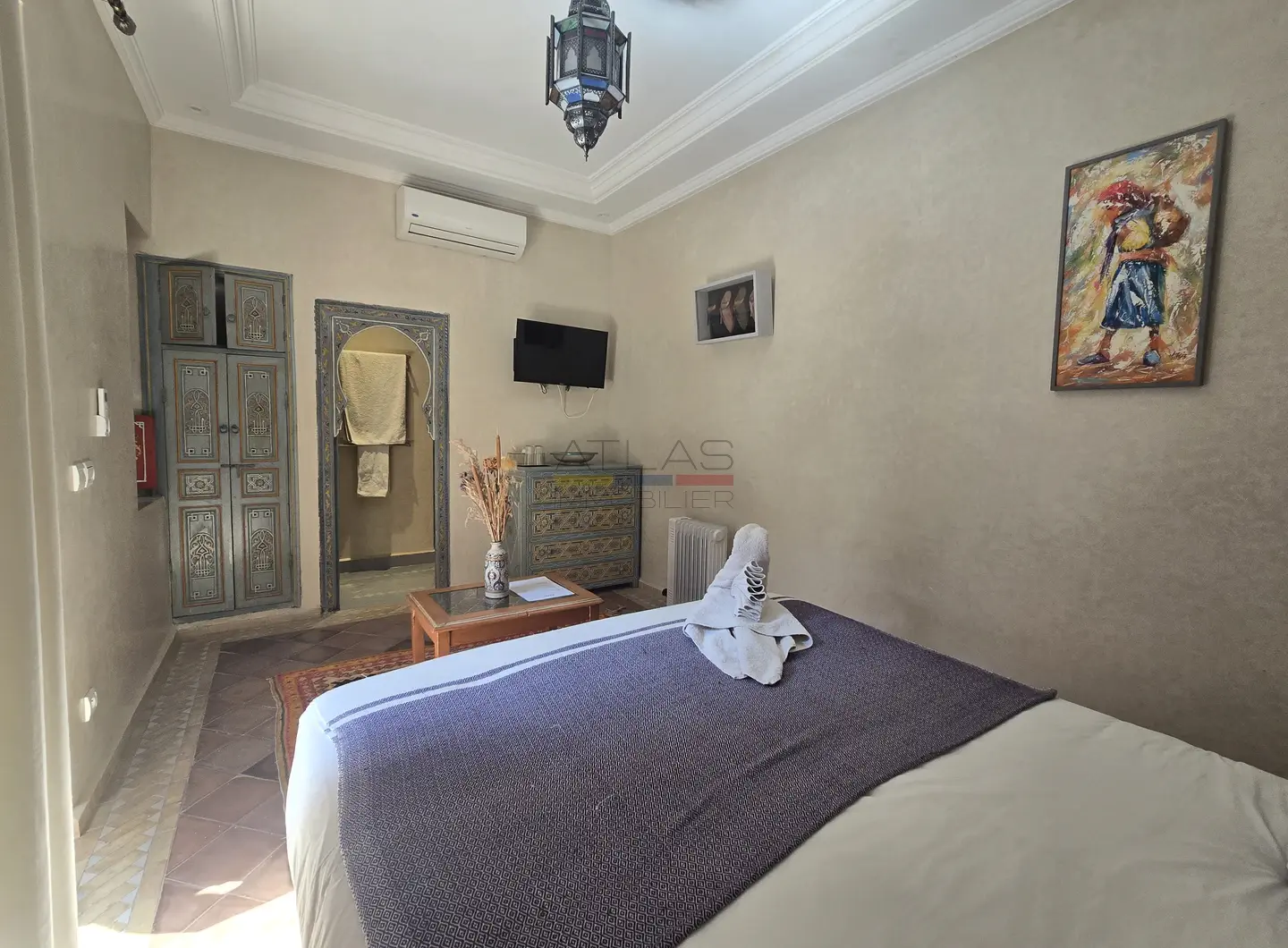 Cette propriété se distingue par une configuration unique : il s’agit de deux riads disposant chacun de leur propre titre de propriété, habilement réunis pour former un ensemble harmonieux et spacieux de 464 m² habitables.