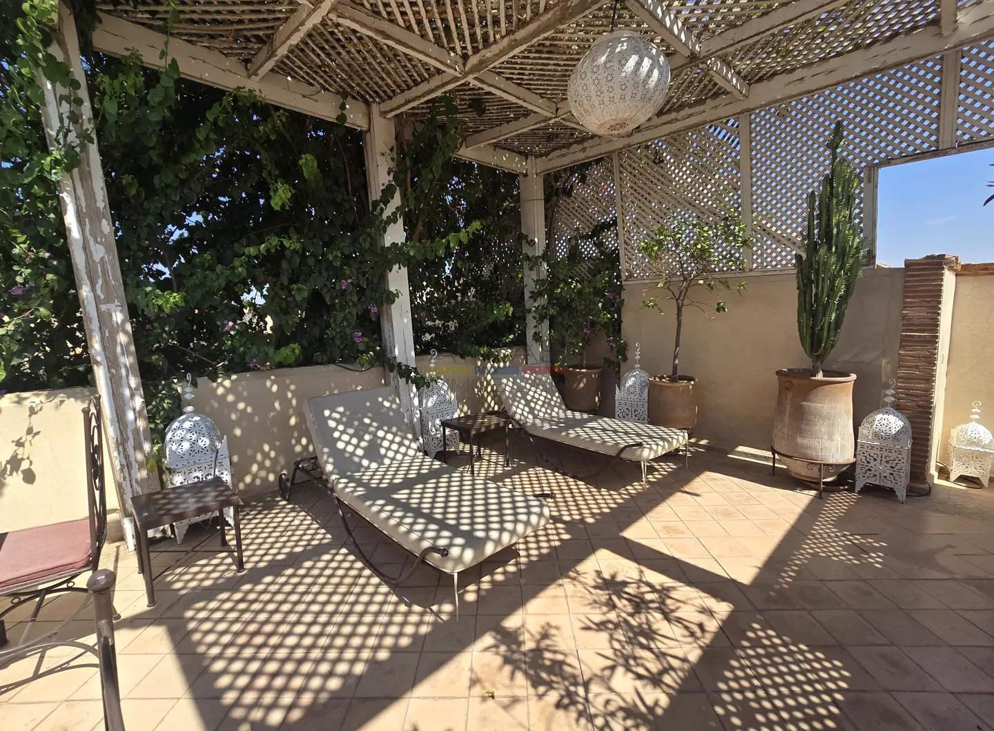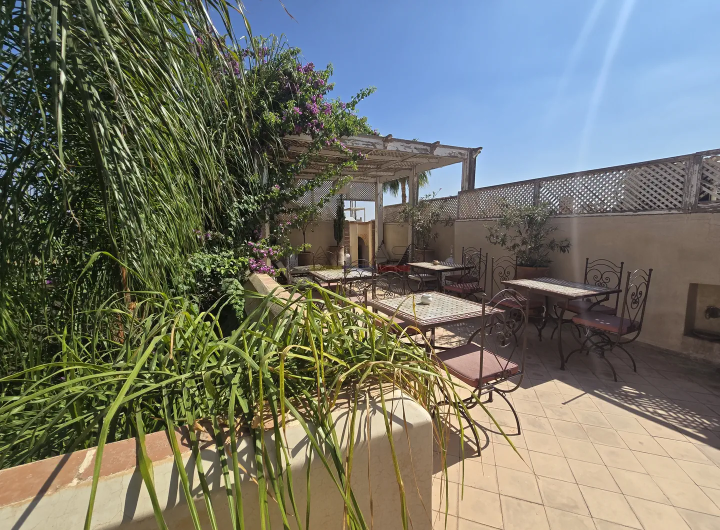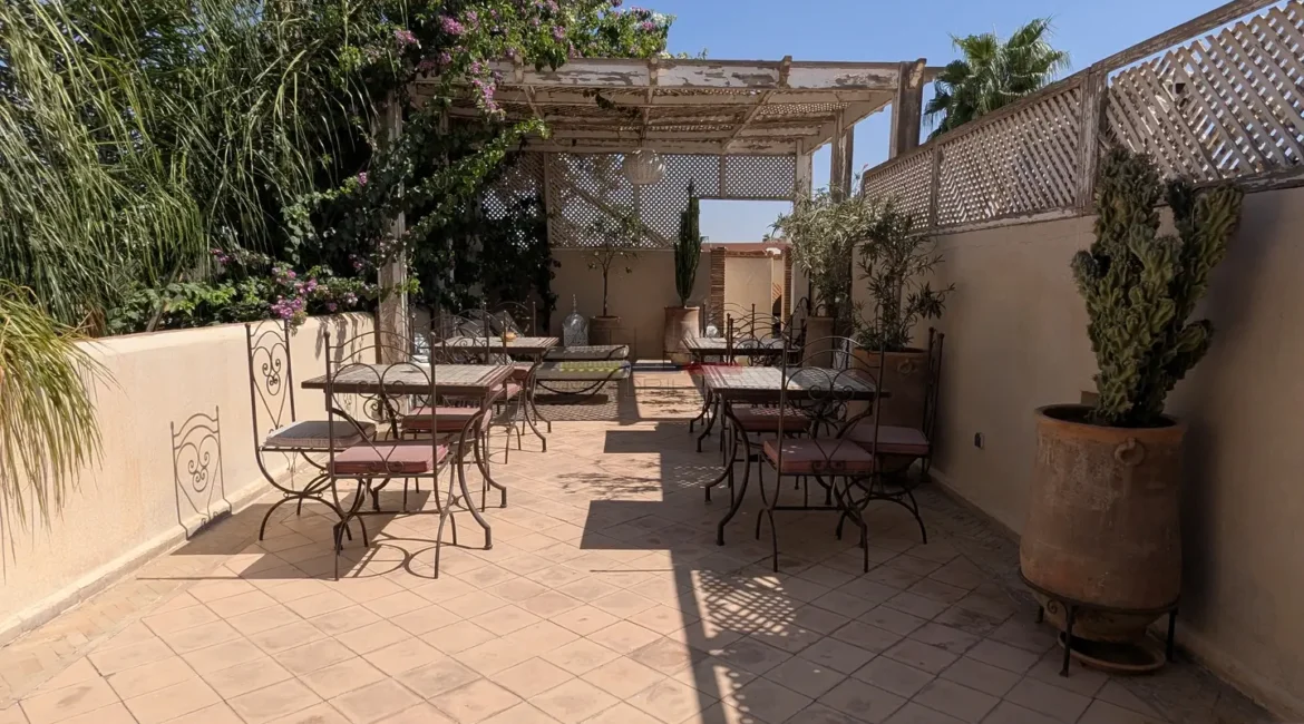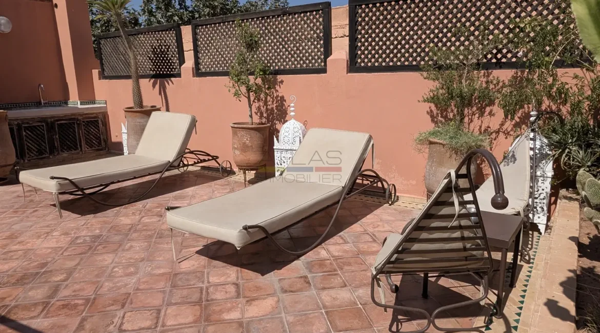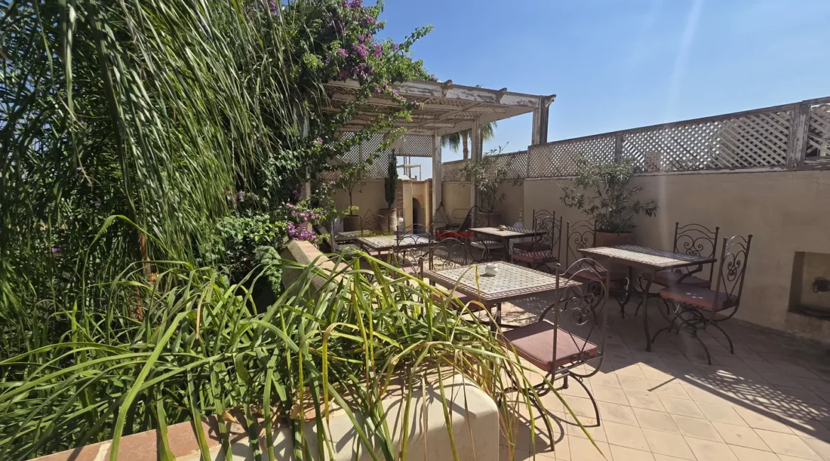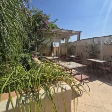 L’ensemble s’organise autour de 114 m² de patios verdoyants ornés de fontaines traditionnelles et de 176 m² de terrasses baignées de lumière, offrant plusieurs espaces de détente et de convivialité.