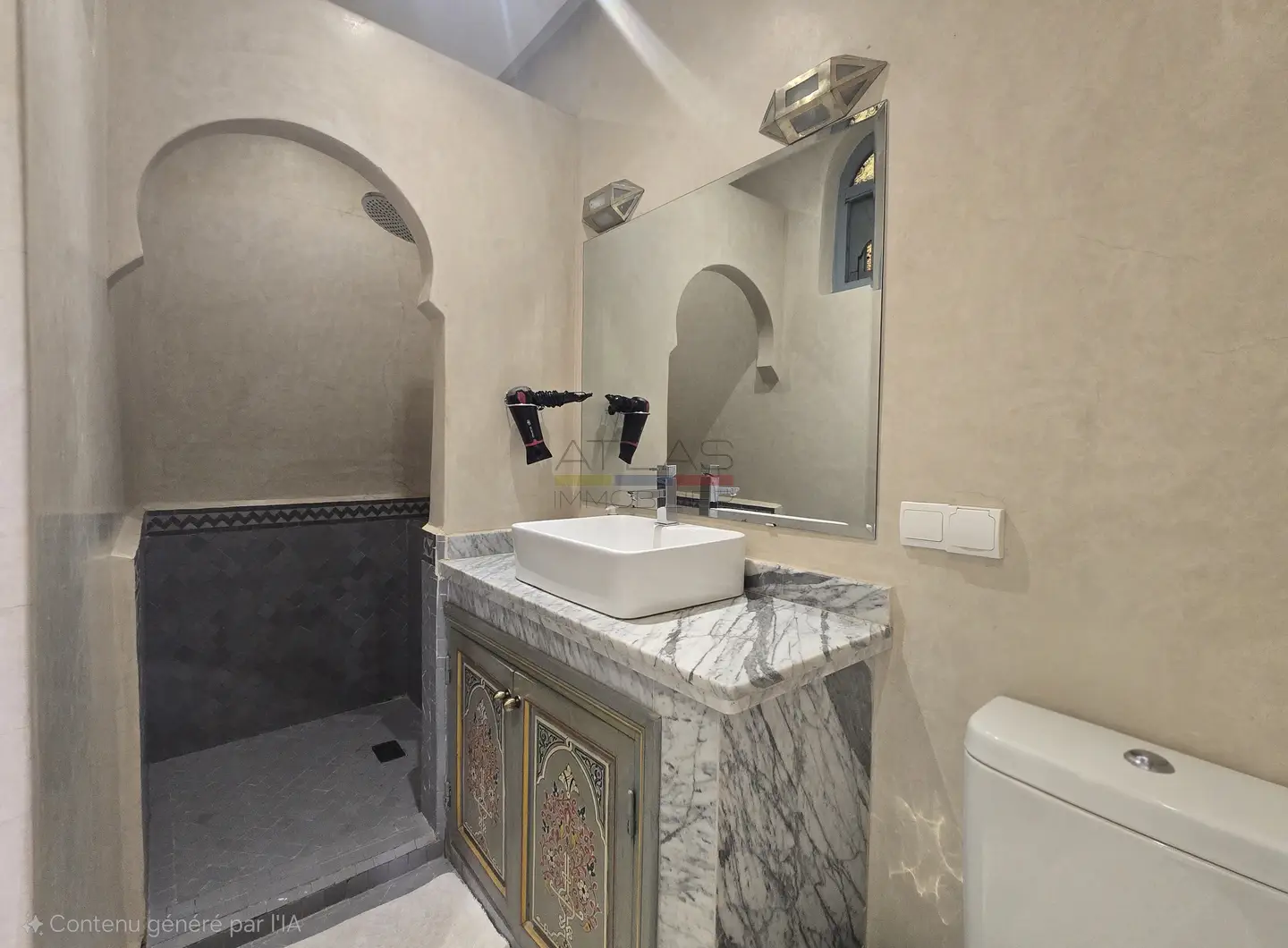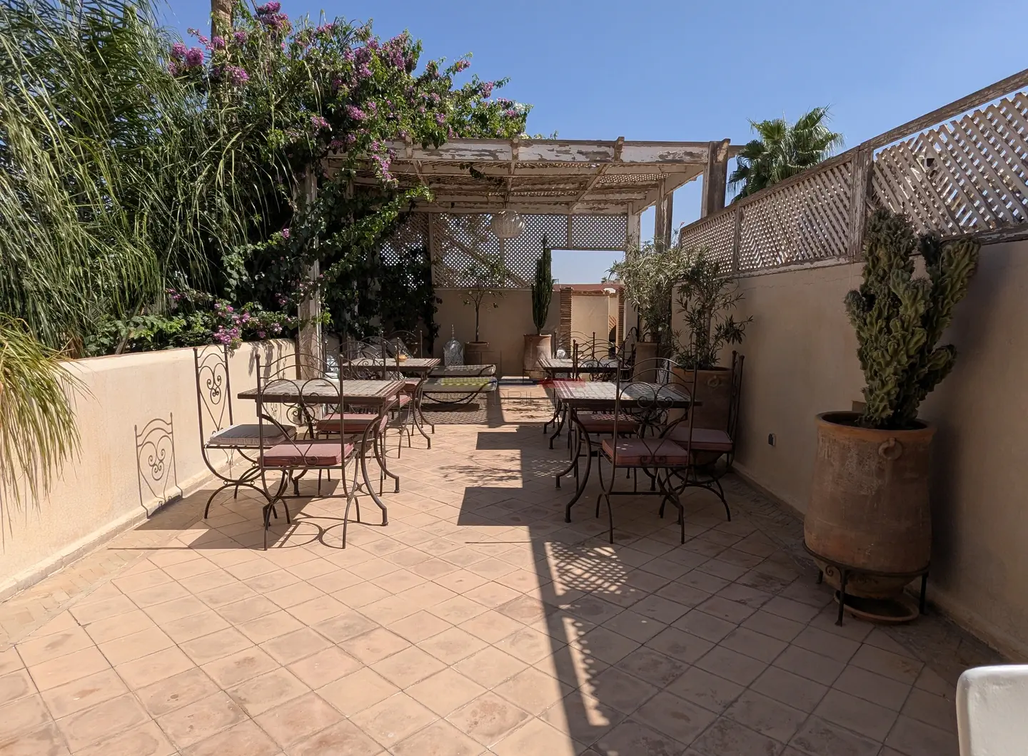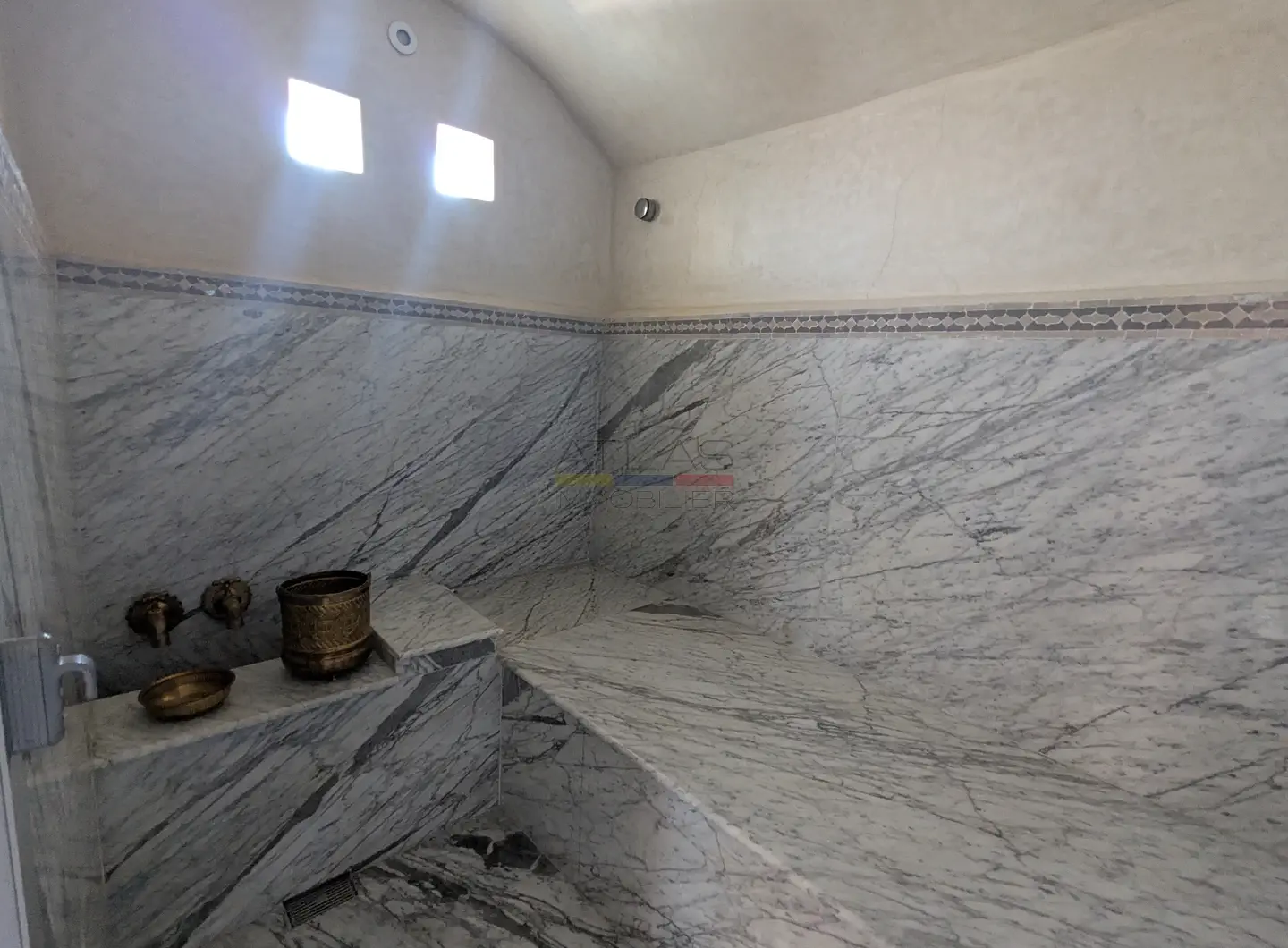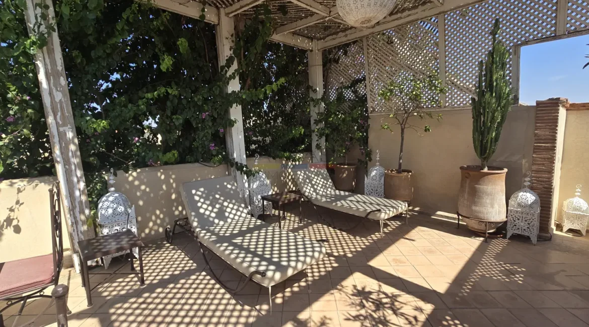 L’ensemble s’organise autour de 114 m² de patios verdoyants ornés de fontaines traditionnelles et de 176 m² de terrasses baignées de lumière, offrant plusieurs espaces de détente et de convivialité.