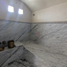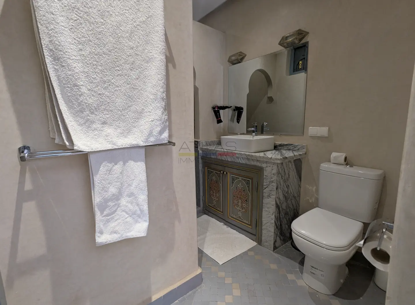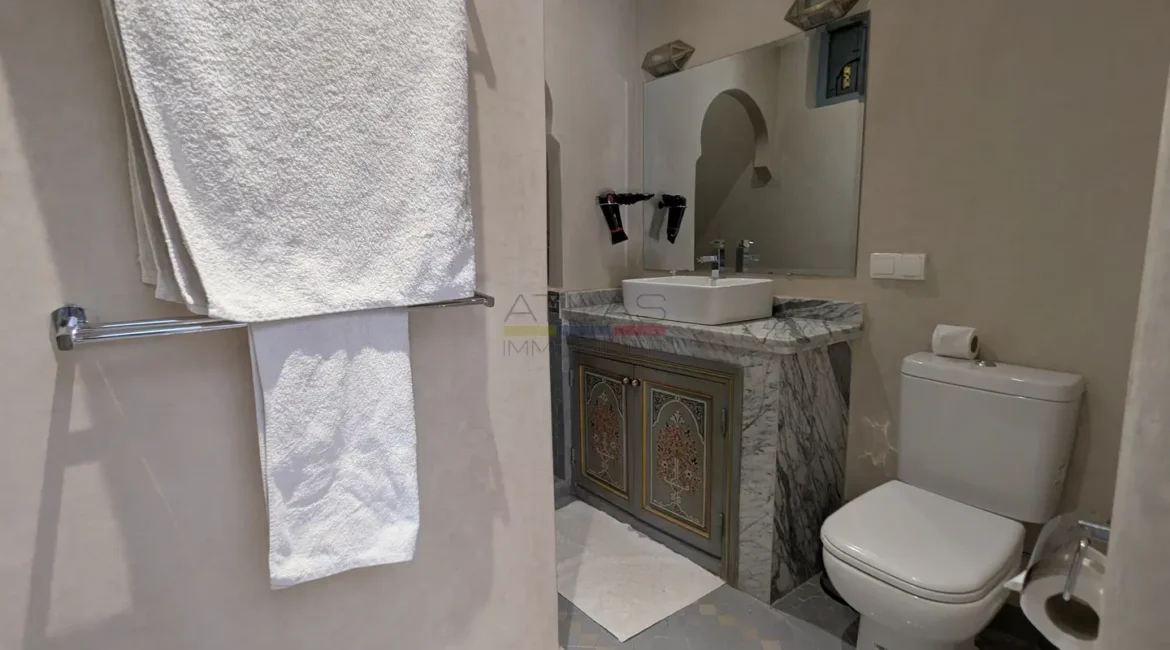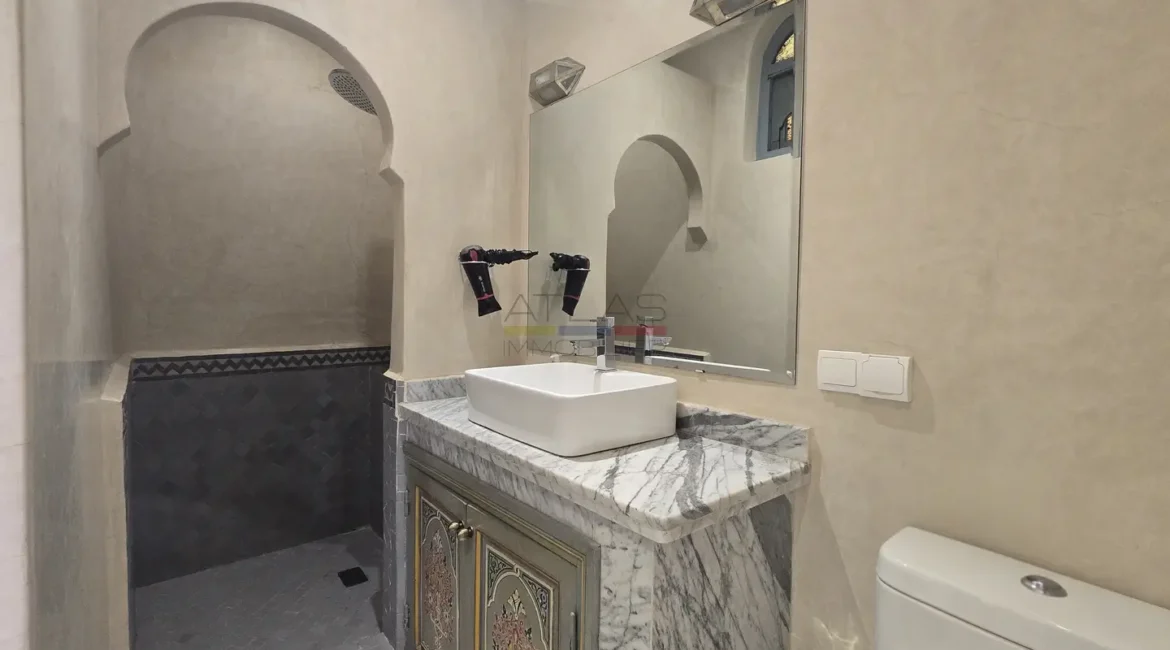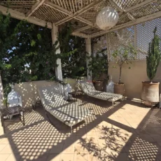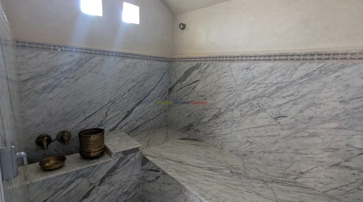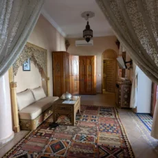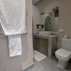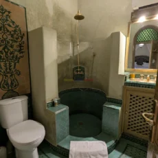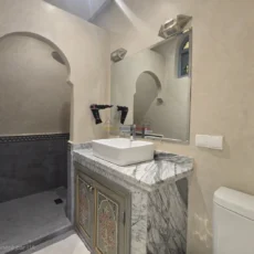 Le second riad, tout aussi raffiné, dispose d’un patio à fontaine murale, d’un salon ouvert et d’une chambre en rez-de-chaussée, complétés à l’étage par trois chambres avec salles d’eau privatives. Sur la terrasse, une buanderie et un hammam beldi complètent cet espace pensé pour le confort et la détente.