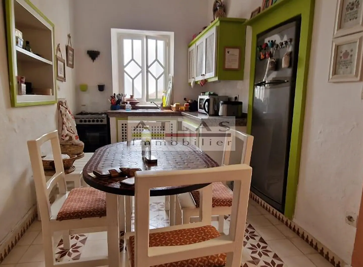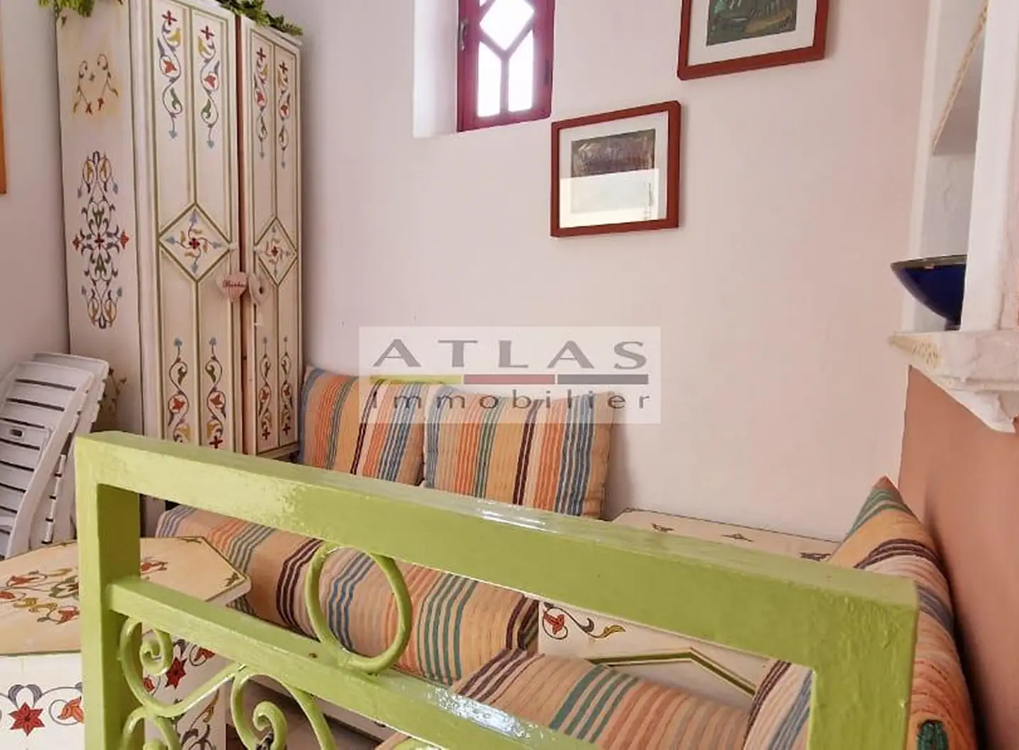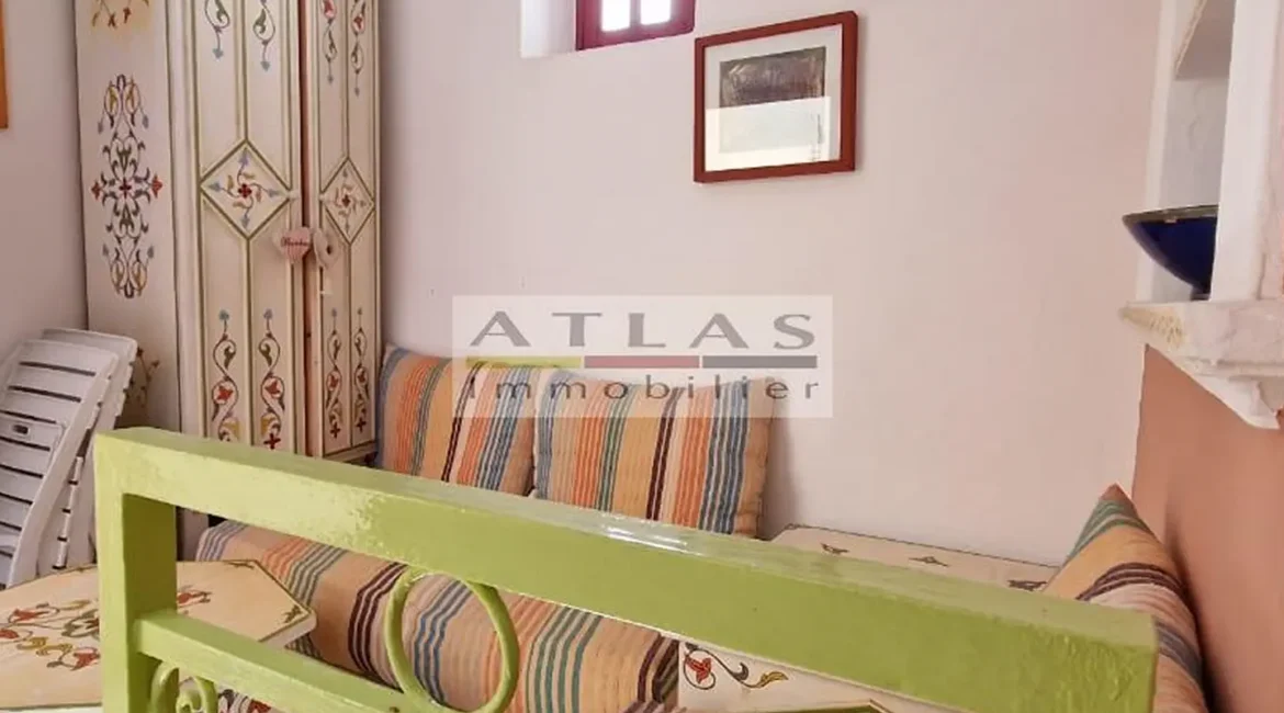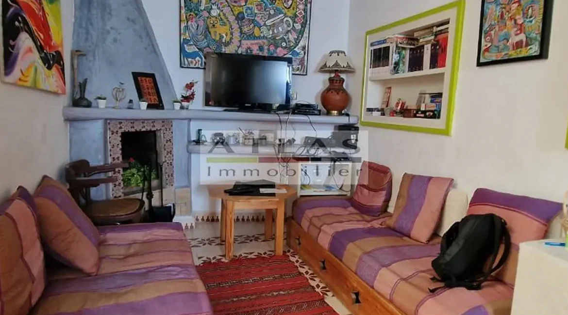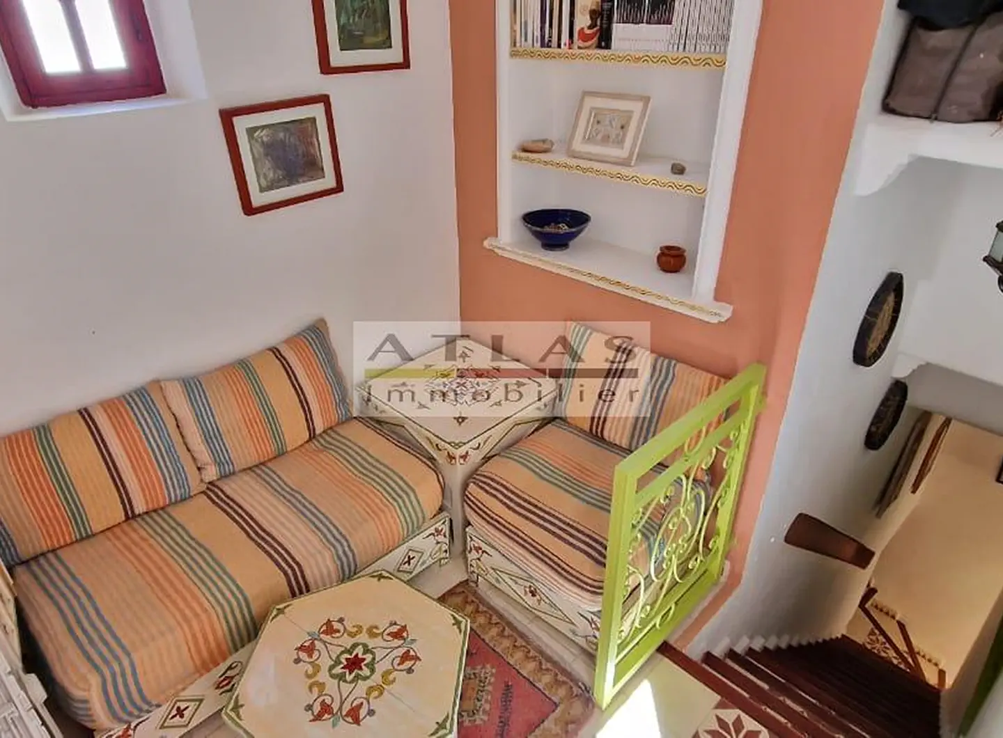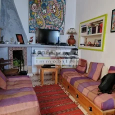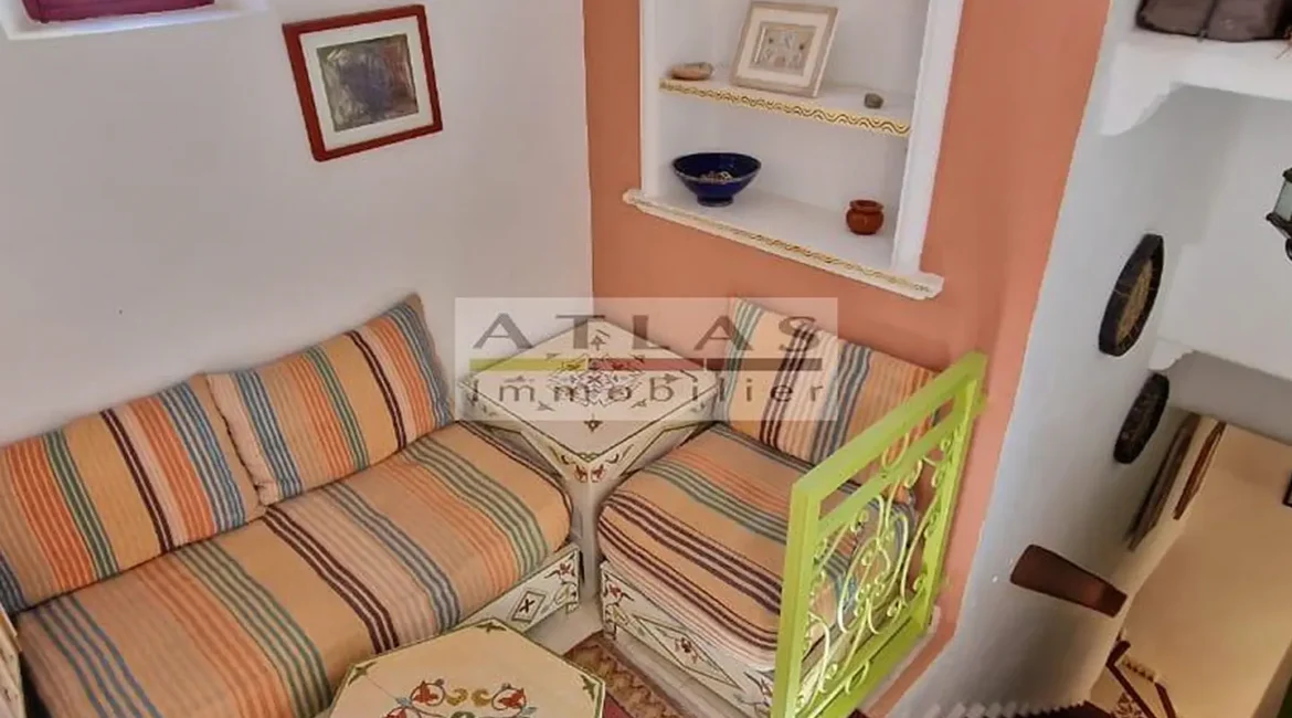 Le deuxième étage, d’une surface de 32 m², comprenait un coin salon agréable, une terrasse propice à la détente, ainsi qu’une chambre avec salle de douche et toilettes. Enfin, le toit-terrasse de 21 m², encore non accessible, offrait un fort potentiel d’aménagement avec vue panoramique sur les toits d’Essaouira.