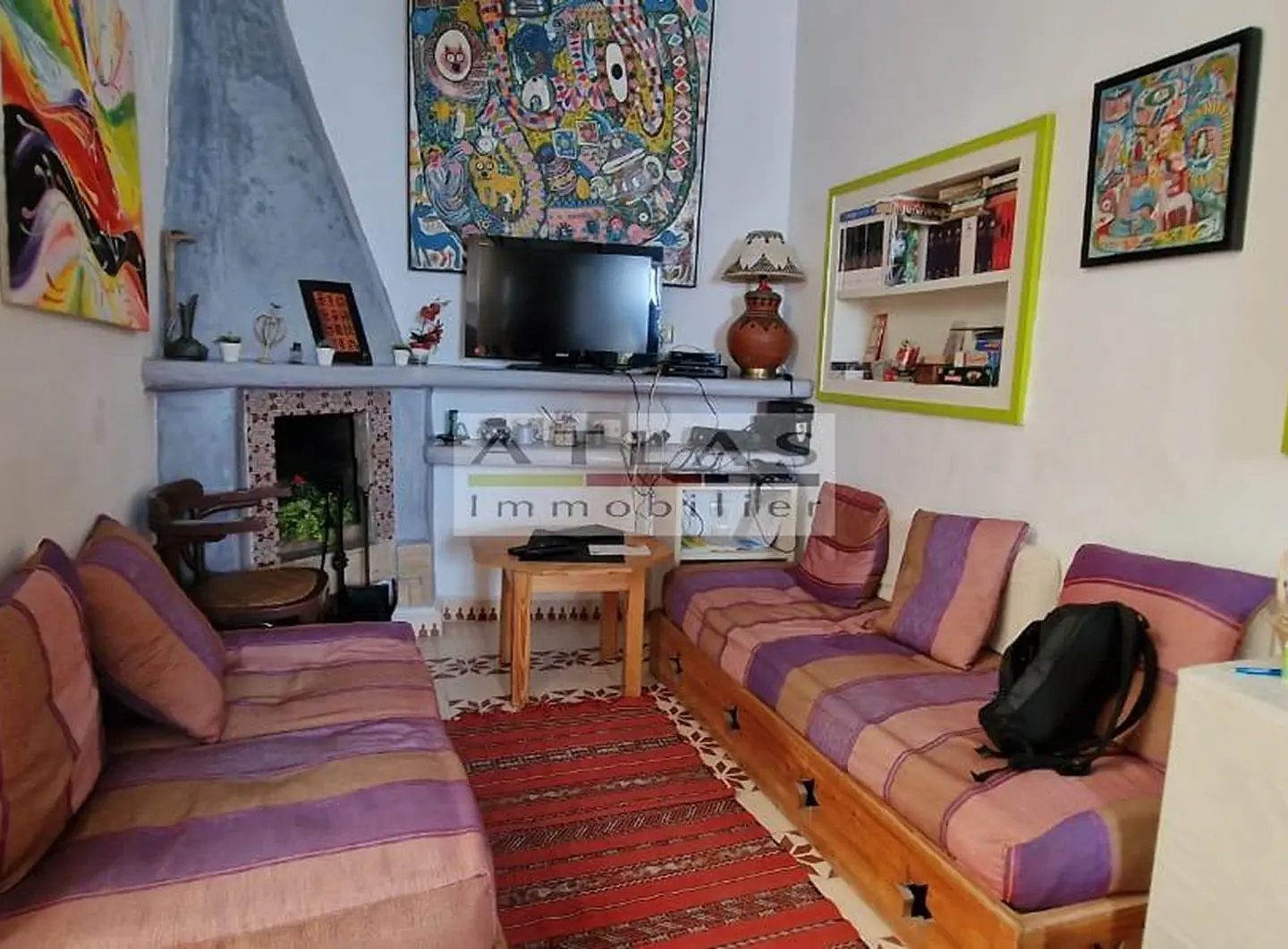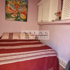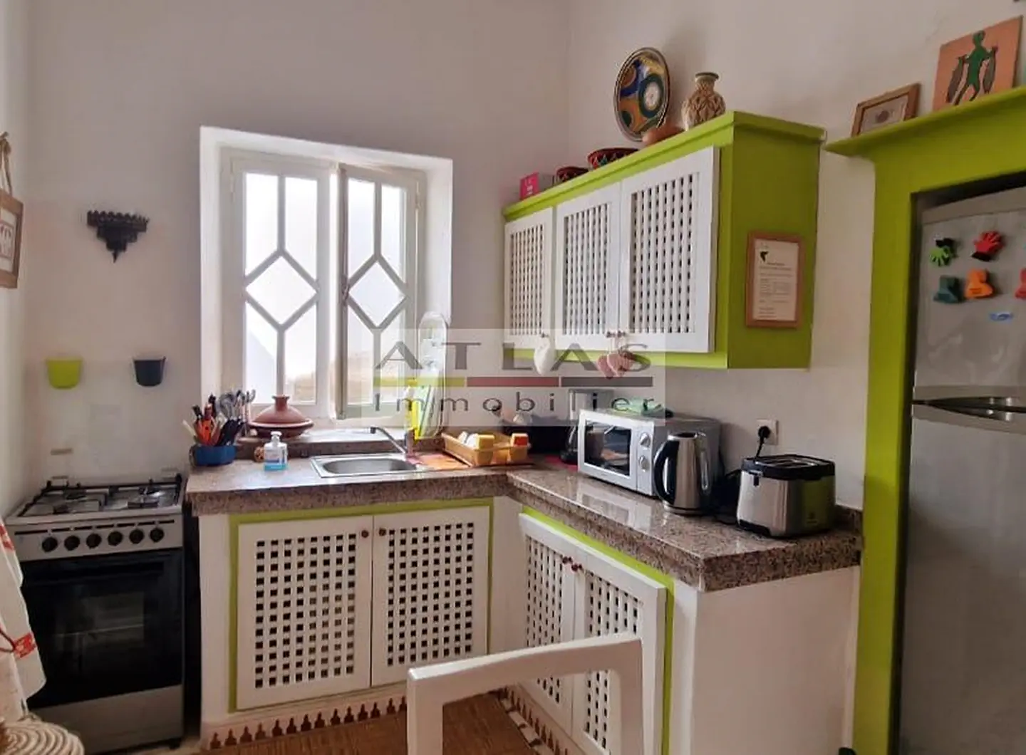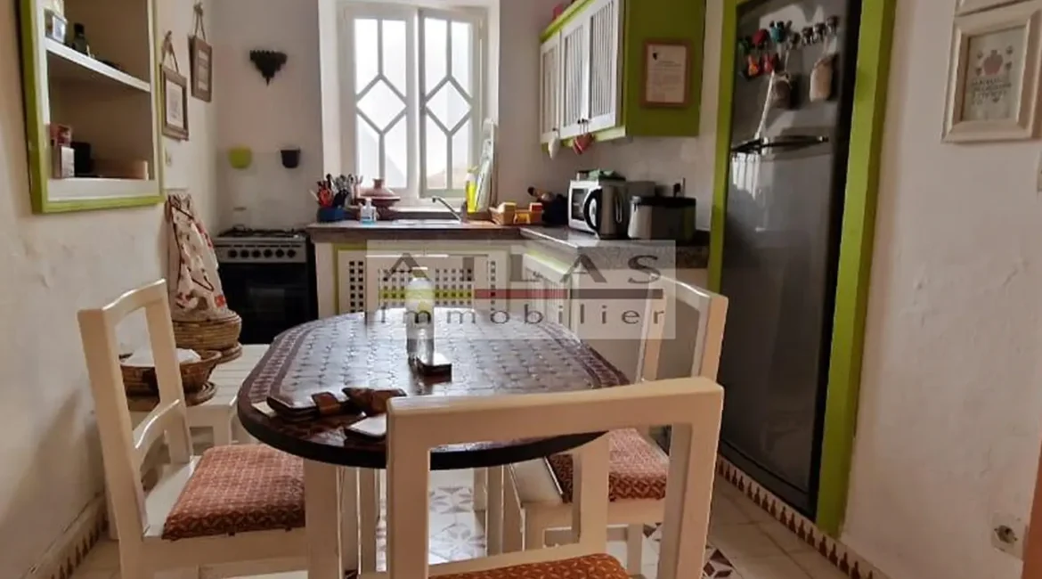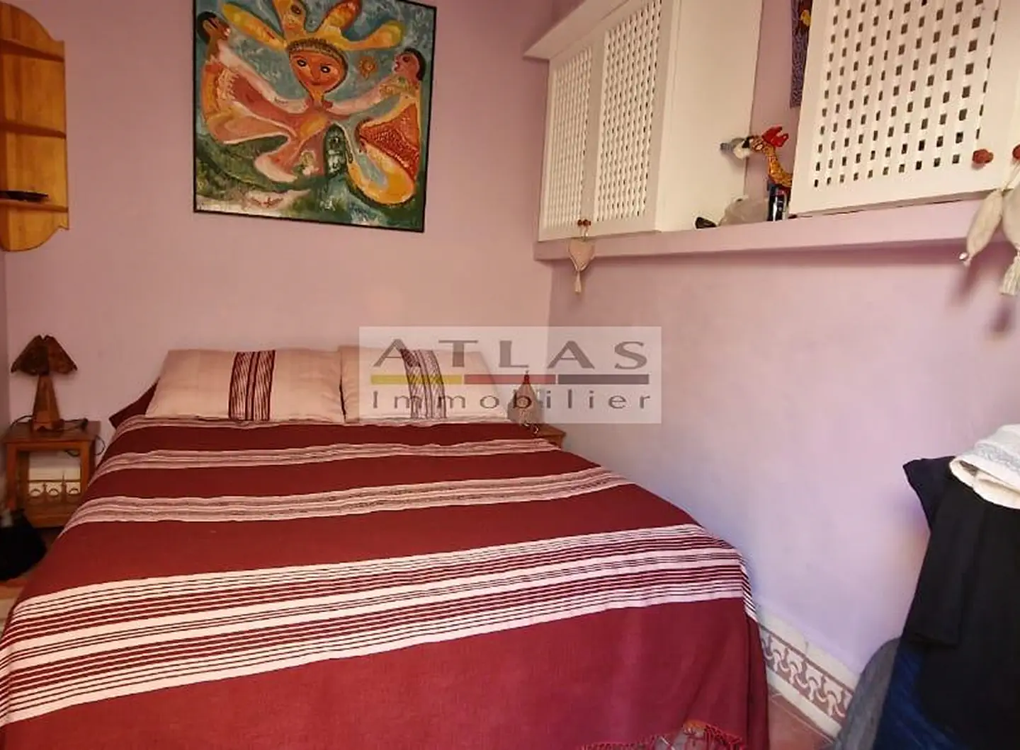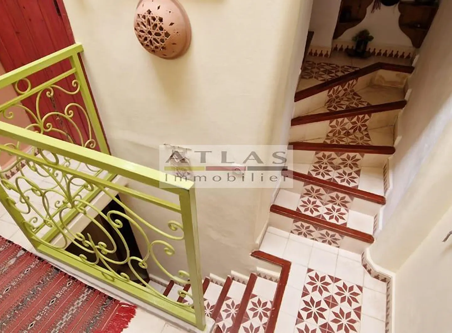 Le deuxième étage, d’une surface de 32 m², comprenait un coin salon agréable, une terrasse propice à la détente, ainsi qu’une chambre avec salle de douche et toilettes. Enfin, le toit-terrasse de 21 m², encore non accessible, offrait un fort potentiel d’aménagement avec vue panoramique sur les toits d’Essaouira.