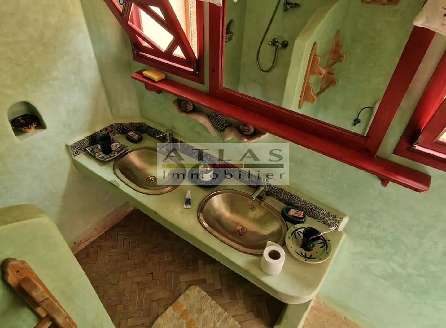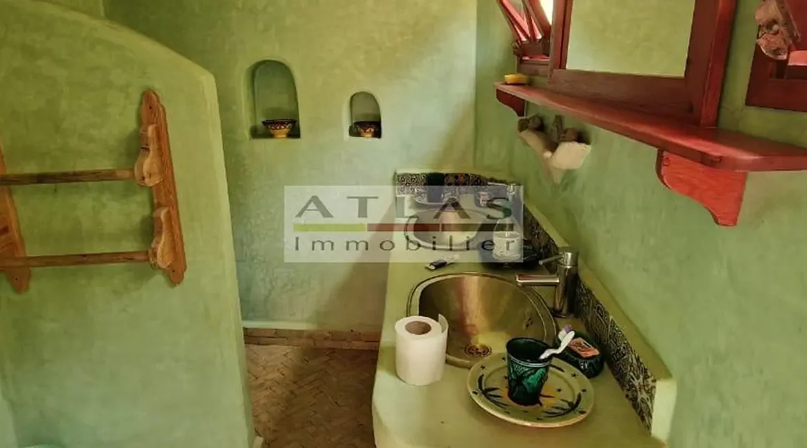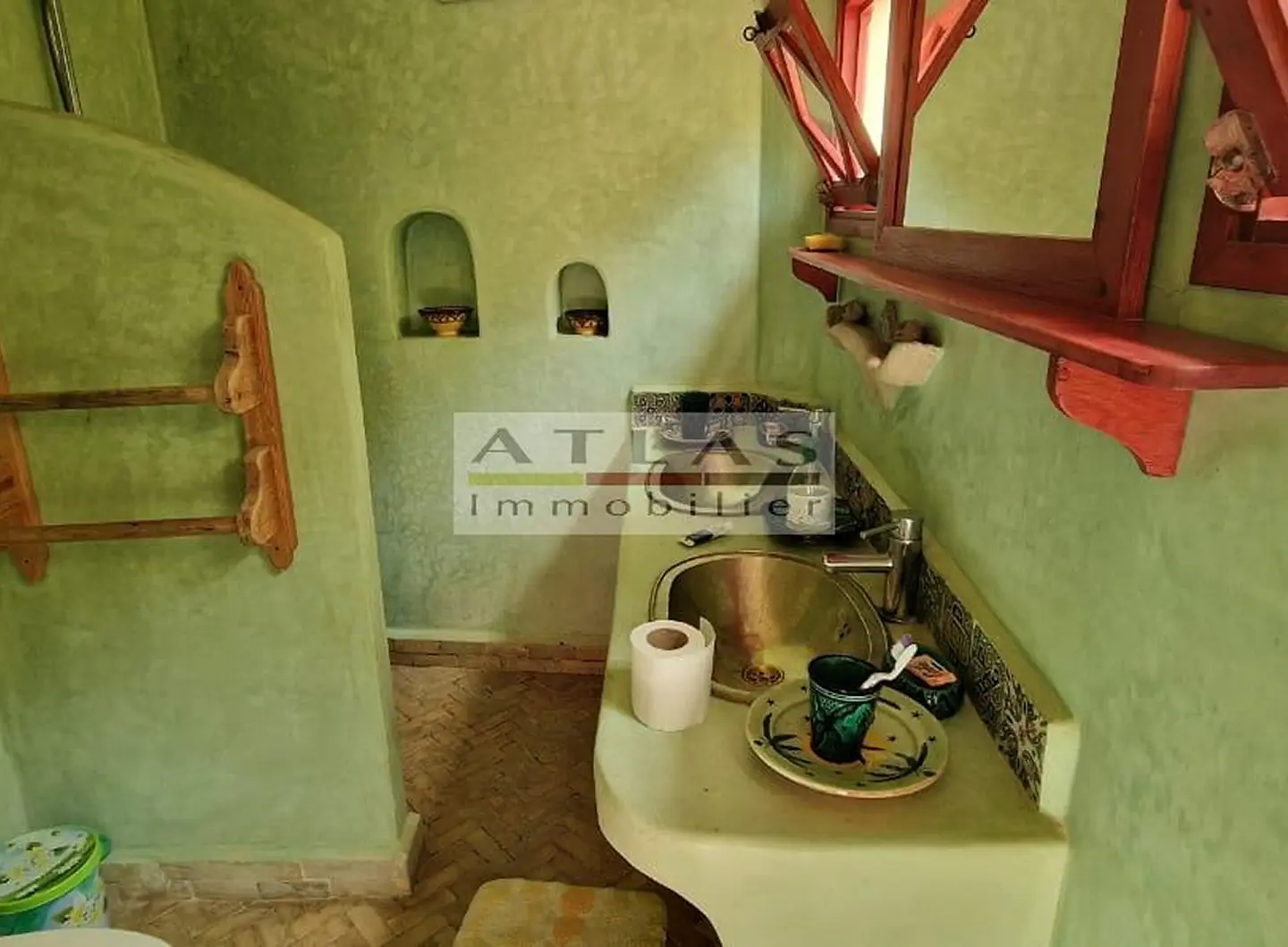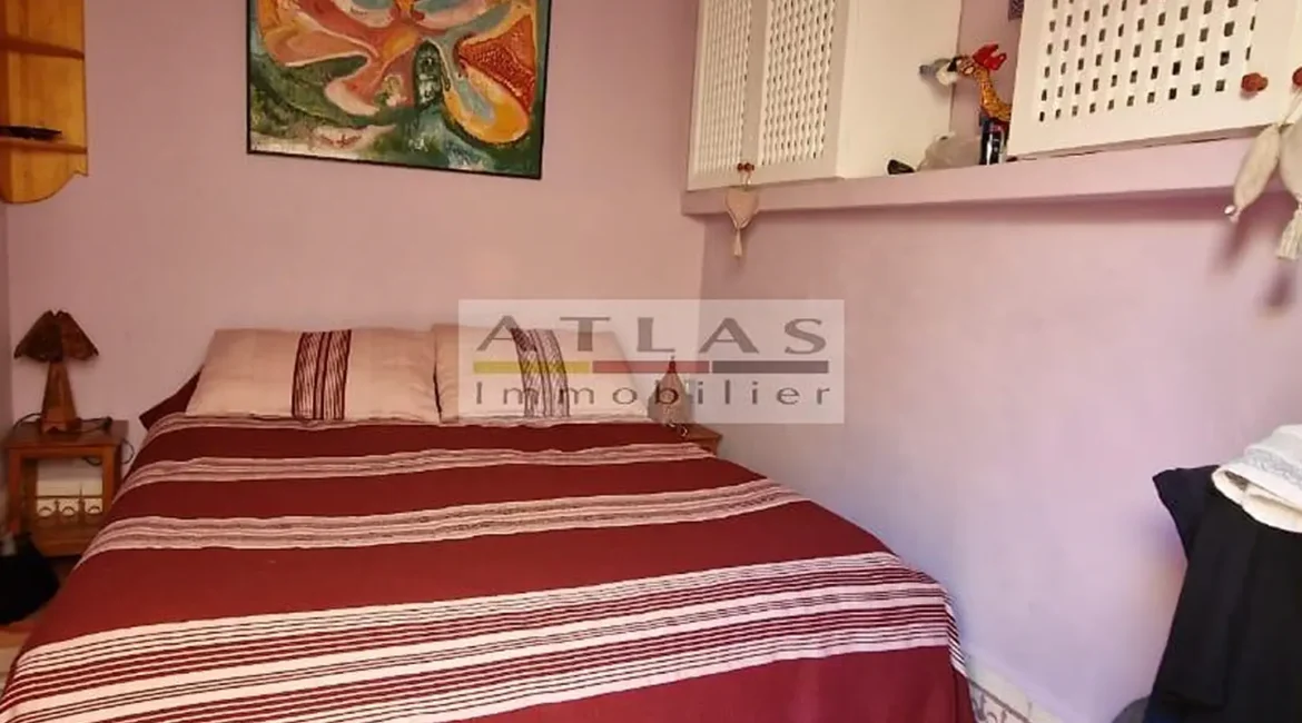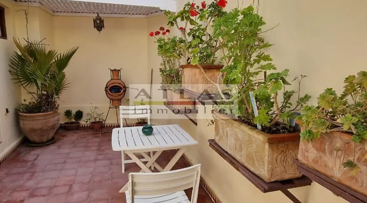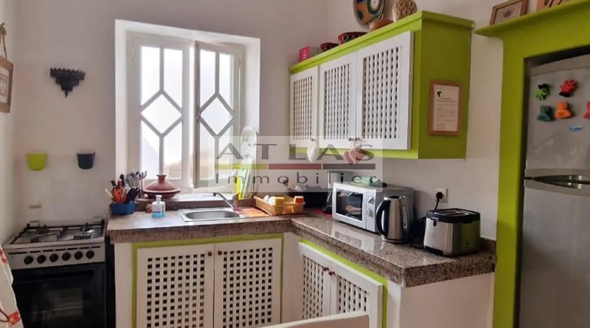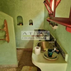 Le deuxième étage, d’une surface de 32 m², comprenait un coin salon agréable, une terrasse propice à la détente, ainsi qu’une chambre avec salle de douche et toilettes. Enfin, le toit-terrasse de 21 m², encore non accessible, offrait un fort potentiel d’aménagement avec vue panoramique sur les toits d’Essaouira.