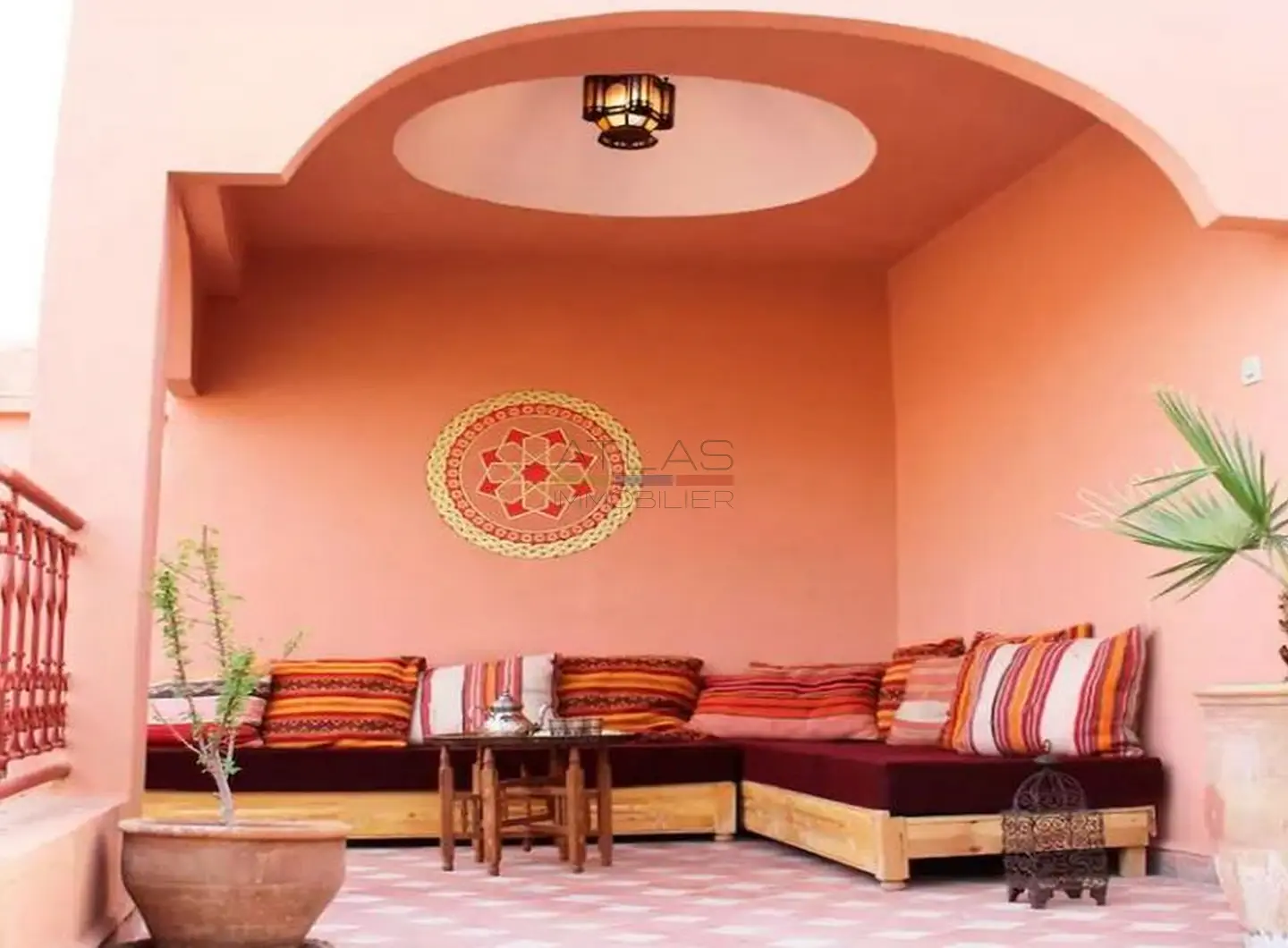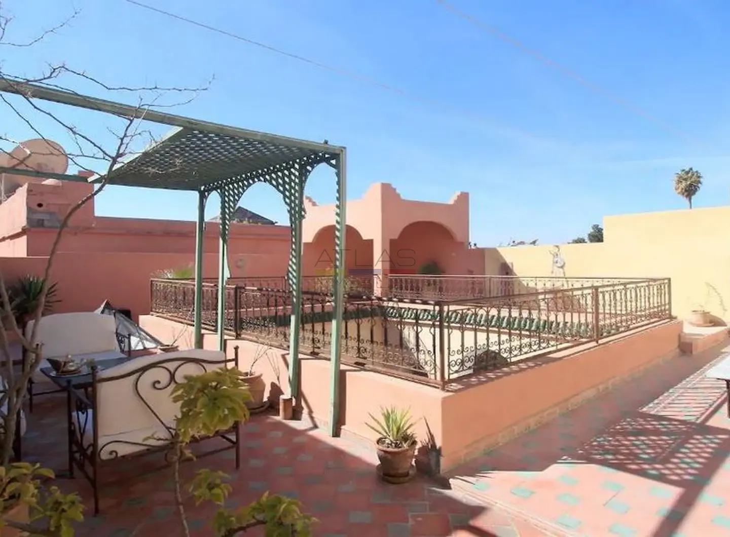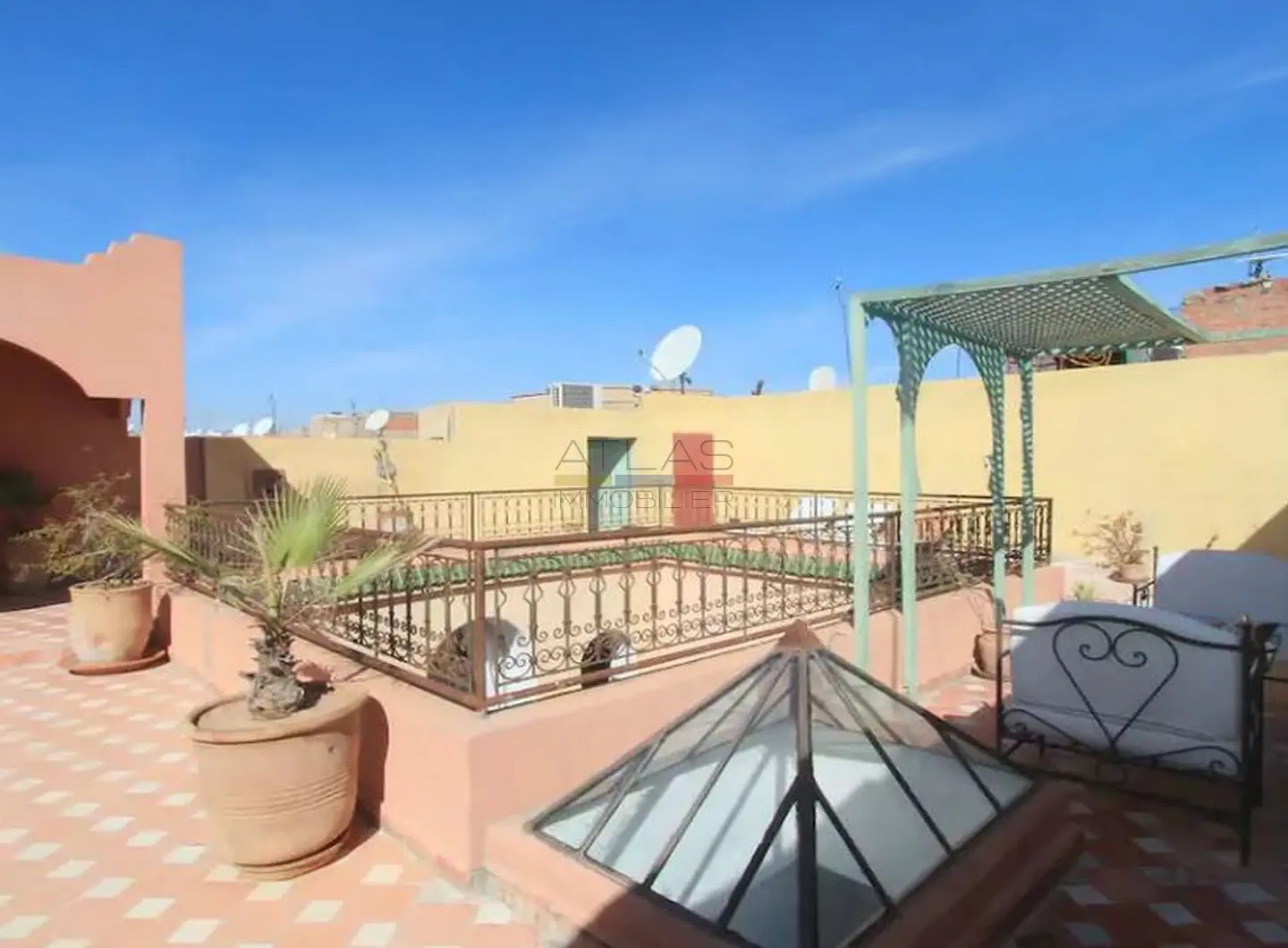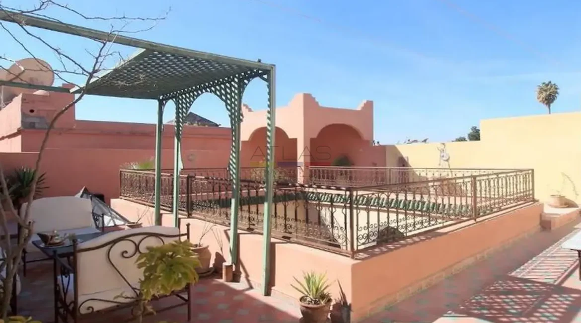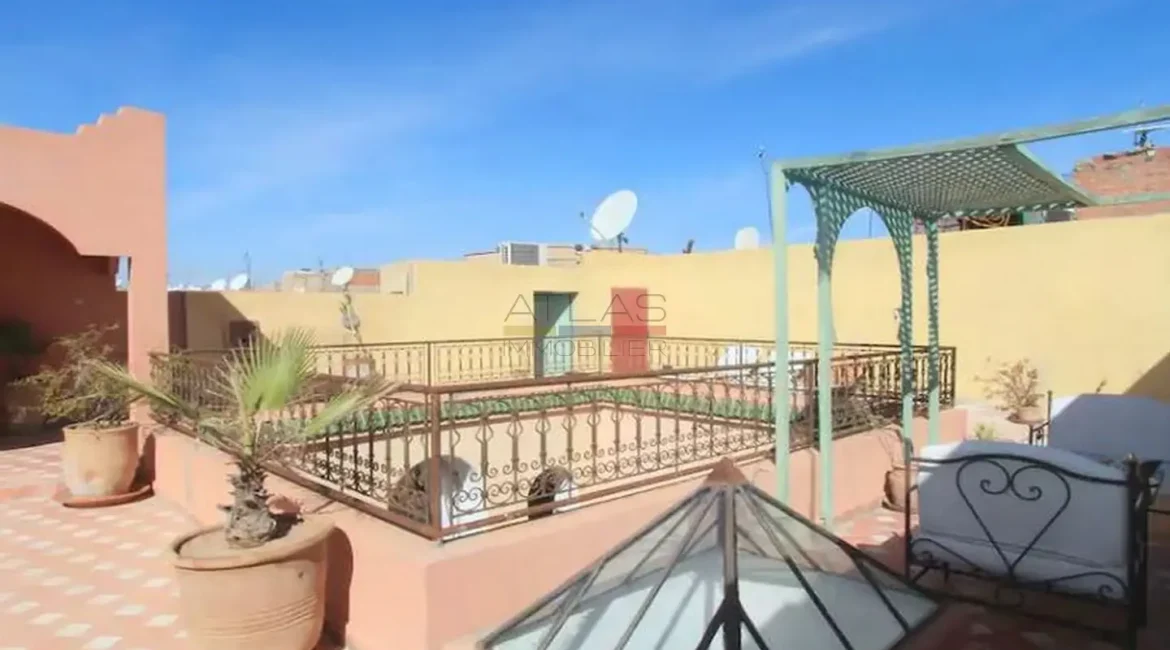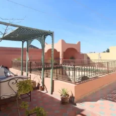 La terrasse propose un petit salon couvert, une pergola intime et un solarium permettant de profiter des douces soirées de Marrakech. Cet espace extérieur offre un véritable prolongement de vie, idéal pour se détendre en toute tranquillité.