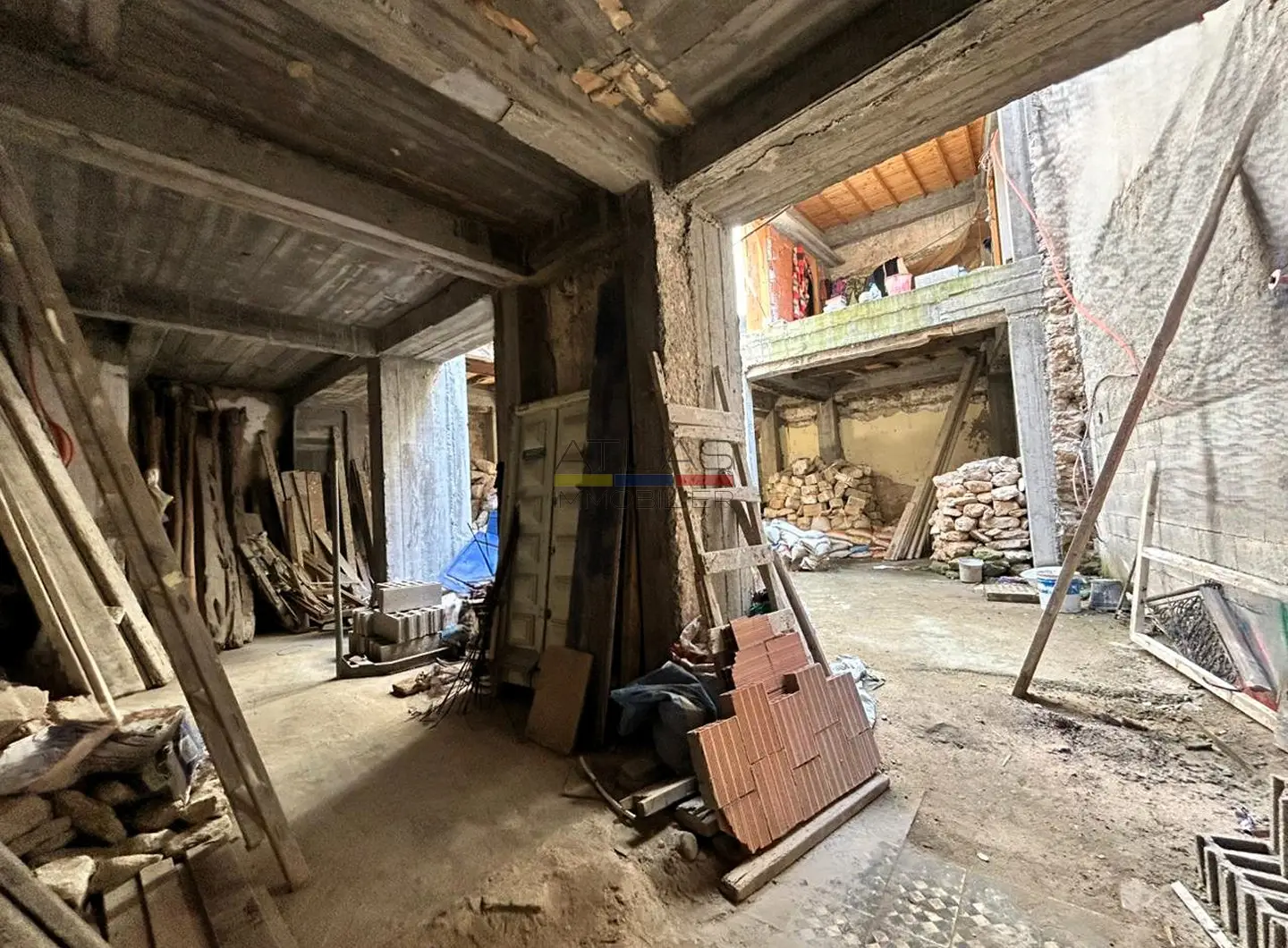 Le rez-de-chaussée comprend un espace salon, une cuisine, un espace réception, une chambre avec salle de douche et toilettes, ainsi qu’un WC indépendant. Cette organisation permet d’imaginer un espace d’accueil convivial, articulé autour d’un futur patio ou d’un salon élégant, parfaitement adapté à une exploitation en maison d’hôtes dans la médina d’Essaouira.
