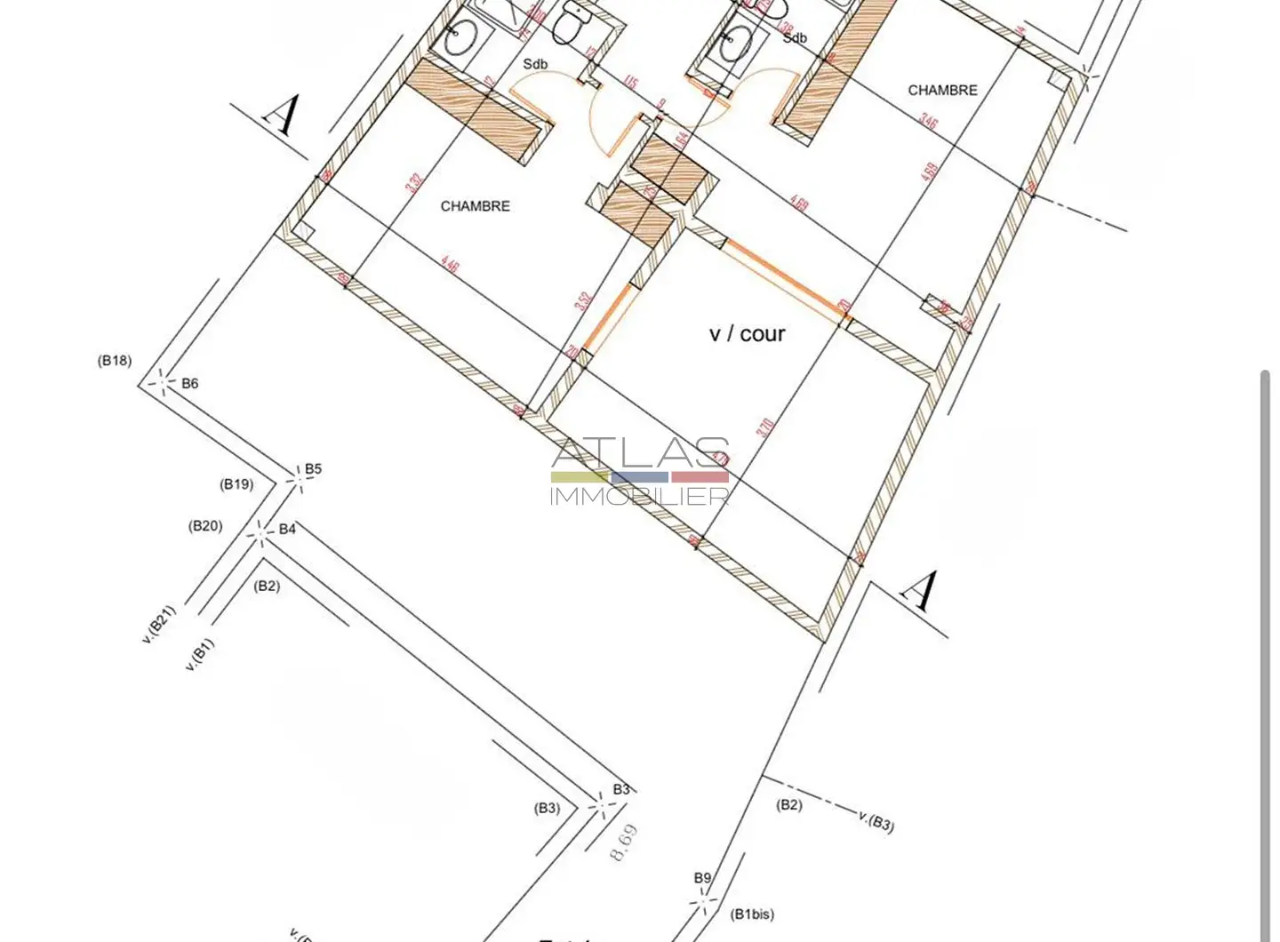Les premier et deuxième étages, d’environ 84 m² chacun, accueillent chacun deux chambres avec salle de douche et toilettes, soit un total de cinq chambres avec salles d’eau privatives. Cette configuration est particulièrement recherchée pour un projet de riad d’hôtes, offrant confort, intimité et cohérence d’exploitation.