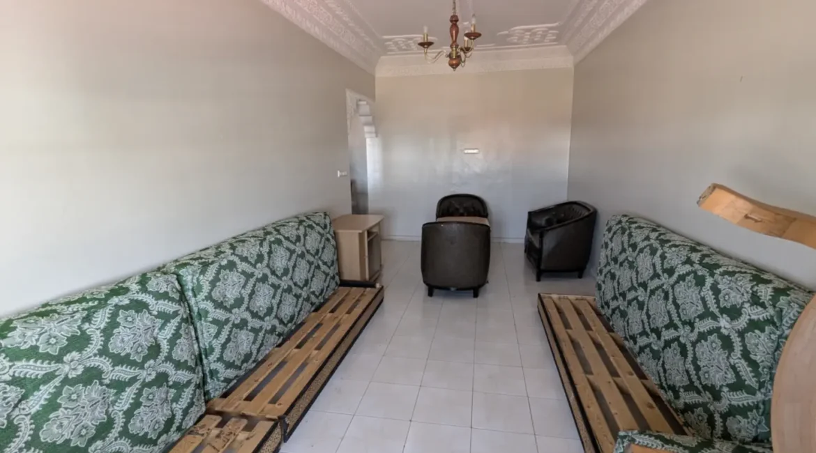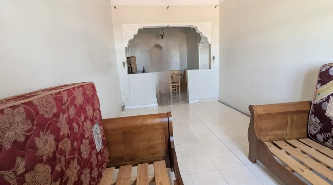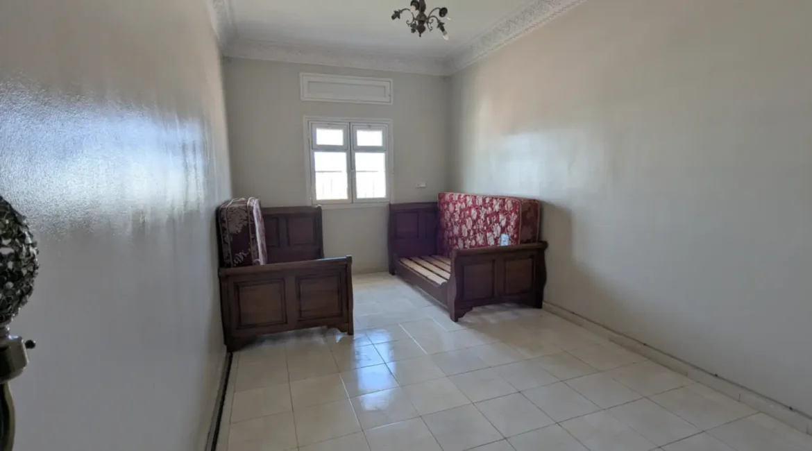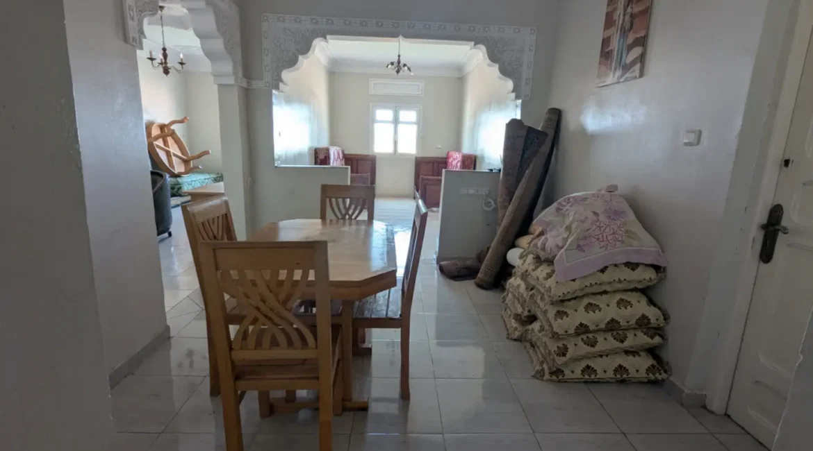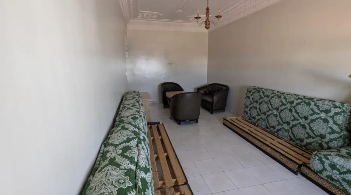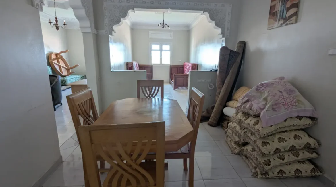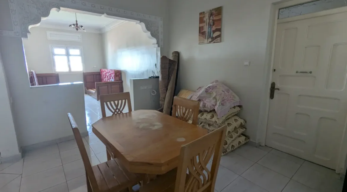 L’appartement comprend un hall d’entrée ouvrant sur une salle à manger et un salon lumineux, complétés par un grand salon marocain. Un hall de nuit dessert une grande chambre à coucher, une salle d’eau équipée d’une douche et de toilettes, ainsi qu’une cuisine récemment rénovée et parfaitement équipée.