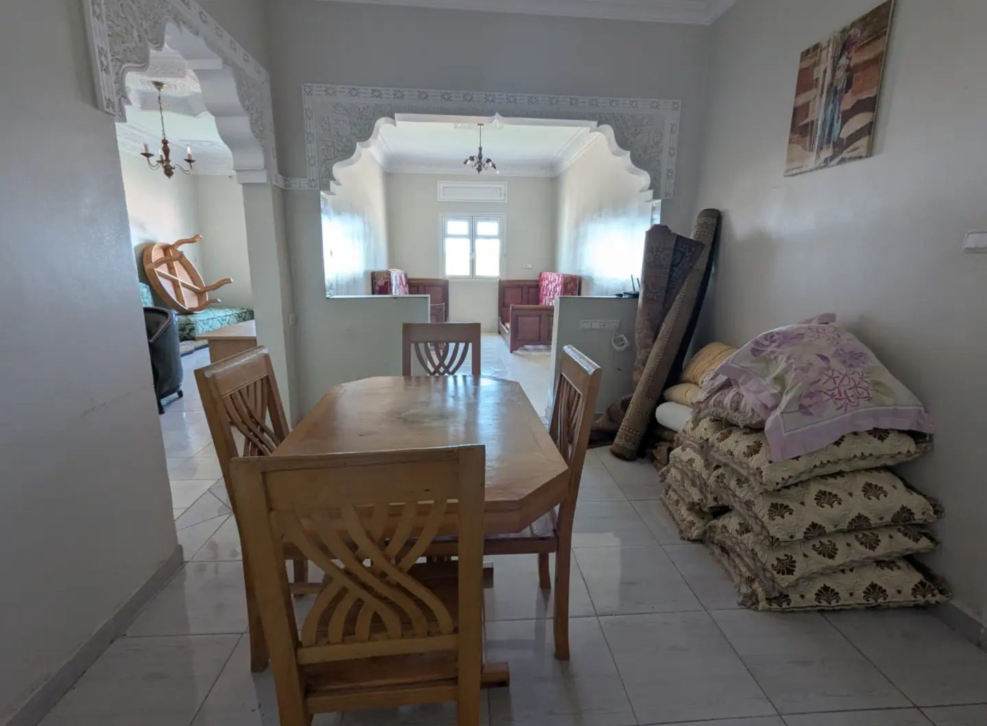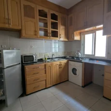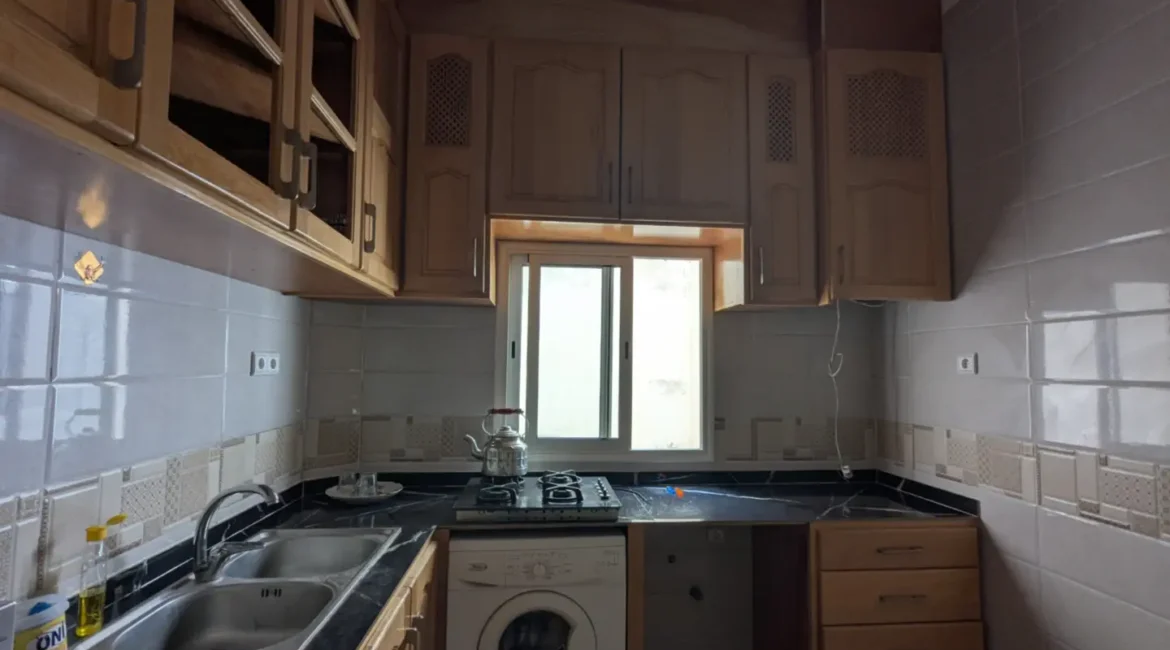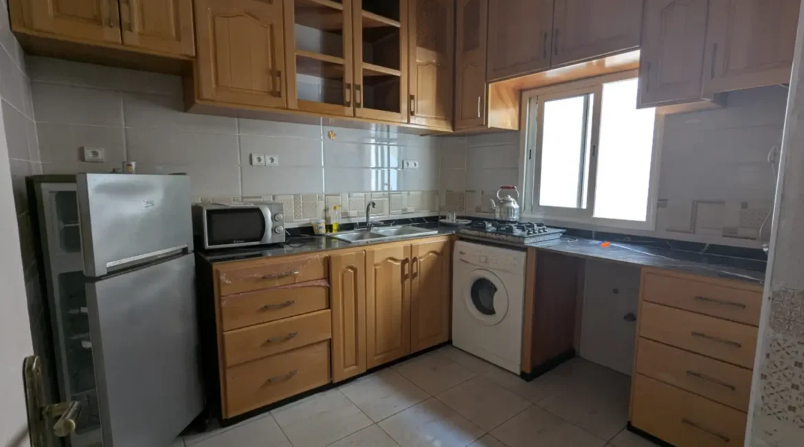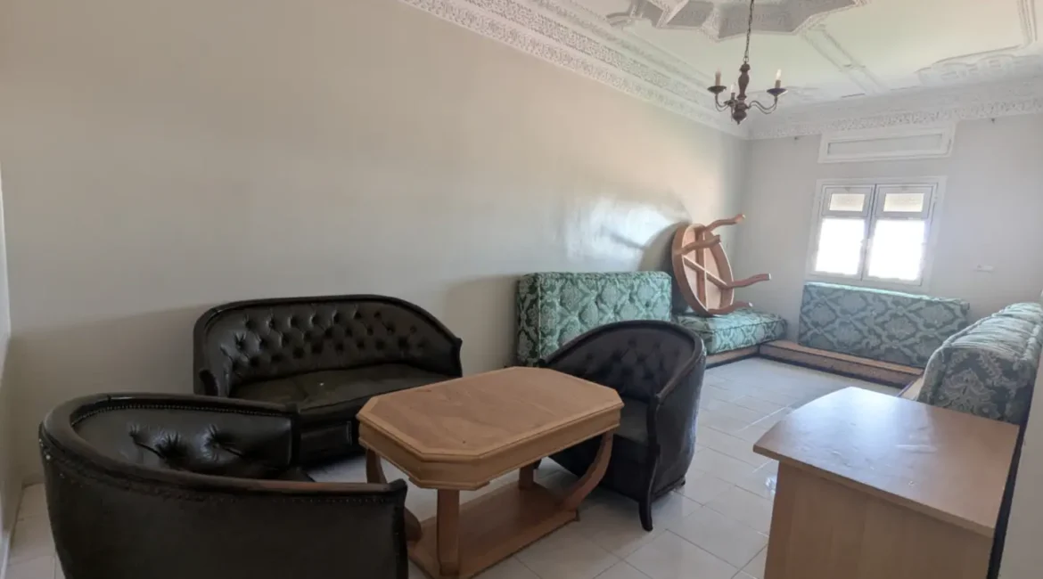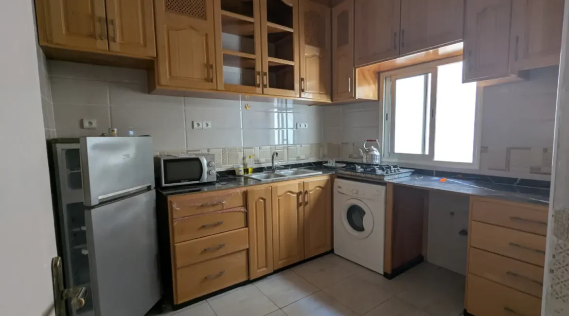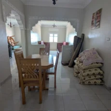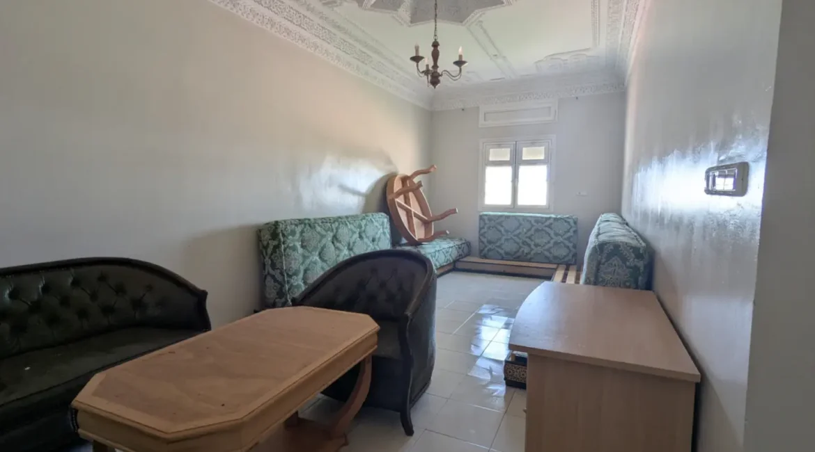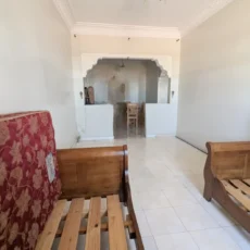 L’appartement comprend un hall d’entrée ouvrant sur une salle à manger et un salon lumineux, complétés par un grand salon marocain. Un hall de nuit dessert une grande chambre à coucher, une salle d’eau équipée d’une douche et de toilettes, ainsi qu’une cuisine récemment rénovée et parfaitement équipée.
