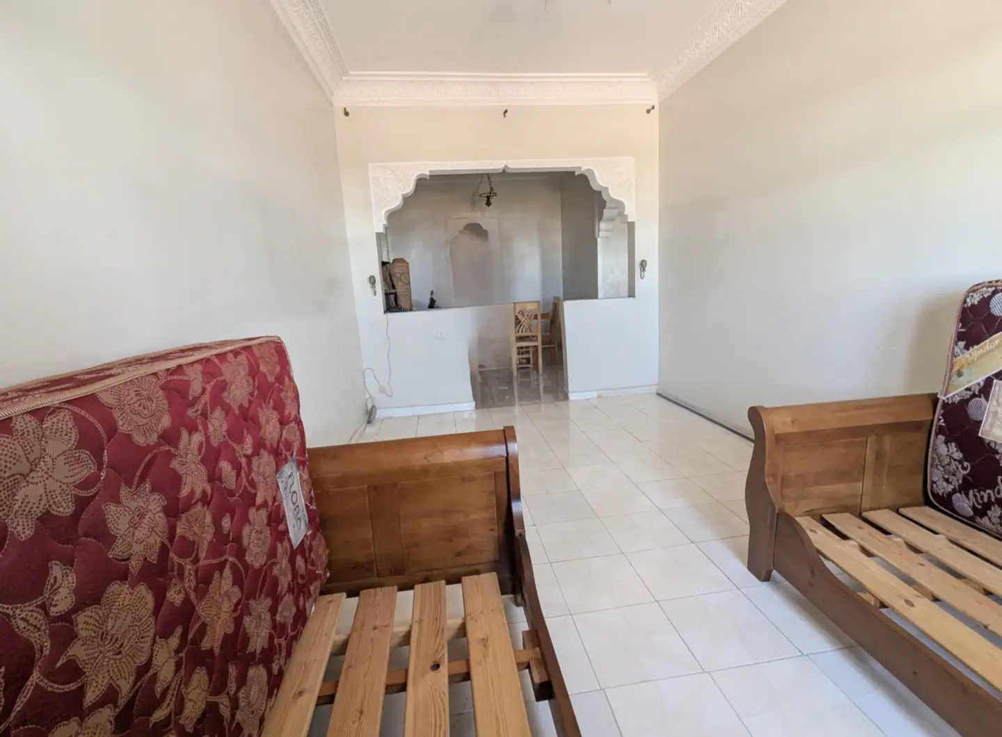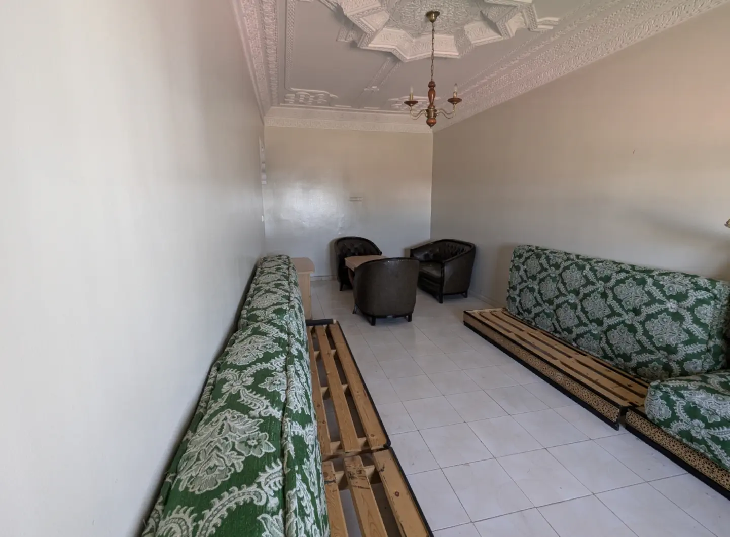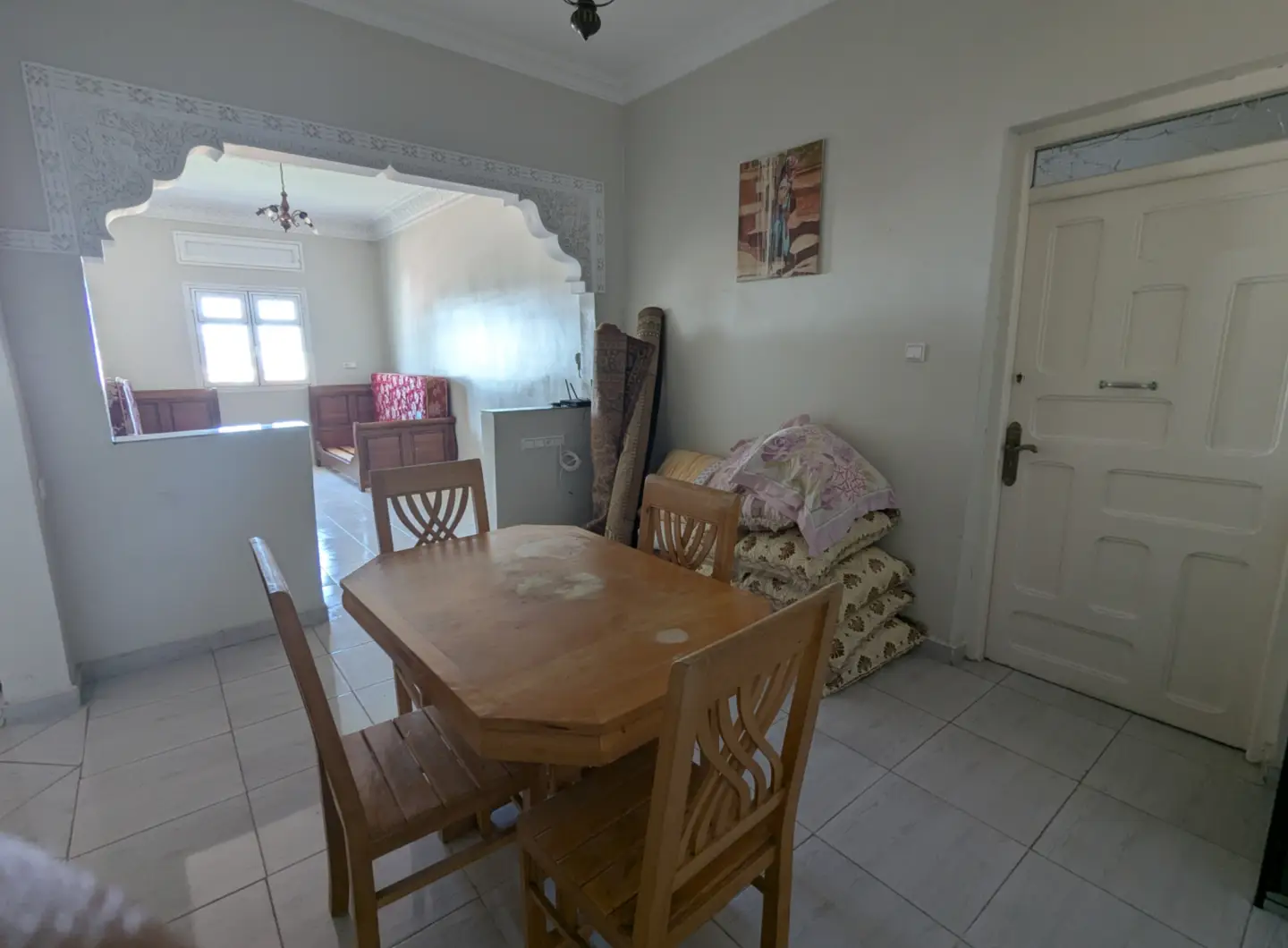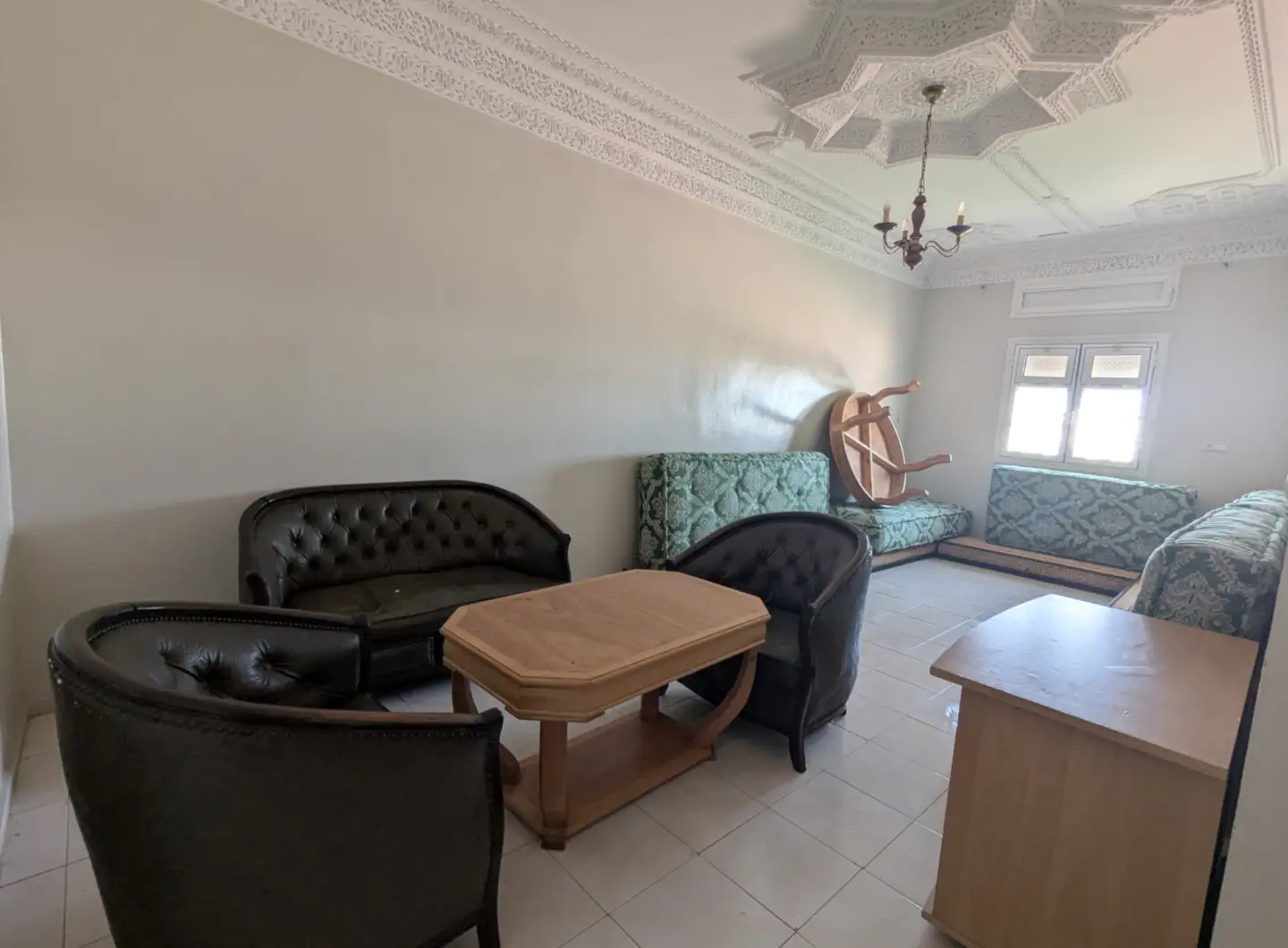 L’appartement comprend un hall d’entrée ouvrant sur une salle à manger et un salon lumineux, complétés par un grand salon marocain. Un hall de nuit dessert une grande chambre à coucher, une salle d’eau équipée d’une douche et de toilettes, ainsi qu’une cuisine récemment rénovée et parfaitement équipée.